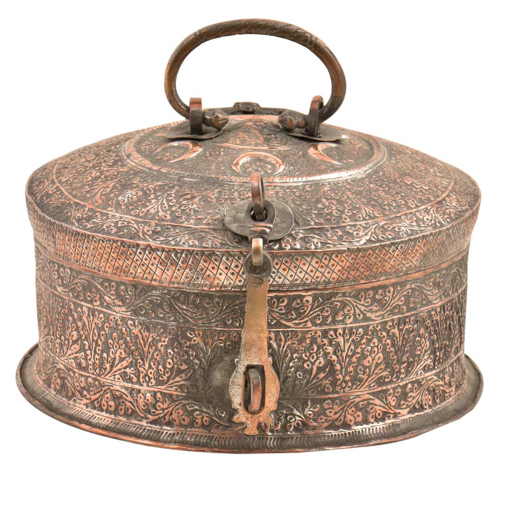A lovely Big Size Betel or Pandan Box with intricate work done on it . The Box contains a tray, three larger covered round containers, one smaller covered round container, two bowls with stands and two small plates (?). The copper is finely hammered in a detailed floral and vine pattern all throughout the pieces with the exception of the stands and two small plates. It is can also be used as a home décor piece and gift for relatives and friends. Used for storing betel leaf, betel nut, dry tobacco, lime, catchu, and saffron.