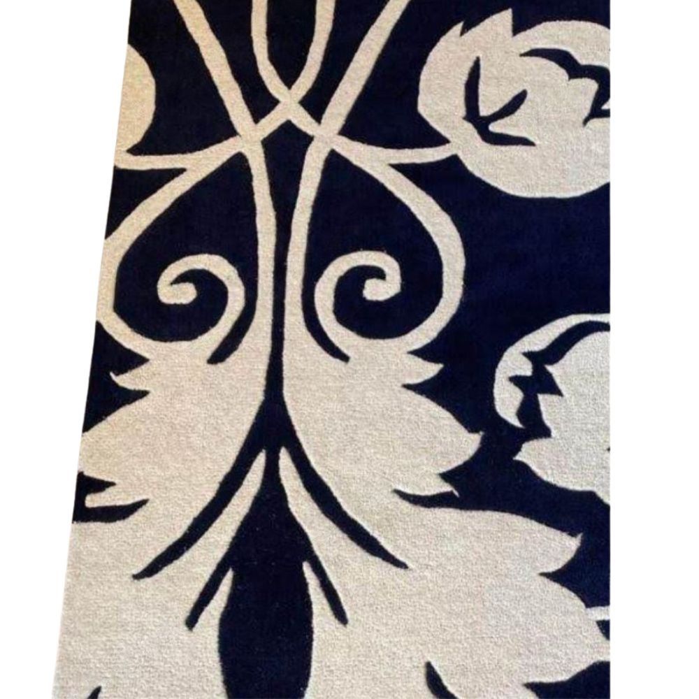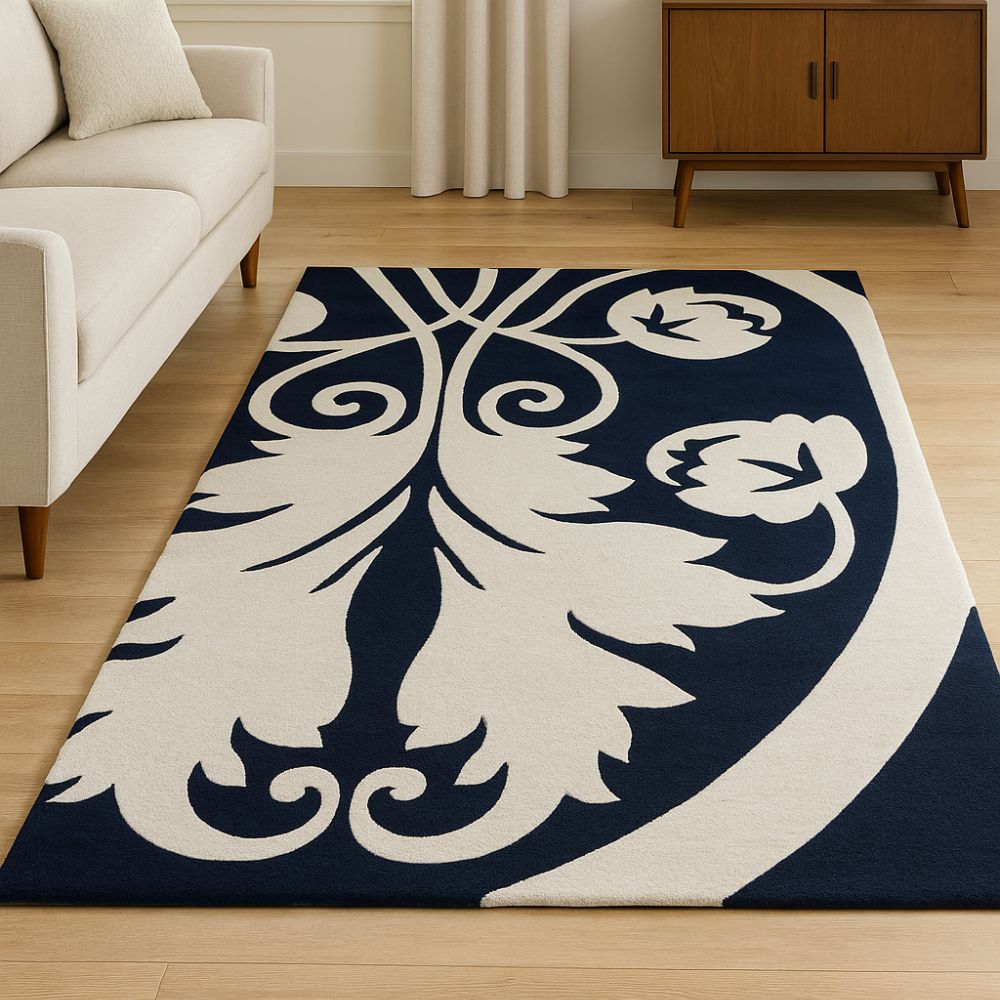 This hand-tufted wool rug brings a bold yet elegant presence to any interior. Featuring a striking navy blue base adorned with flowing ivory floral motifs, it seamlessly combines modern minimalism with timeless artistry.