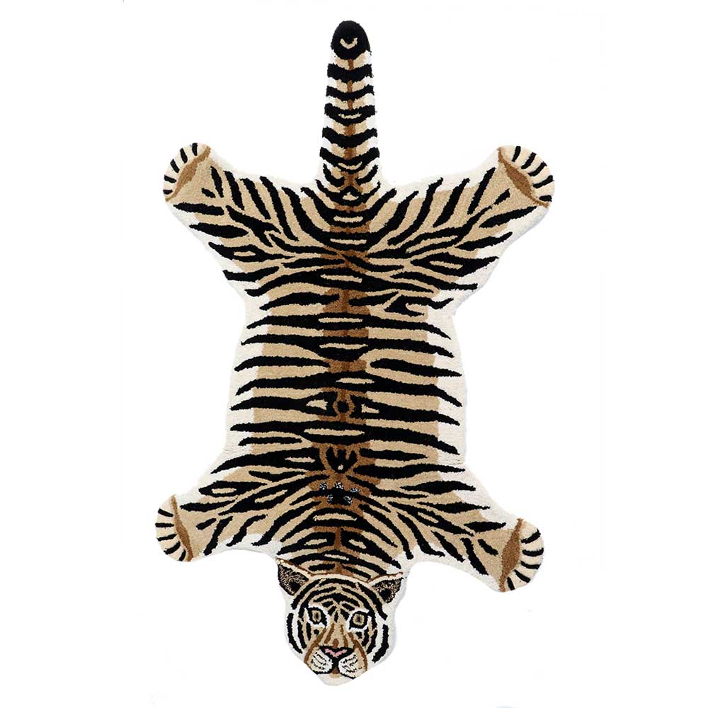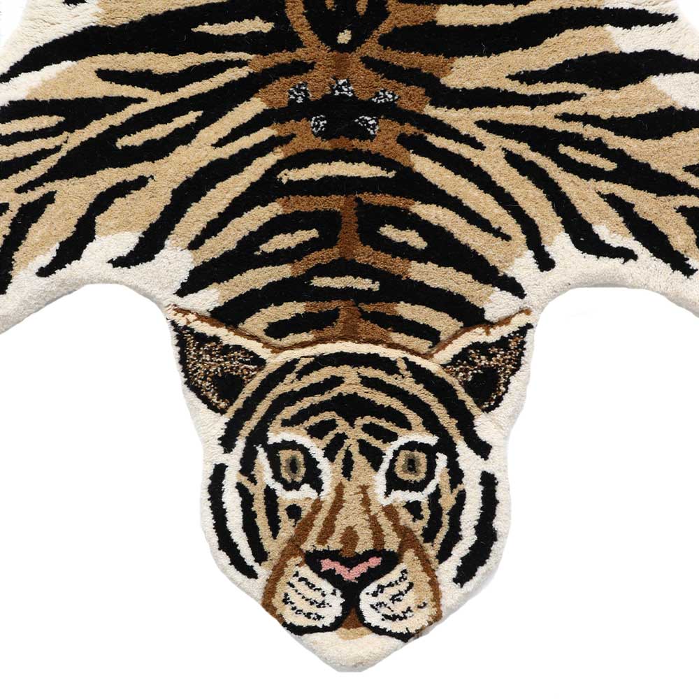 The Tiger rug animal art is a one-of-a-kind collection that will bring a smile to your face every time you see it. This animal rug has 100% wool and handcrafted in India. It has a cotton back. Used indoors for prayer, Basement, Family Room, Bedroom, Shower room, Caravan, Doorway, Foyer, Children's Bedroom, Kids Playroom, Nursery Room, Music school, Wall hanging, Dining Area, Reception Room, to cover Tables, Chairs, Sofa and Chests, Home Office/Study, Restaurant, Farmhouse, Laundry Room.