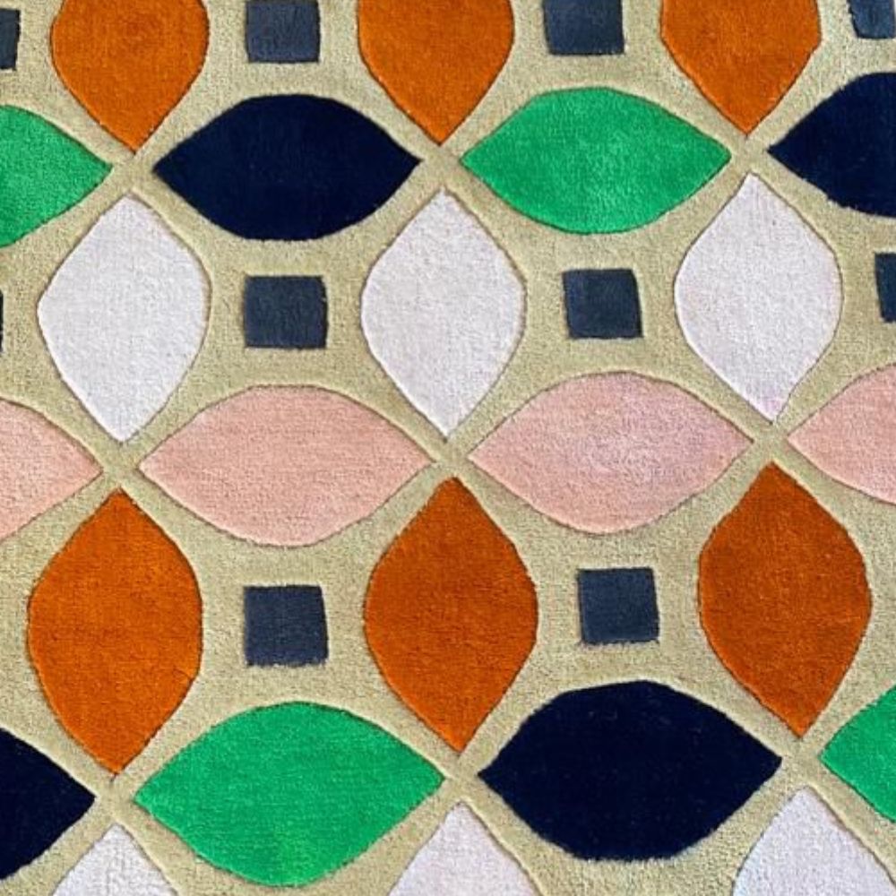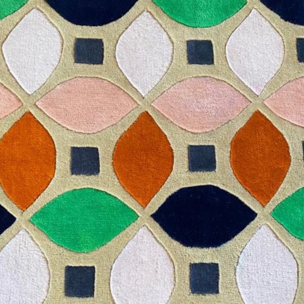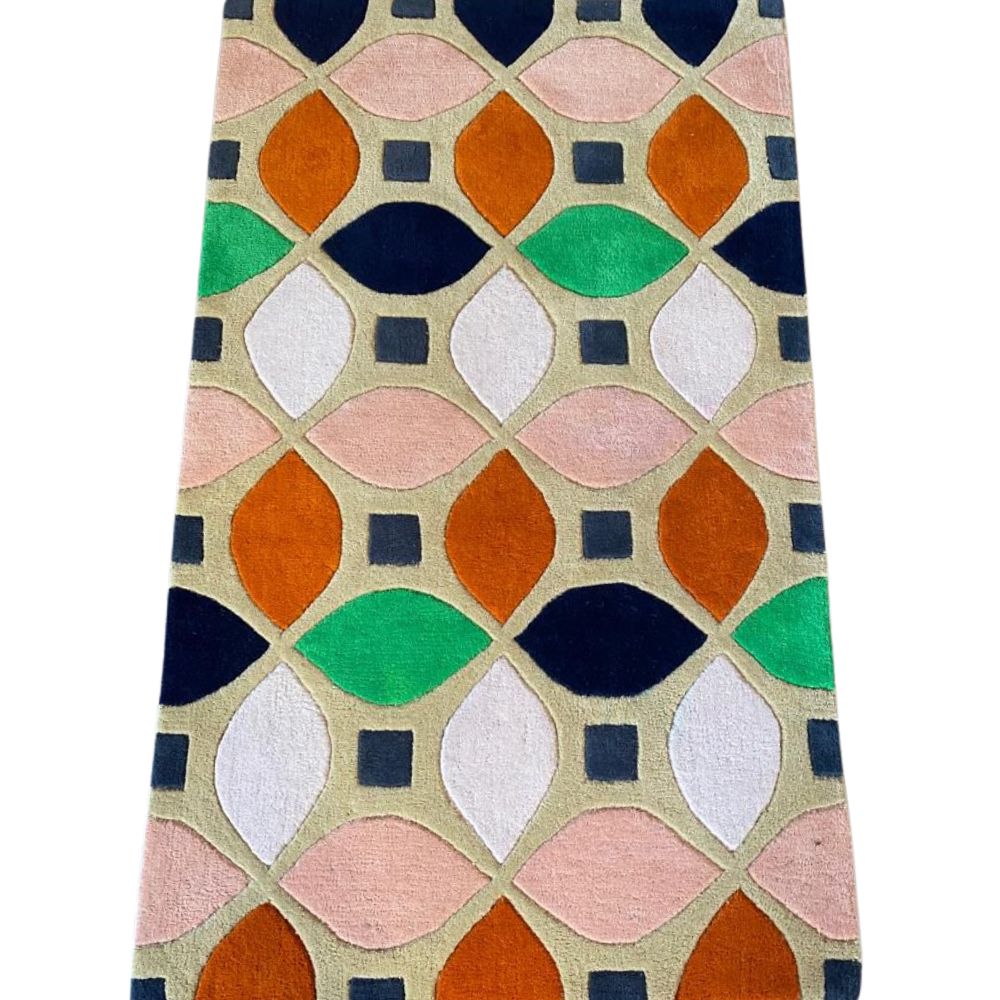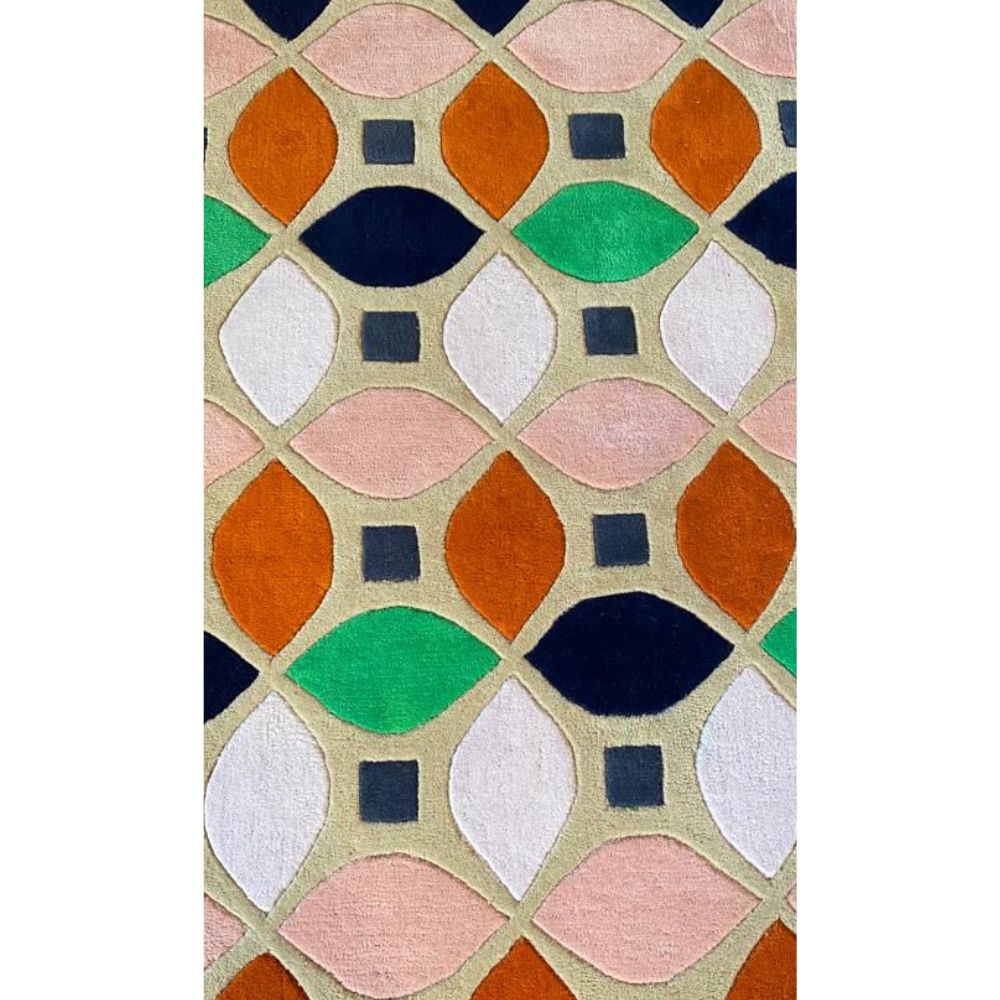 Its vibrant geometric pattern, inspired by retro mid-century aesthetics, adds instant character to any living space. Handcrafted by skilled artisans, this rug is not just a floor coveringits a work of art designed to elevate your interiors. Color Palette This rugs unique charm comes from its playful yet balanced mix of colors: Burnt Orange: Warm and earthy, adding vibrancy and energy. Soft Peach-Pink: Gentle, calming tones that soften the bold design. Emerald Green: Fresh, nature-inspired pops of color that stand out beautifully. Navy Blue: Deep and grounding, providing balance and structure. Light Beige Base: A warm neutral backdrop that ties all the colors together. Charcoal Gray Squares: Subtle details that enhance the geometric structure. Together, these shades create a retro-modern palette that is versatile enough for contemporary homes, eclectic interiors, or bold statement spaces. Design & Pattern Theme: Mid-century modern meets retro charm. Pattern: Geometric petal-like motifs arranged in symmetry, framed by small squares for contrast. Effect: Creates a lively yet structured lookboth playful and sophisticated. Versatility: Works well as a living room centerpiece, a bedroom accent rug, or a.