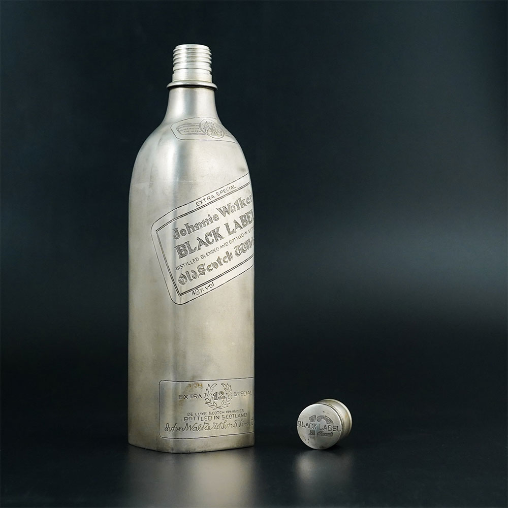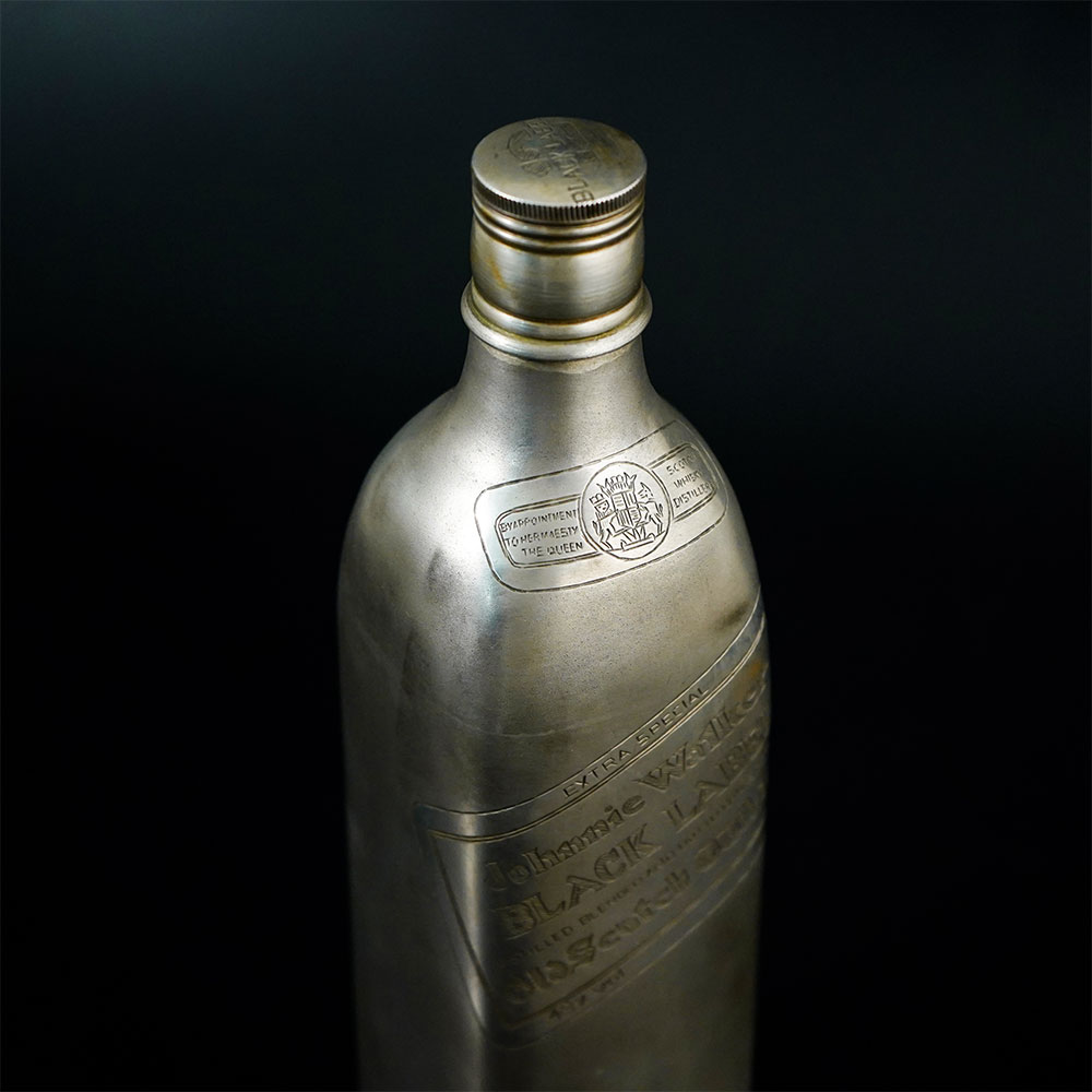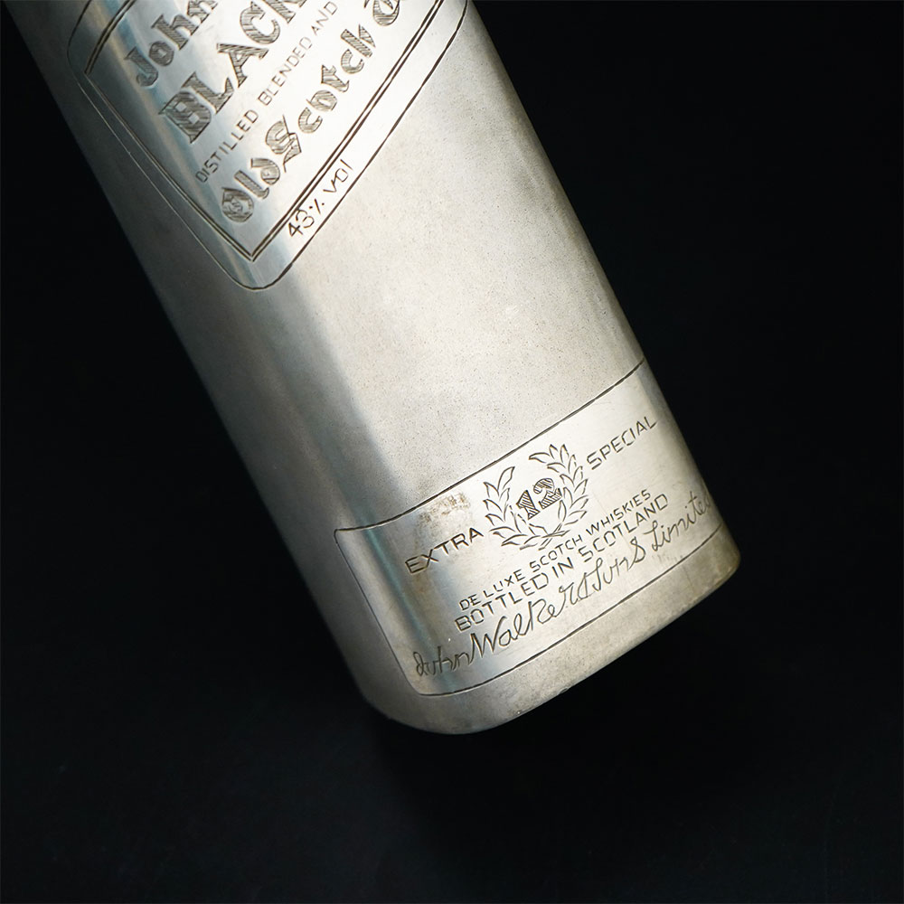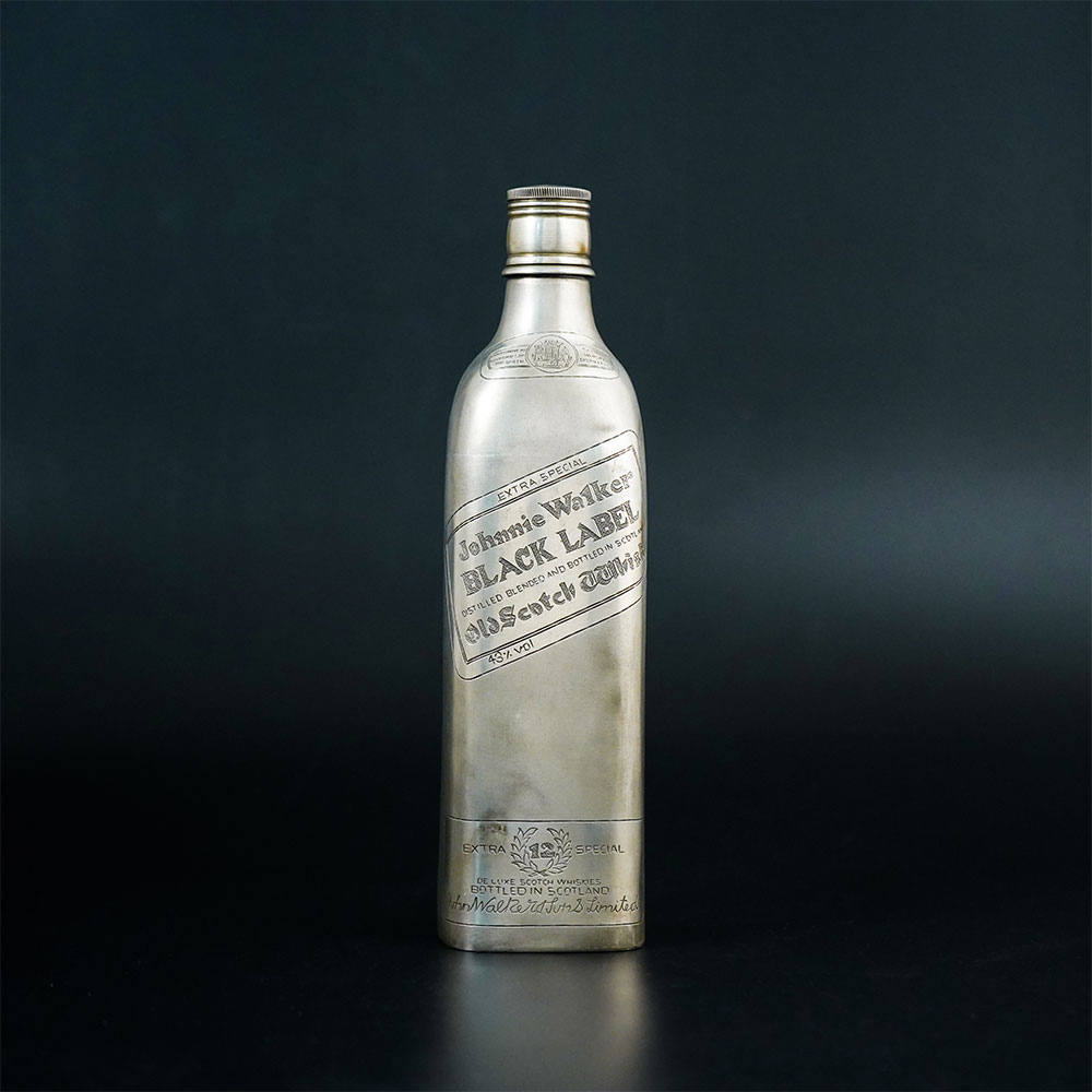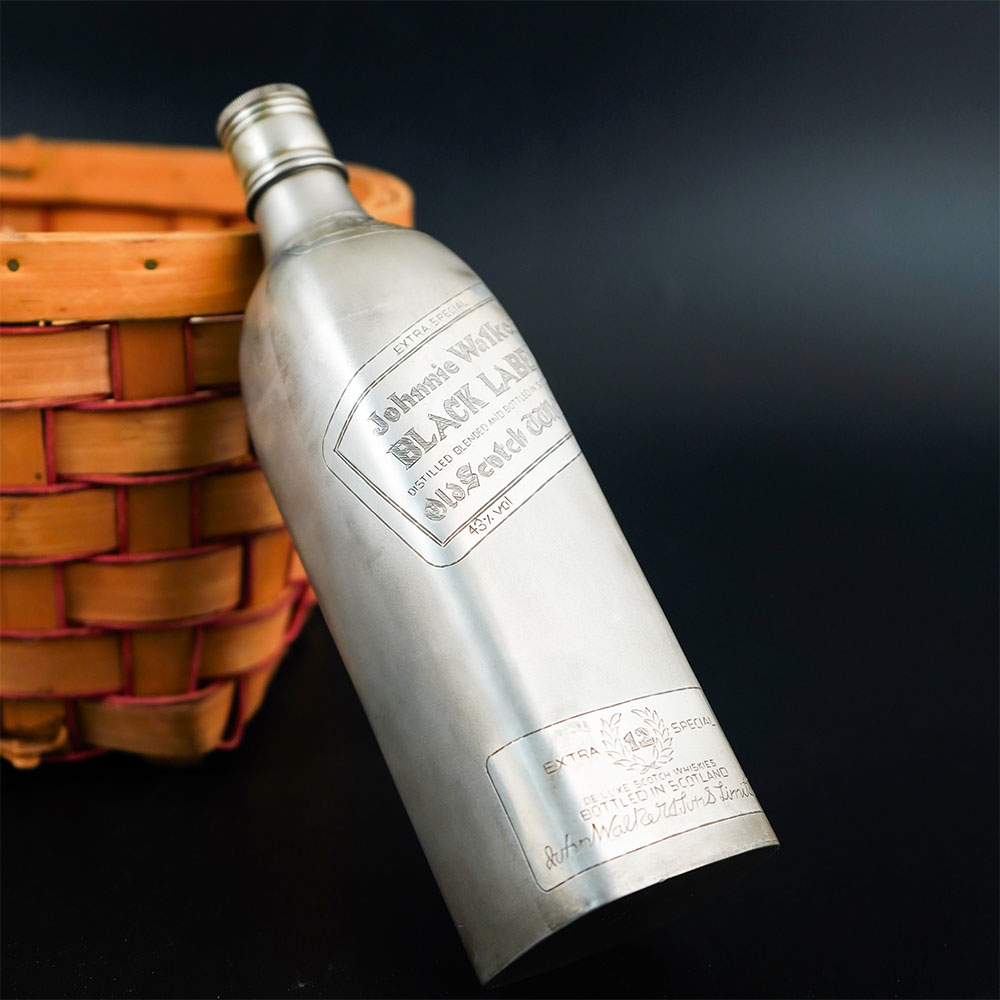 This striking handcrafted 92.5 sterling silver Black Label bottle is a distinctive decorative piece that combines luxury craftsmanship with iconic bottle-inspired design. Made from 92.5 sterling silver, the piece features a tall bottle silhouette with engraved label details that resemble the classic Black Label presentation, giving it a bold and recognizable aesthetic. The body of the bottle is crafted with a smooth metallic surface that highlights the brilliance of sterling silver while allowing the engraved typography and decorative label lines to stand out clearly. The detailing on the front of the bottle reflects the familiar angled label style associated with the Black Label design, adding character and authenticity to the piece. The slender neck and fitted cap complete the elegant bottle profile, creating a refined form that feels both modern and timeless. Its polished silver finish reflects surrounding light beautifully, making the object visually striking whether placed on a bar counter, display shelf, or within a curated silver collection. Crafted entirely from 92.5 sterling silver, the piece demonstrates skilled metalwork and careful finishing. It can be displayed as a decorative collectible, luxury bar accent, or statement object in sophisticated interiors.