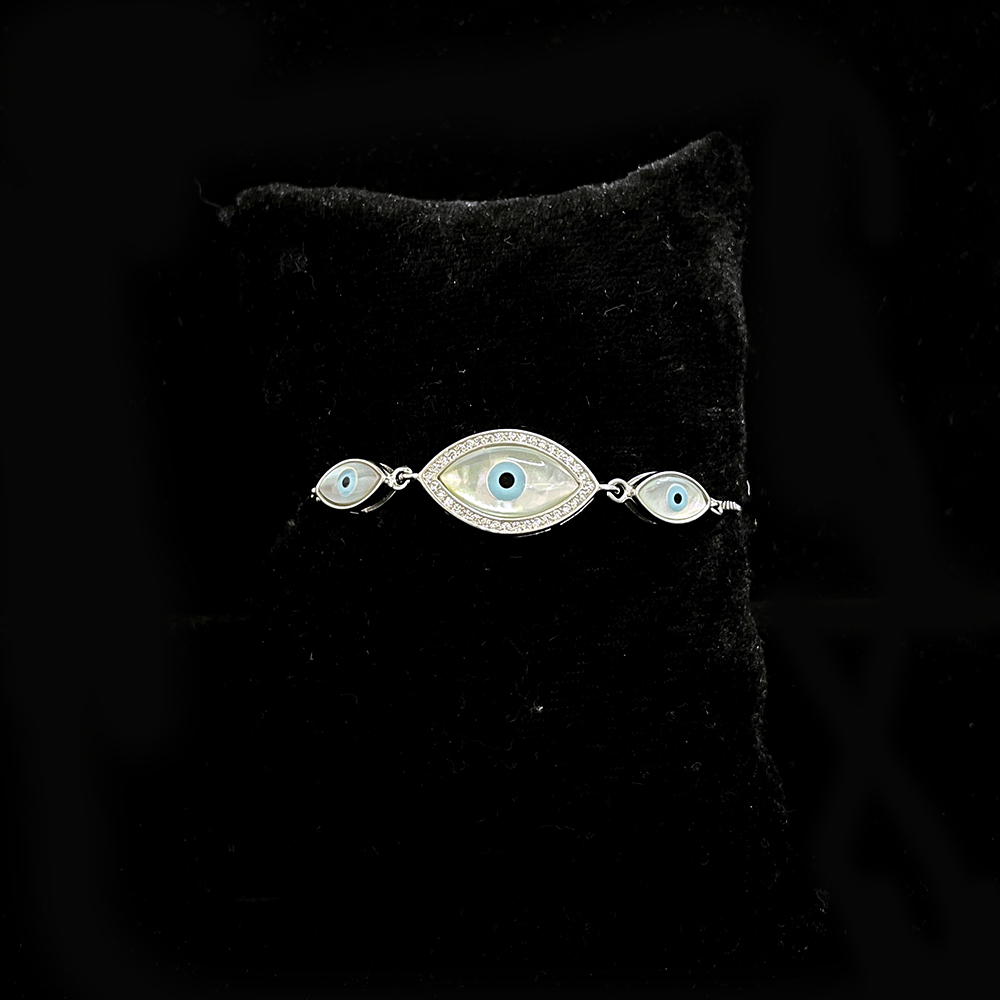 The bracelet presents a central elongated evil eye flanked by two smaller matching motifs, forming a harmonious protective sequence. This composition emphasizes balance and continuity while keeping the design elegant and composed.