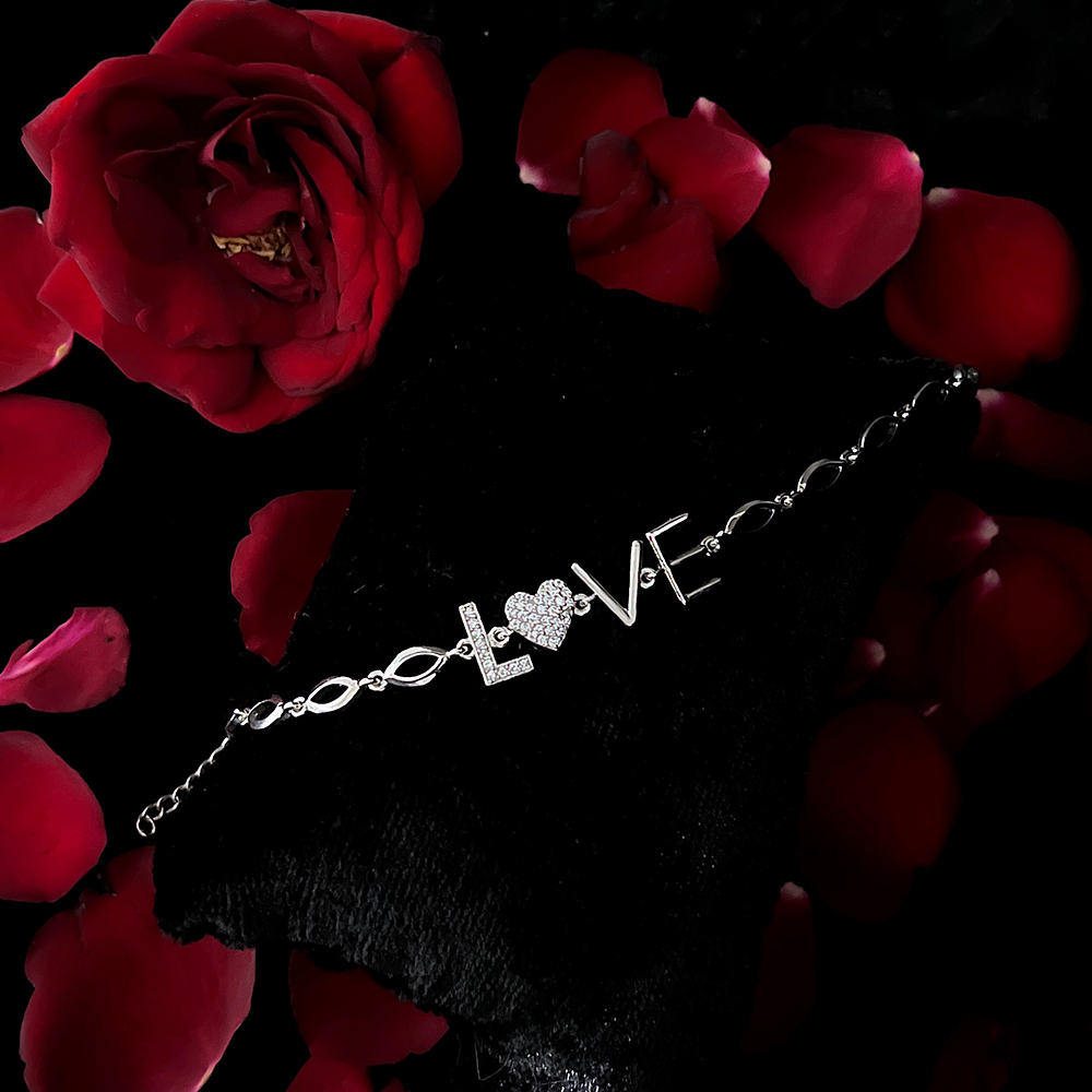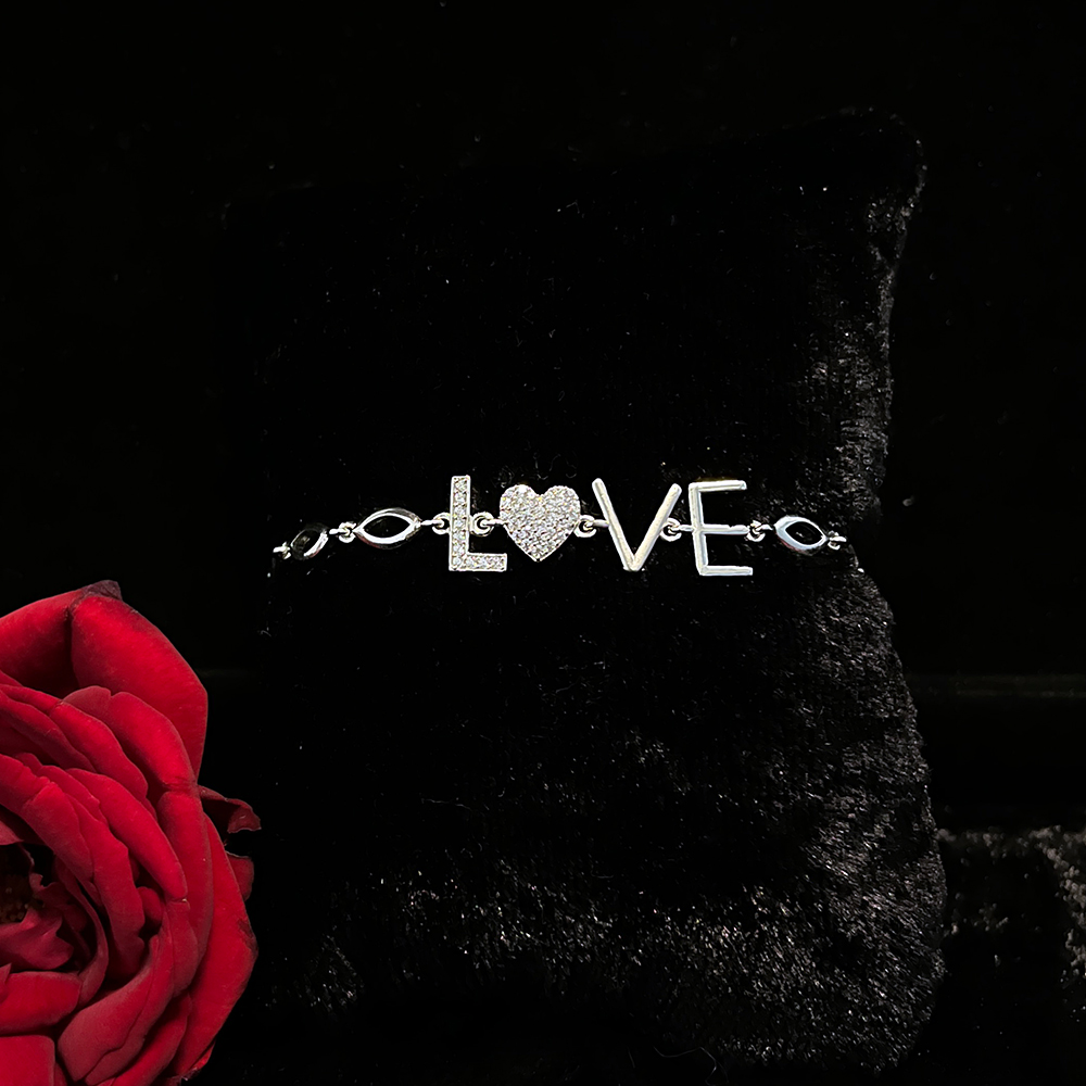 The bracelet features a clean typographic LOVE motif where each letter is individually defined, with the heart element acting as the emotional focal point. The layout ensures visual symmetry while remaining lightweight on the wrist.