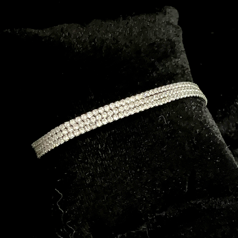 This triple layer tennis bracelet is crafted in 925 sterling silver and plated. Set with AAA graded CZ stones, the bracelet offers a uniform sparkle across all three rows while maintaining a lightweight and adjustable structure. Designed for elegance without excess, it suits both everyday styling and occasion wear. Packed and quality checked by Indianshelf. Triple Layer Stone Aligned Bracelet Design The bracelet features three parallel rows of precisely set CZ stones that create depth and visual continuity. The layered format enhances brilliance while preserving a clean and balanced wrist profile. Three aligned rows for enhanced presence AAA graded CZ stones for consistent clarity Adjustable structure for comfortable fit Material Composition and Certification Origin India. Safely packed and quality checked by Indianshelf Made using 925 sterling silver Hallmarked and certified S925 by BIS Hypoallergenic and skin friendly Entirely handmade no machines used Styling and Gifting Applications Suitable for formal events and celebrations Elegant daily wear bracelet with layered detail Ideal gifting option for birthdays anniversaries and festive occasions Appropriate for boutique and curated jewellery collections Care and Longevity Guidance Store the bracelet in the provided pouch when not in use. Avoid exposure to water perfumes and harsh chemicals. Clean gently with a soft microfiber cloth to preserve the stone setting and surface finish. Product Related Questions Is the bracelet adjustable in size Yes the bracelet is designed with an adjustable mechanism for flexible wrist fitting. What stones are used in this bracelet The bracelet is set with AAA graded cubic zirconia stones. What items are included in the box The package includes the bracelet a reusable pouch and an authenticity certificate. Artisan Made Quality Statement Each bracelet is shaped and assembled by skilled artisans using traditional techniques. Handcrafted production ensures attention to alignment finish and long term wear comfort.