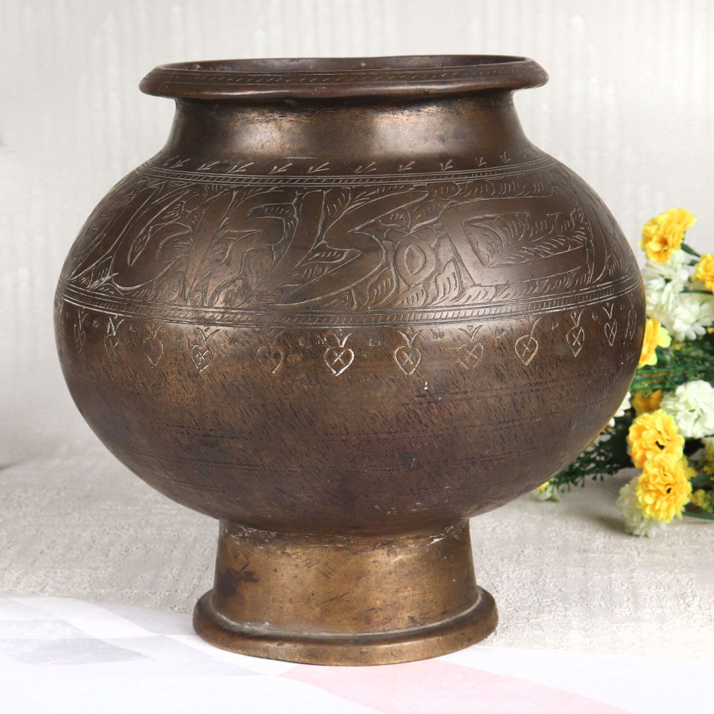 Buy a vintage brass cooking pot online that is a true testament to the craftsmanship of highly talented Indian craftsmen from Gujarat. Crafted with precision and care, this cooking pot boasts intricate engravings that tell a story of bygone eras, making it a stunning piece of art in antique brown finish. Fashioned from high-quality brass, this pot exhibits remarkable durability and a rich, lustrous sheen that adds an aura of opulence to any setting. While it may have originally been intended for culinary pursuits, we recommend reserving it for decoration purposes only, given its vintage nature. This versatile piece finds its place in a variety of settings, be it at home, office, restaurant, hotel, cafe, or shop. It serves splendidly as a striking flower pot, adding a touch of regal charm to your space. For collectors and enthusiasts, it's an excellent addition to your vintage collection or an enchanting exhibit piece for showcasing your appreciation for history and art. Moreover, this brass pot makes for an exceptional gift, perfect for presenting to your family, friends or relatives on special, festive, or auspicious occasions.