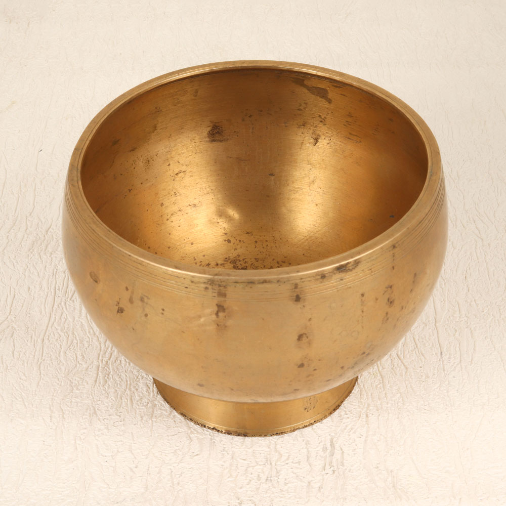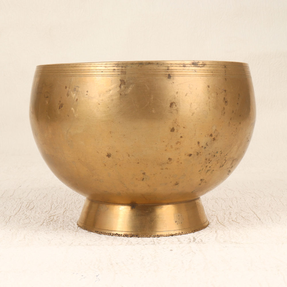 Experience the transformative power of sound with this antique Tibetan singing bowl. Handcrafted from bell metal using traditional techniques, this vintage bowl produces deep, meditative tones designed to relax the mind and body. Unlock a deeper meditative state with the transcendent sounds of this singing bowl. Gently tapping the bowl with a mallet creates a peaceful, ringing tone that promotes relaxation. The vibrations are thought to calm the nervous system, relieve tension and evoke a sense of inner stillness. Add an authentic ritual to your wellness routine with this singing bowl passed down through generations in Tibetan culture. Let the hypnotic tones open your chakras, enhance your focus and transport you to a serene state of being. A meaningful way to infuse your practice with the serenity of ancient traditions.