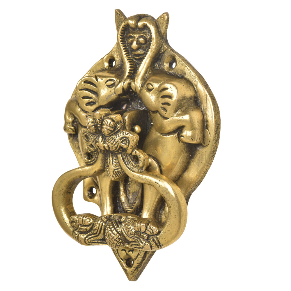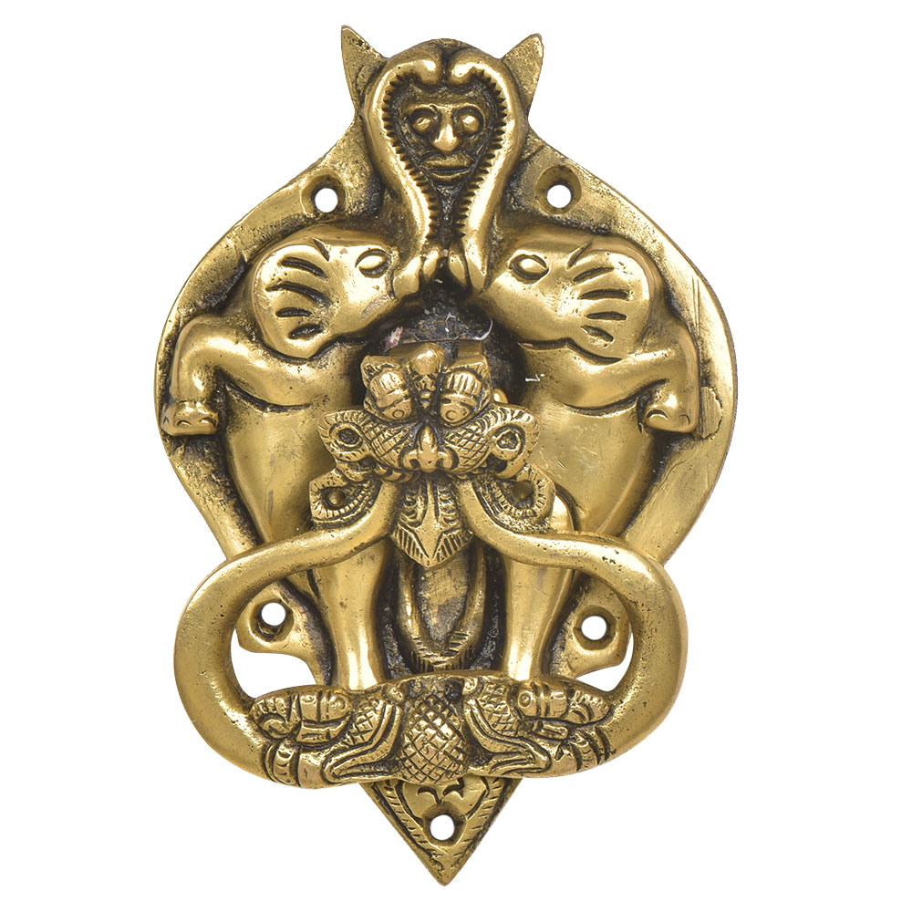 A very solid looking brass door knocker made by expert artisans with the demon face on the top with two elephant on both the sides and the door knocker attached to the dragon face in the centre of door knocker on a broad strike plate .Elegant home decor product.