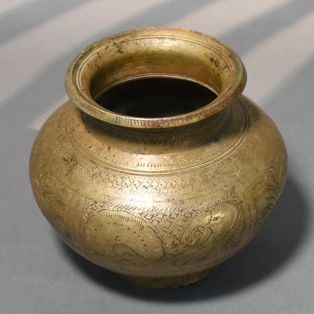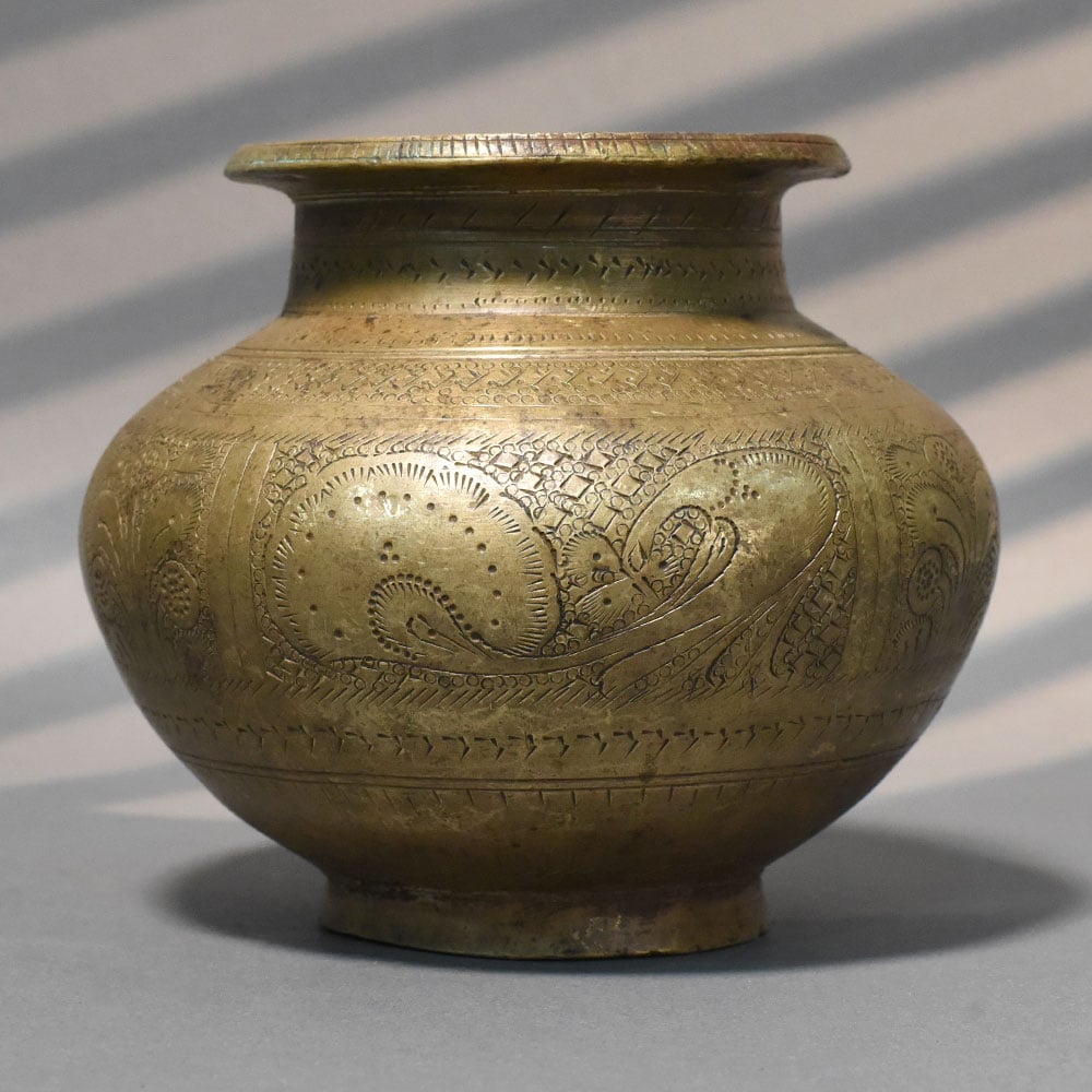- Handcrafted solid brass kalash with engraved detailing