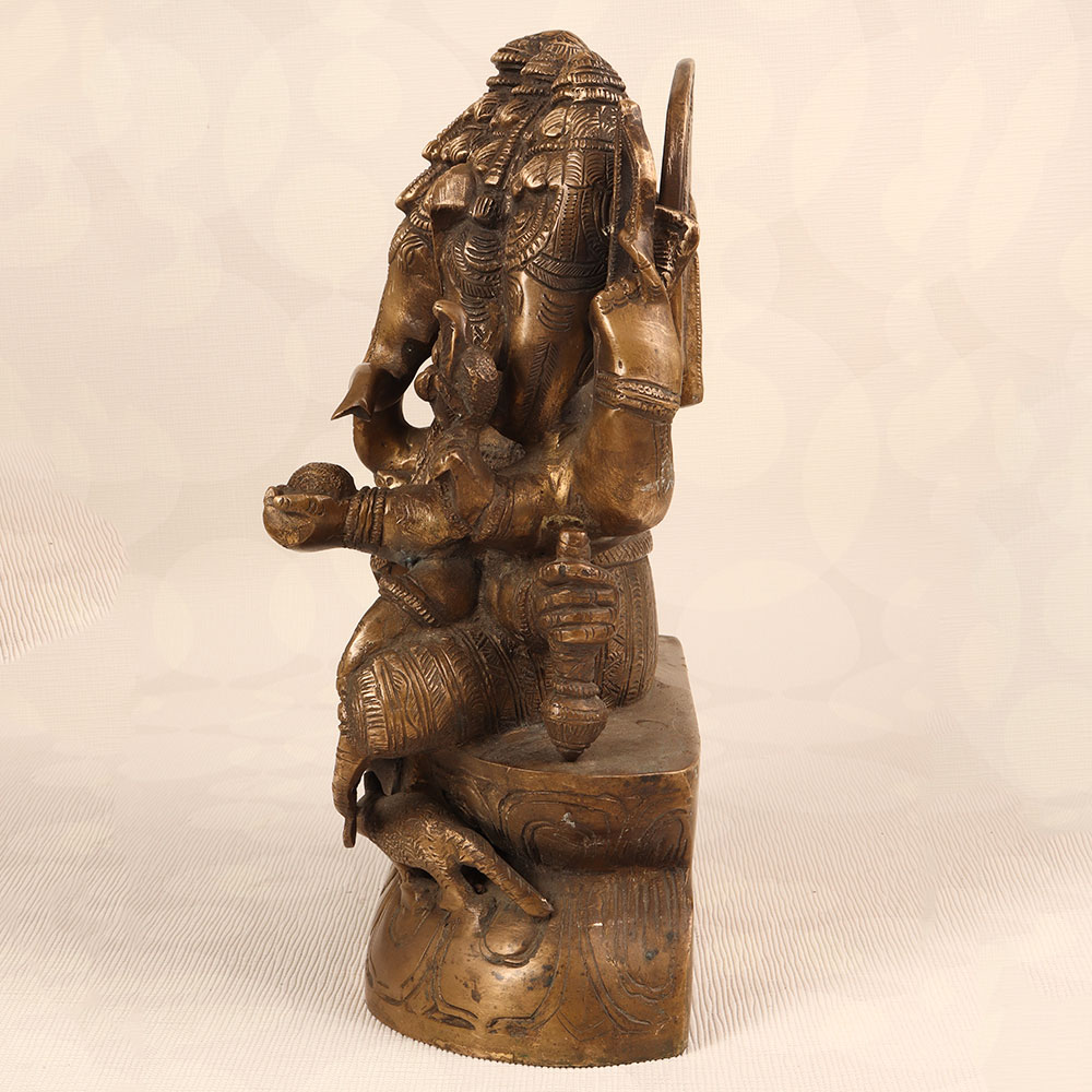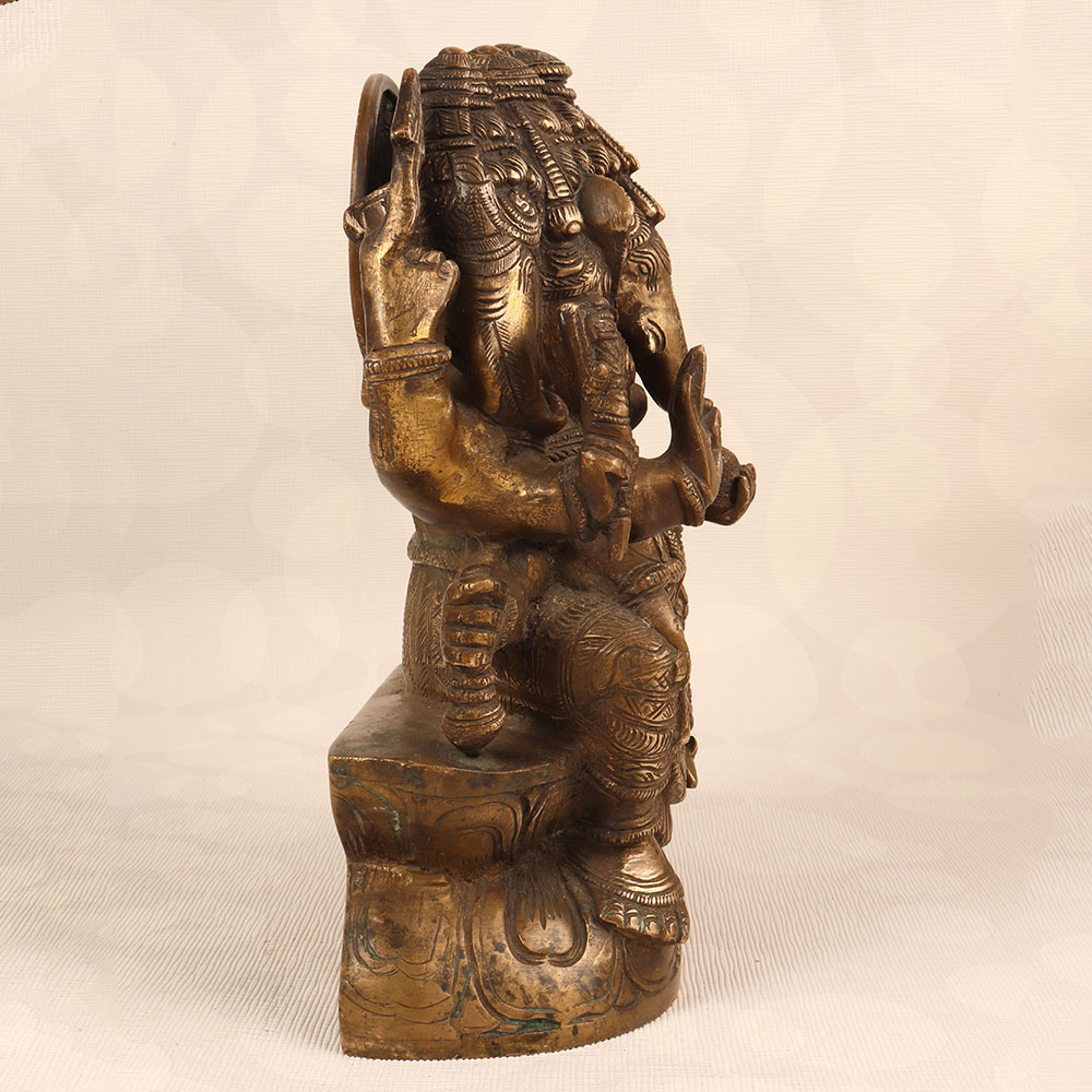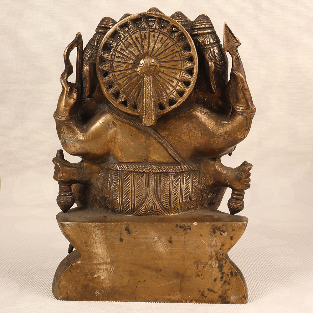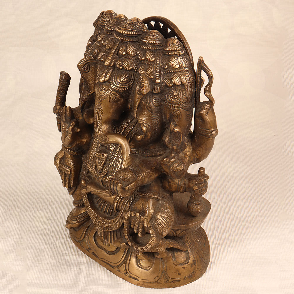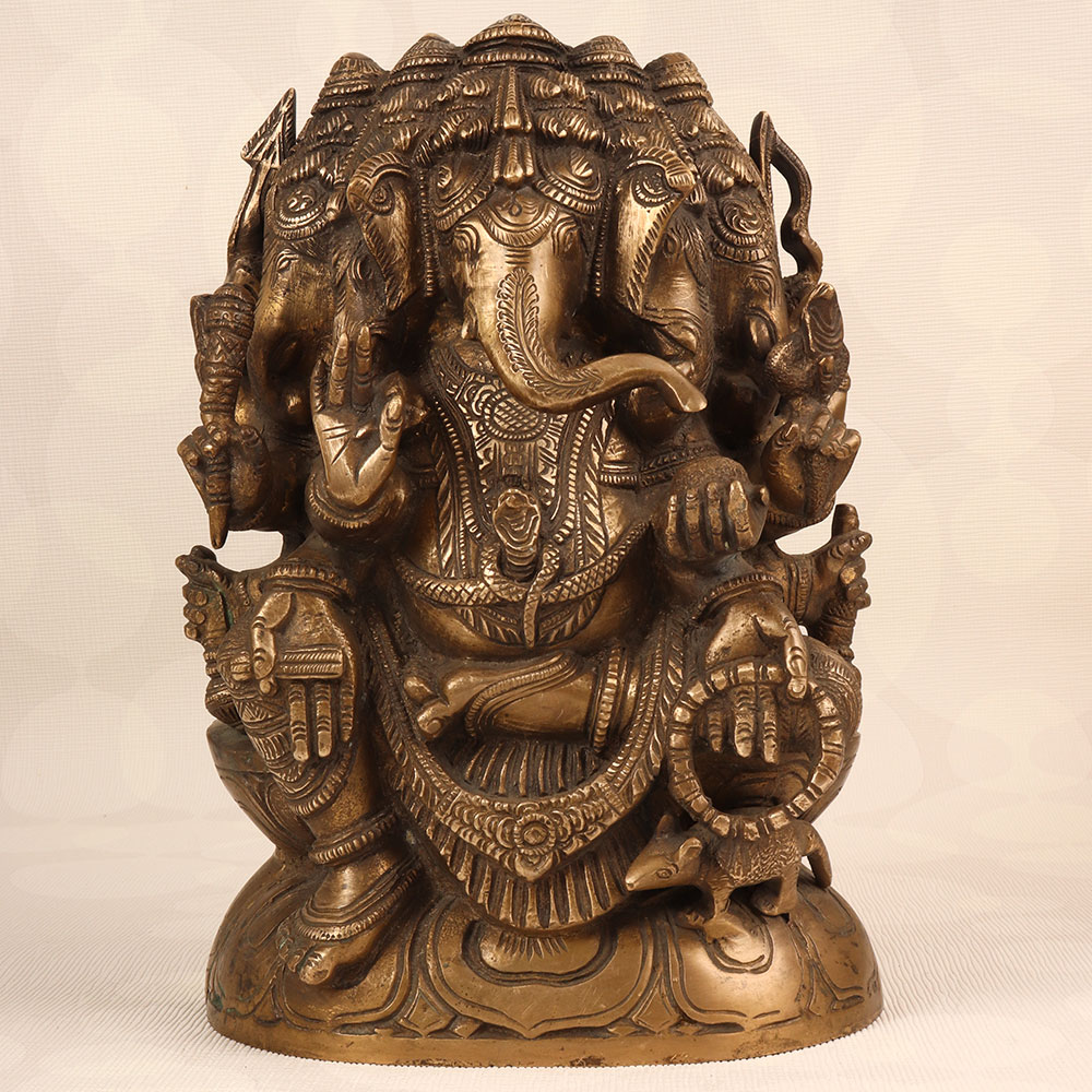 Decorate your space with the timeless charm of our Vintage Brass Lord Ganesha Statue. Crafted by highly talented Indian artisans, this exquisite piece features the iconic deity with five heads, showcasing a divine representation of Lord Ganesha. The statue boasts an antique brown finish, adding a touch of antiquity and sophistication to any setting. Handmade with precision from high-quality brass, this statue radiates an aura of authenticity and cultural richness. Perfect for adorning your home, office, restaurant, hotel, or cafe prayer room, it serves as a symbol of prosperity, wisdom, and auspicious beginnings. Enhance your vintage collection with this unique masterpiece that seamlessly blends traditional craftsmanship with artistic elegance. The Vintage Brass Lord Ganesha Statue also makes for a thoughtful and meaningful gift for your family, friends or relatives on special, festive, or auspicious occasions, conveying blessings and positive energy to their lives.