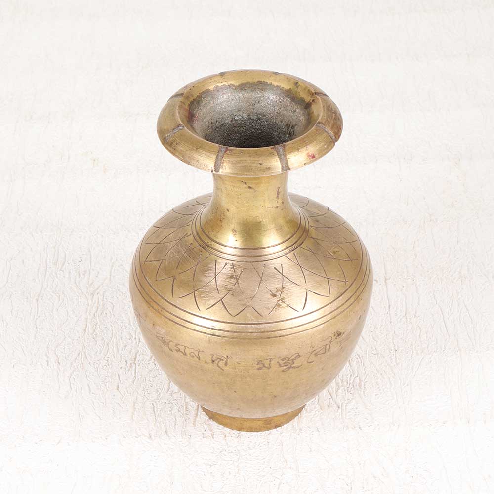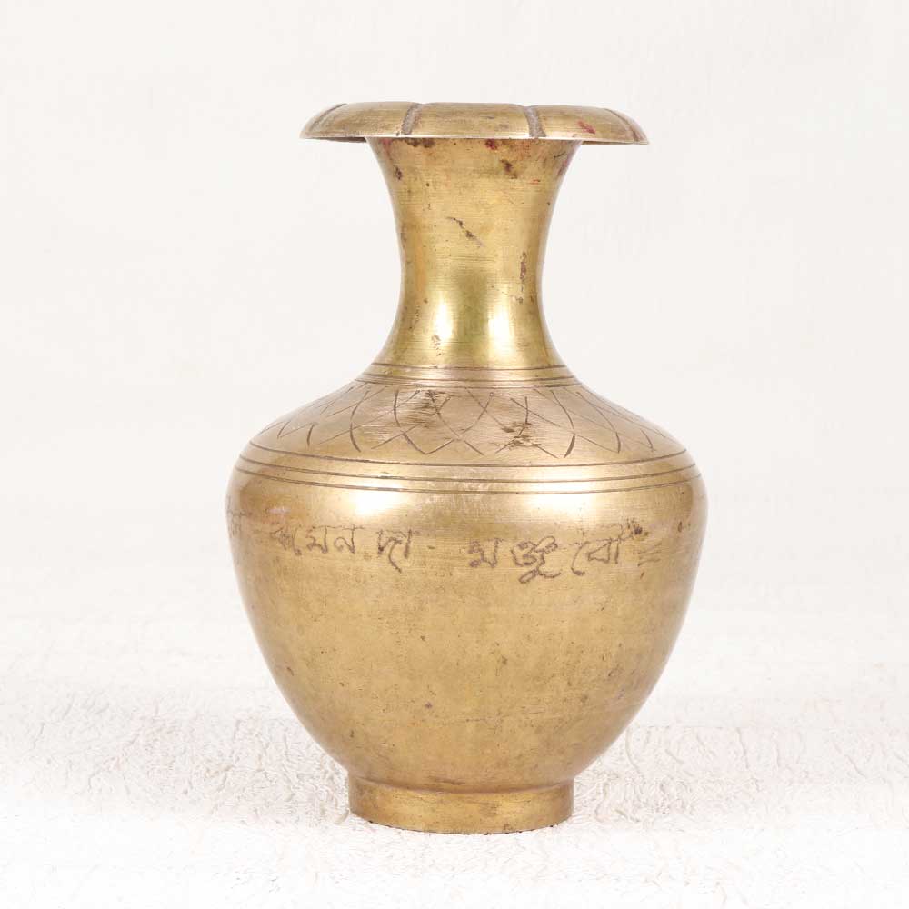 This antique-inspired engraved brass flower pot adds a touch of Gatsby-era glamour to any space. Meticulously hand-engraved with an ornate floral and leaf motif, this striking pot gleams with the brilliant golden shine of solid brass. The generous sturdy construction makes this pot perfectly suited for showcasing a bouquet of fresh blooms or a potted plant. Display it as an elegant accent atop a console or bookshelf, or place it prominently on an entryway table to make a dramatic first impression. For lovers of Art Deco and Art Nouveau styling, this pot is a real statement piece. The intricate engraving evokes the decadent sophistication of 1920s decorative arts, while the rich patina of the brass lends vintage warmth and character. Whether your style is classic or modern, this glamorous accent is sure to spark conversation and delight design aficionados. Let this ornate brass flower pot infuse your home with Gatsby-era opulence and charm.