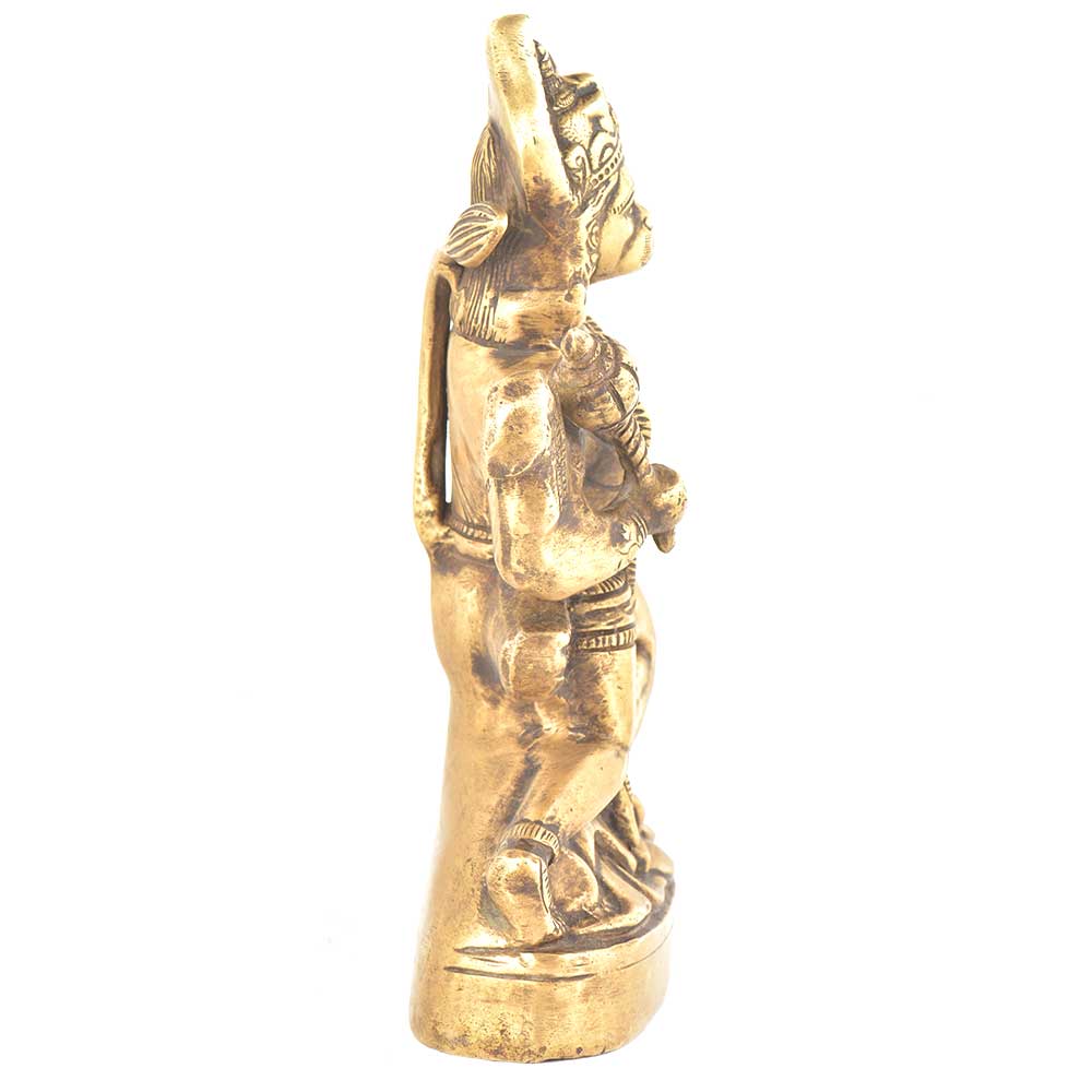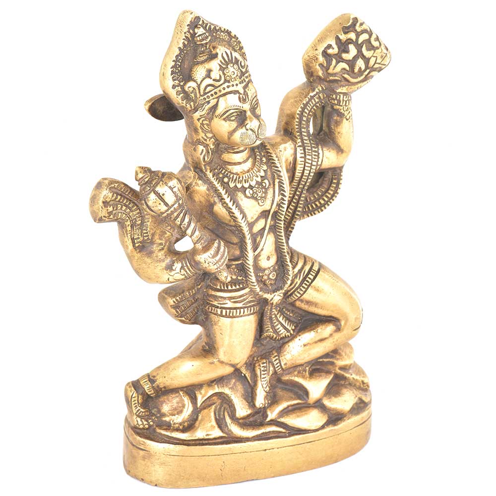 Lord Hanuman was an ardent devotee of lord Rama and an incarnation of Lord Shiva . This brass statue depicts lord hanuman carrying the mountain of herb in one hand ( sanjeevani booti) to save the life of lord ram's brother lakshmana.