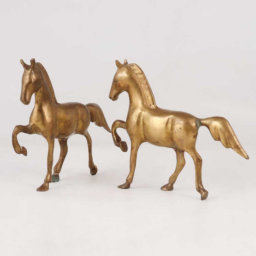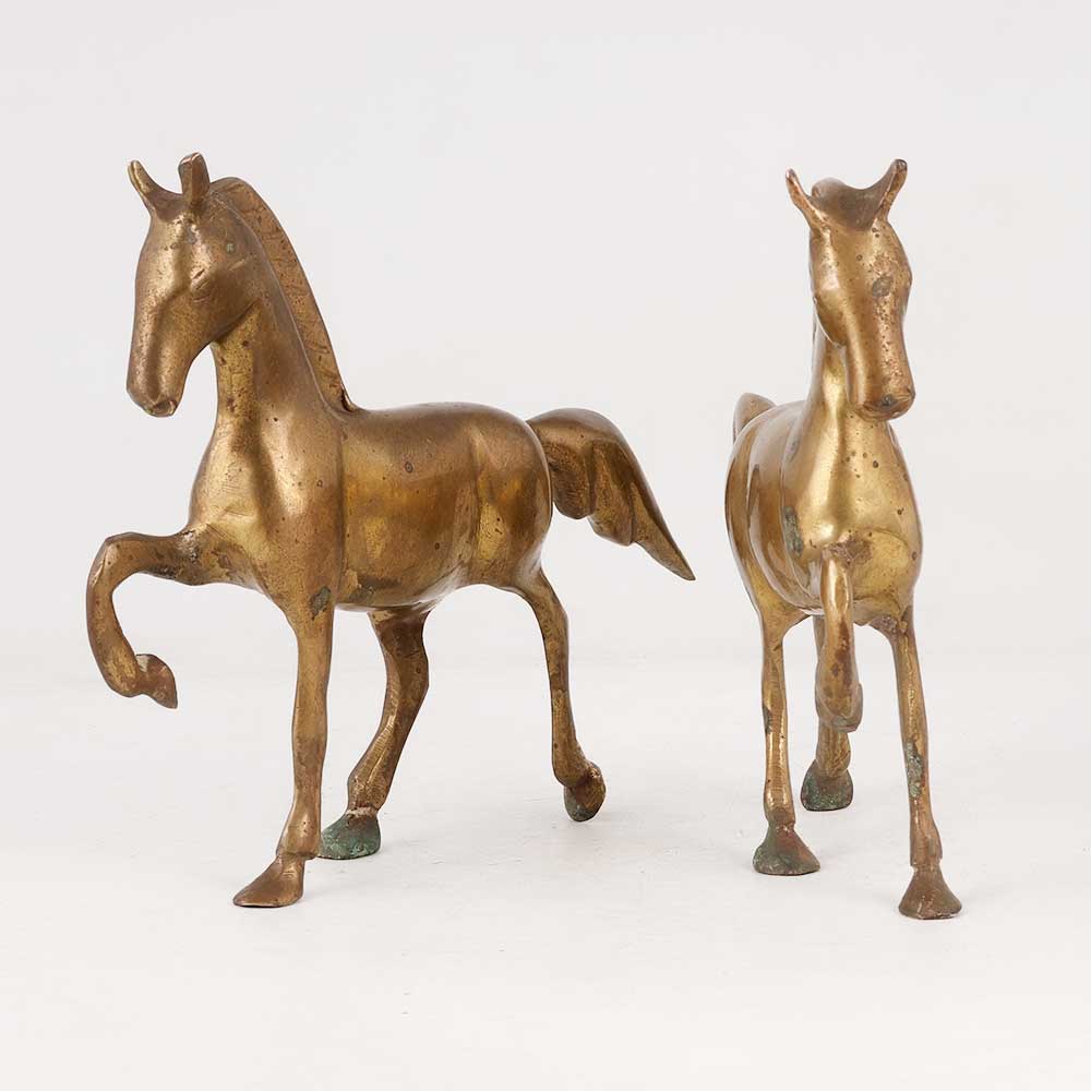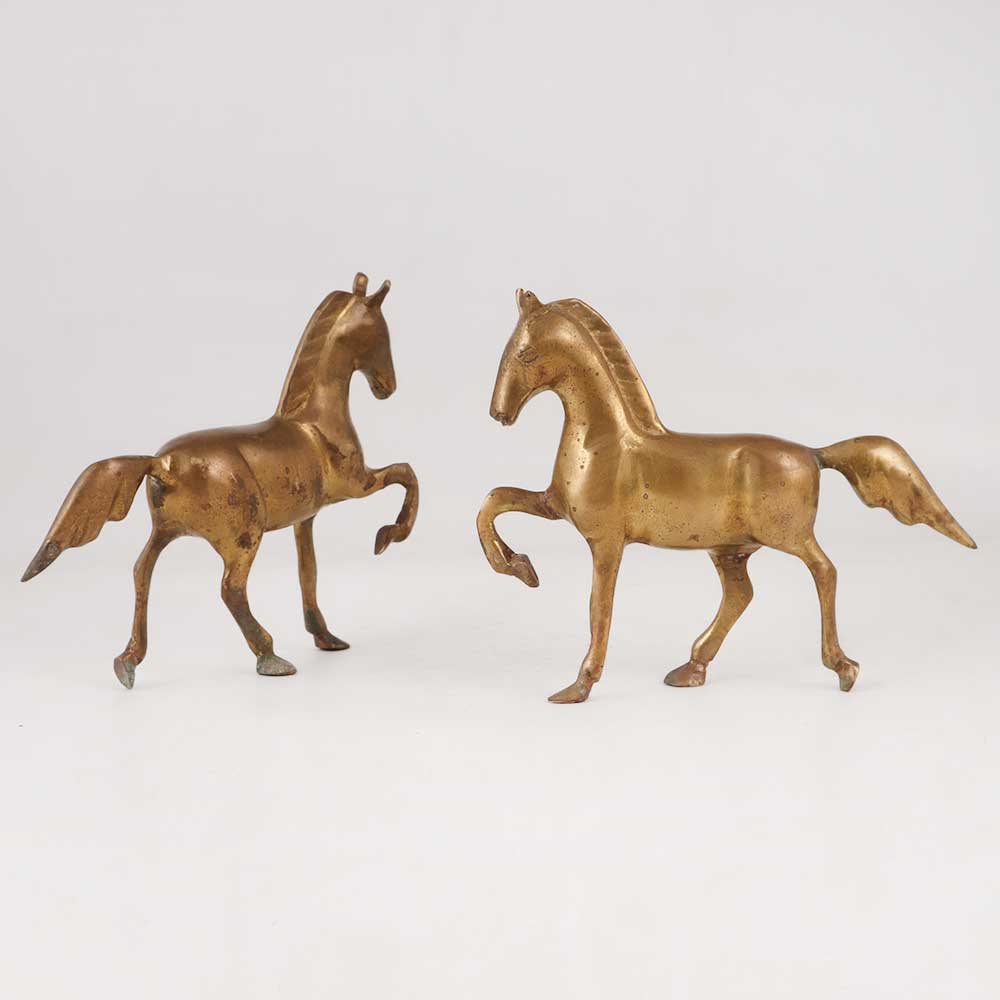 Adorn your living space with this pair of 2 brass horse statues, a true testament to the beauty of English Art and intricate detailing. Each statue showcases a stunning design with their front right leg gracefully elevated, giving the impression of a majestic horse in motion. These handcrafted masterpieces feature an antique brown finish, adding an air of elegance and antiquity to any setting. Meticulously crafted by skilled artisans, these statues exude craftsmanship and artistry of the highest calibre. Ideal for decorating your home, office, restaurant, hotel, or cafe, these brass horse statues will effortlessly elevate the ambiance of any space. Whether displayed individually or as a captivating pair, they are perfect for exhibitions or adding to a vintage collection, making a distinctive statement. Surprise your family, friends or relatives on special or festive occasions by gifting them these timeless treasures.