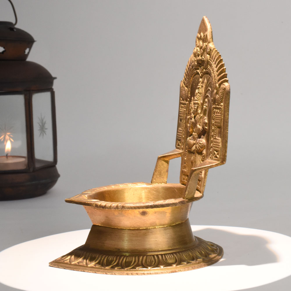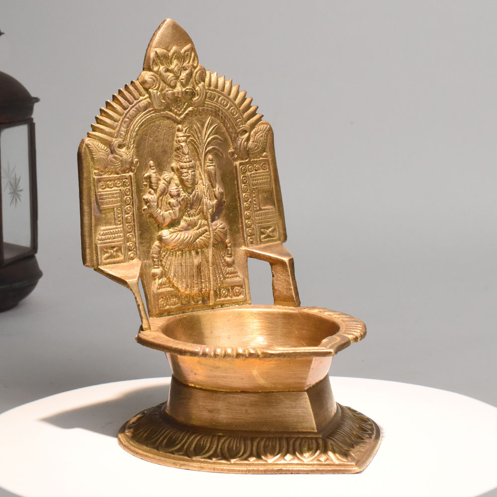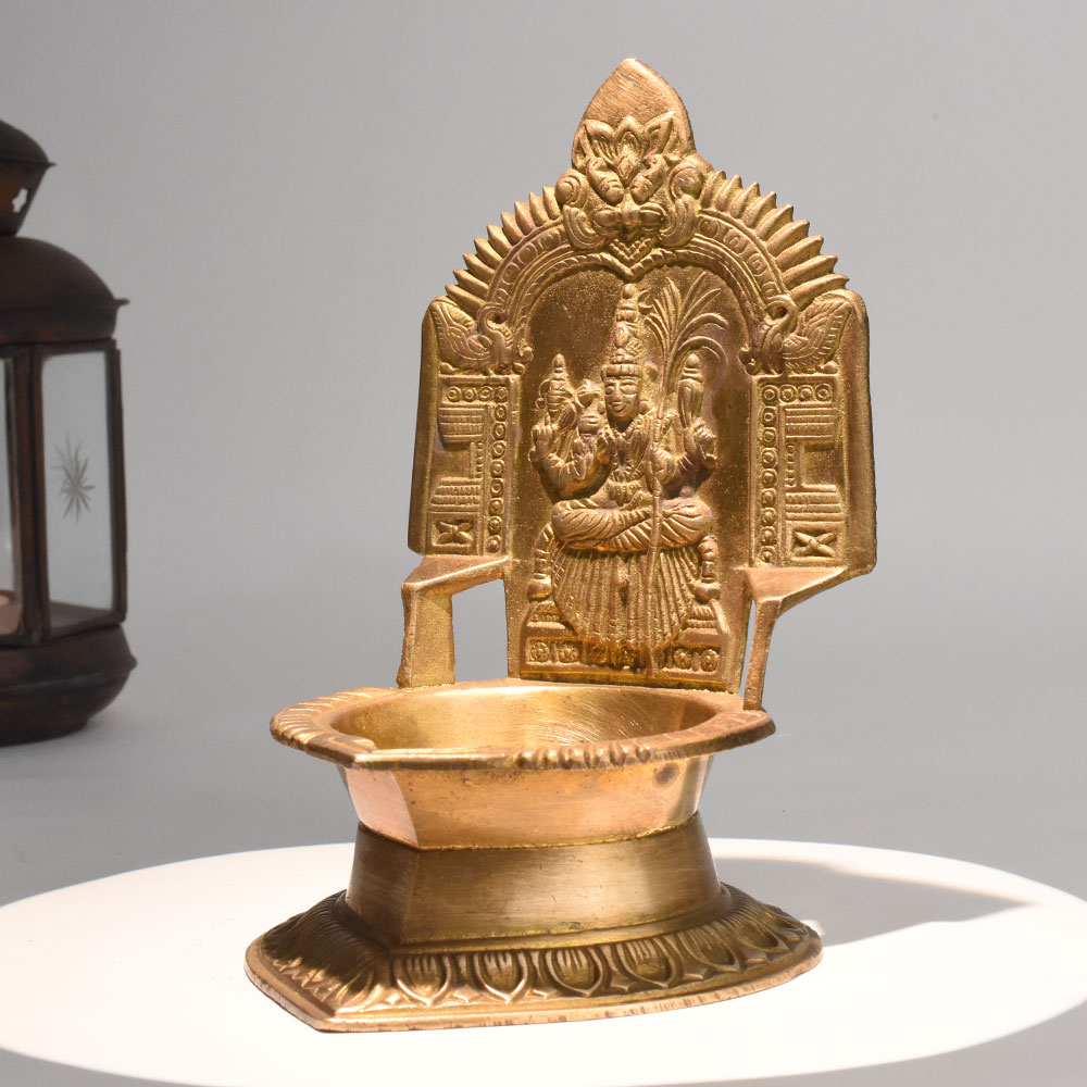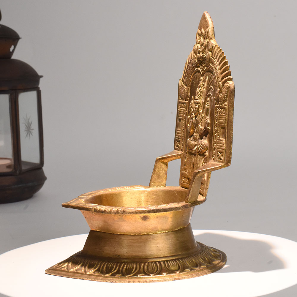 - Handcrafted brass oil lamp with Gajalakshmi motif