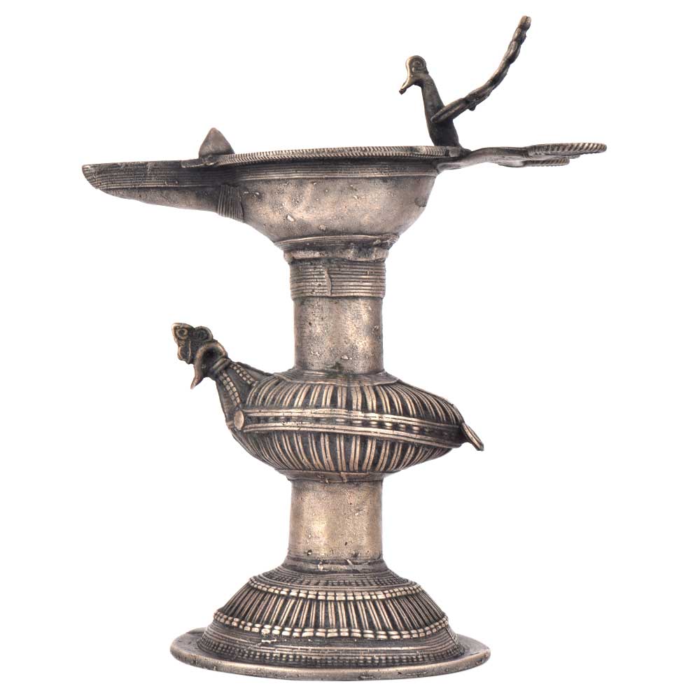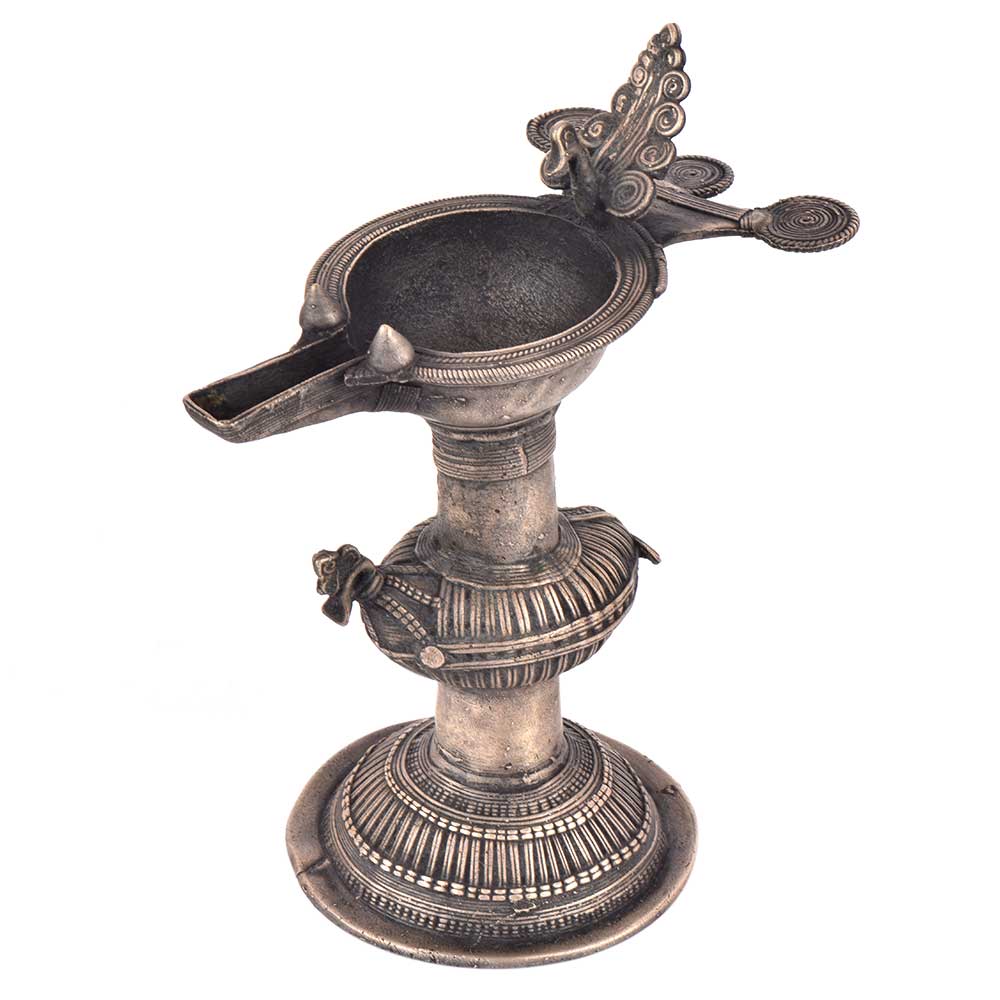 Handcrafted using old lost wax technique primarily practiced in Orrisa and West Bengals by the local or tribal artisans. In this technique the molten wax is poured into desired clay mould and when the wax melts the clay is broken and we get the desired metal object which is further polished to perfection. The Deep Cup Can Be Filled with Oil and Light a Cotton Wick. Diyas/ Oil Lamps are Considered Auspicious as in Hindu Religion. It is detailed with Elephant and Peacock Animals with Beautiful Details.
