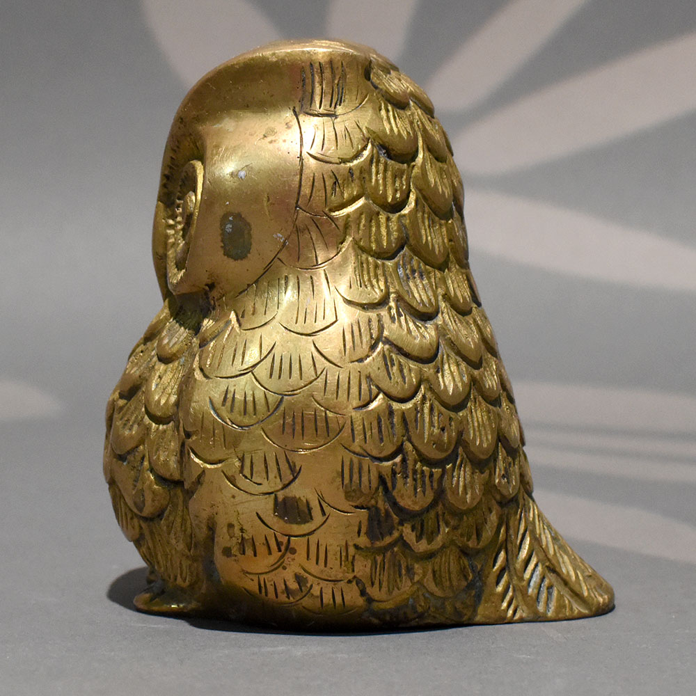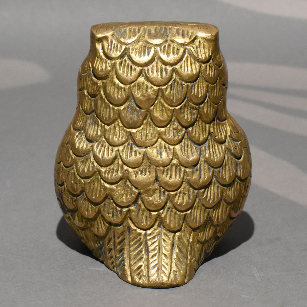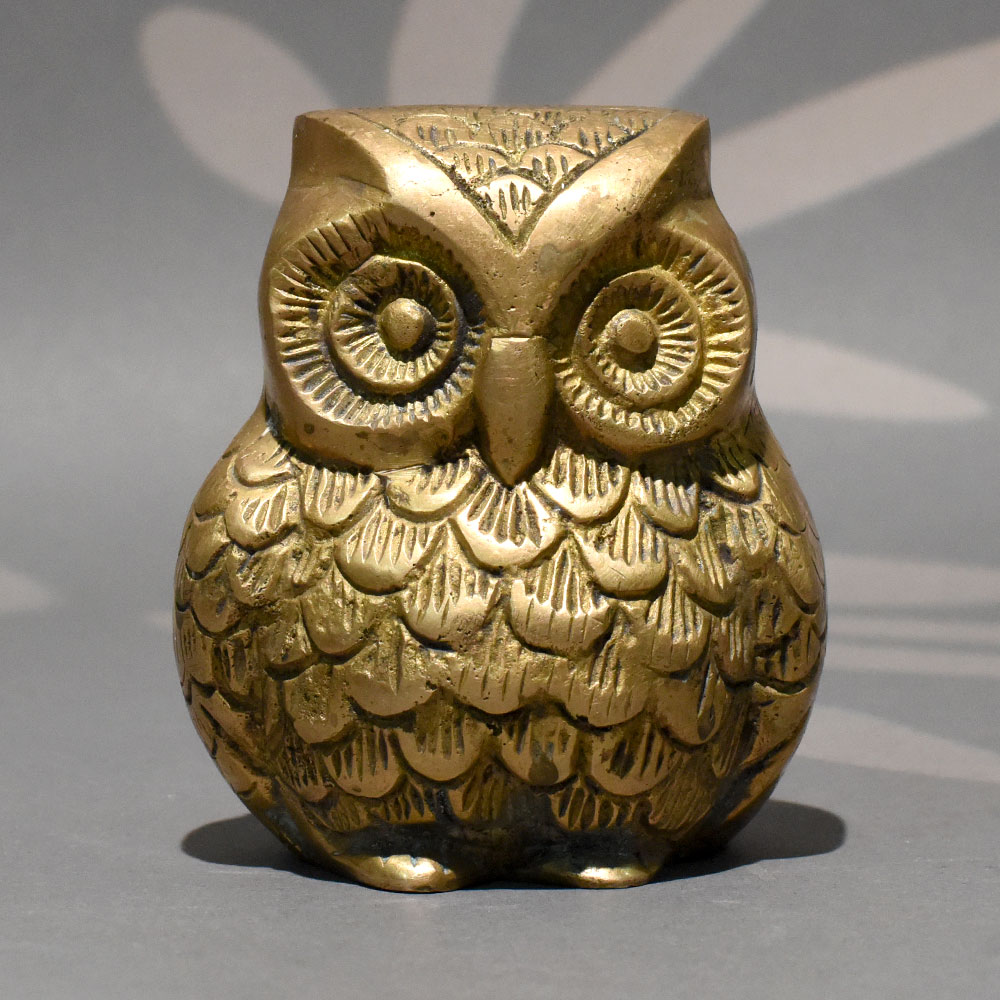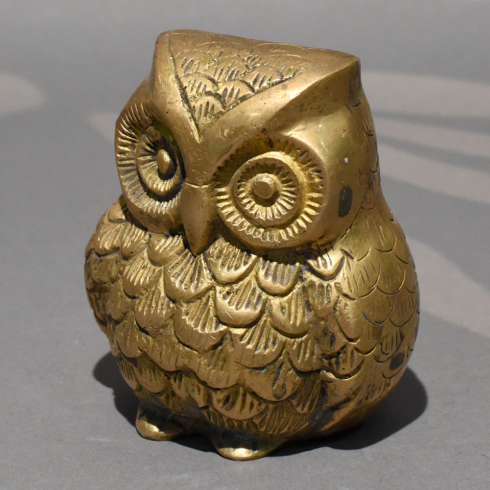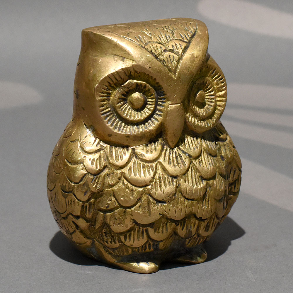 Symbolizing wisdom, protection, and intuitive strength, this handcrafted brass owl figurine is a striking decorative accent rooted in traditional metal artistry. Sculpted in solid brass, the piece captures the alert gaze and intricate feather layering that define the majestic presence of an owl. The detailed engraving across its body and wings enhances depth, while the warm golden finish gives it a naturally aged vintage character. This handmade brass sculpture stands firm with balanced proportions and carefully carved features, including textured plumage and expressive circular eyes. The subtle patina across its surface reflects artisanal craftsmanship and traditional casting methods. Its compact size makes it versatile enough to display on bookshelves, office desks, console tables, or study corners. Owls have long been associated with intelligence and prosperity in many cultures, making this decorative figurine meaningful beyond aesthetics. Whether placed in a home office for inspiration or gifted as a symbolic keepsake, it carries both decorative and cultural value. The solid brass construction ensures durability while maintaining a timeless appeal. Each handcrafted detail reinforces its authenticity and uniqueness.