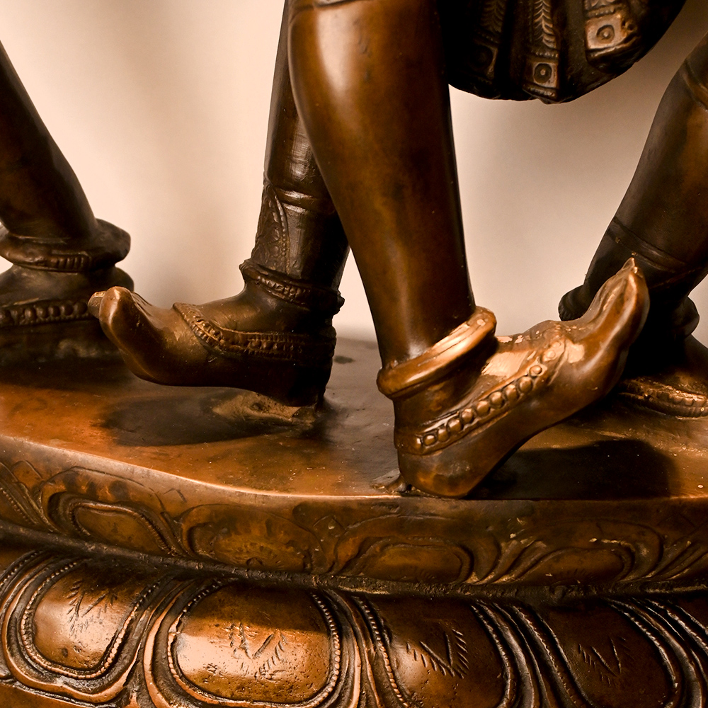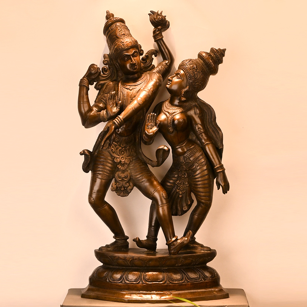 Bring divine grace and timeless beauty into your space with this exquisite handcrafted Brass Radha Krishna statue. Depicting Lord Krishna and Radha in a graceful dancing posture, this sculpture reflects eternal love, devotion, and harmony. Carefully cast in solid brass and finished with a rich antique patina, every detailfrom the expressive faces to the intricate ornaments and flowing draperyshowcases skilled Indian craftsmanship. Perfect for home temples, living rooms, meditation spaces, or as a meaningful gift, this Radha Krishna idol adds a spiritual and artistic touch to any interior. Its classic design makes it suitable for both traditional and contemporary decor.