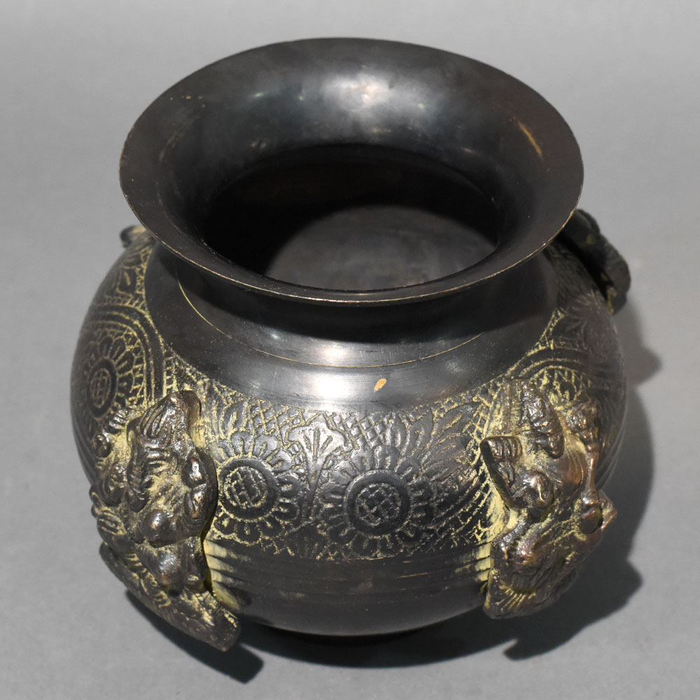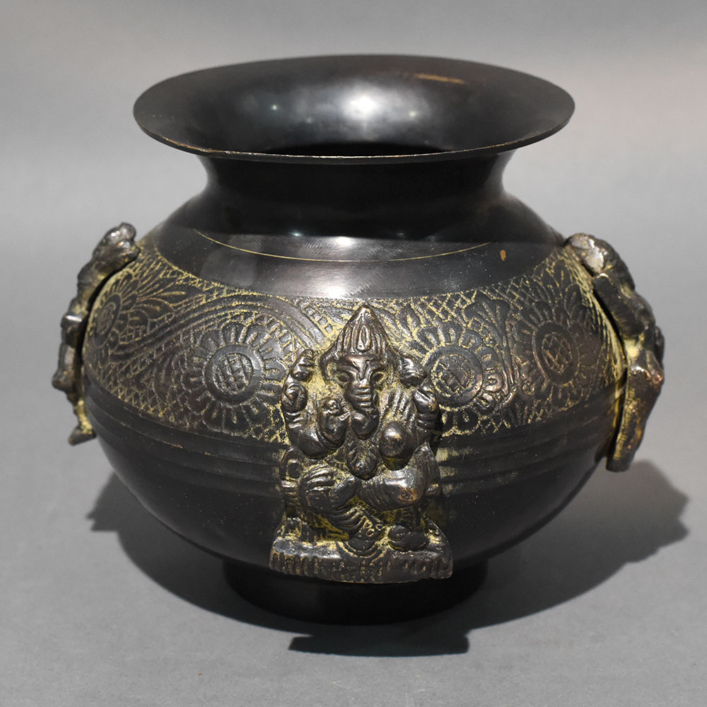This handcrafted brass ritual pot features an ornate traditional form enhanced with sculpted female figure handles and engraved floral motifs. The rounded body displays intricate hand-etched patterns that radiate across the surface, forming symmetrical floral medallions and decorative textures that highlight traditional metal craftsmanship. Two sculptural female figure handles emerge from the sides of the vessel, adding symbolic character and artistic depth. These raised figures appear to hold the pot, giving the vessel a ceremonial presence often seen in temple vessels and ritual containers used in traditional Indian cultural settings. The wide flared mouth allows easy access and functional use, while the smooth upper rim contrasts beautifully with the richly textured lower body. The dark antique brass finish reveals natural golden highlights across the engraved patterns and sculpted figures, emphasizing the handcrafted detailing and aged aesthetic. Historically inspired brass vessels like this are often used in ritual practices, altar arrangements, or ceremonial decor. It can be used to hold sacred water, flowers, or offerings during pooja ceremonies, festive celebrations, and temple rituals. The sculptural form also makes it suitable as a decorative centerpiece in traditional interiors or heritage-inspired decor spaces. Crafted from solid brass using traditional metalworking techniques, the vessel offers durability and long-term preservation. Slight variations in finish and engraving reflect authentic handcrafted workmanship and contribute to the uniqueness of each piece.