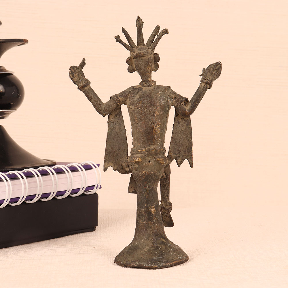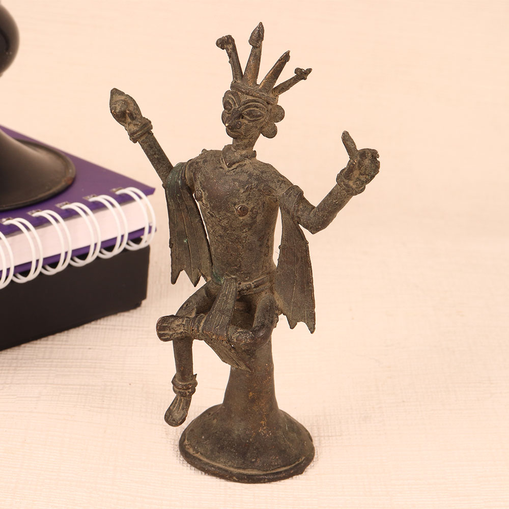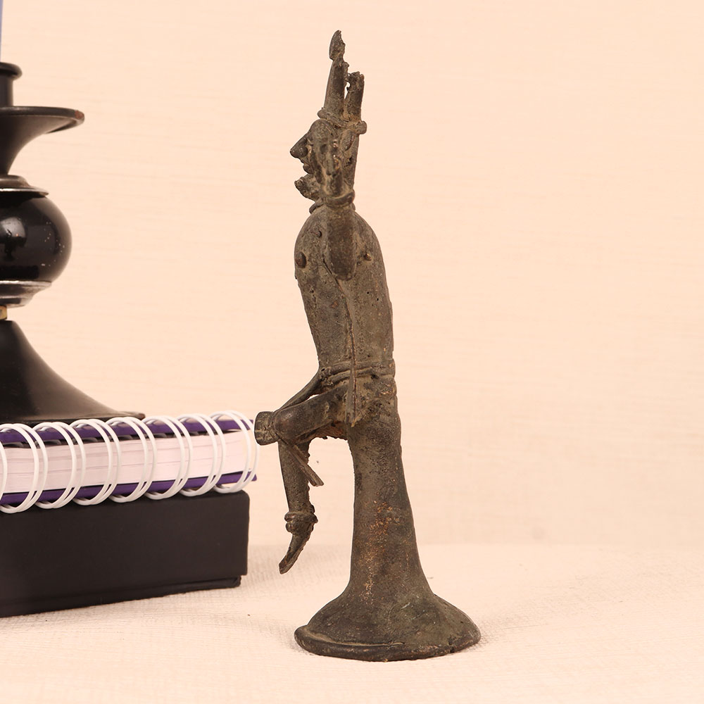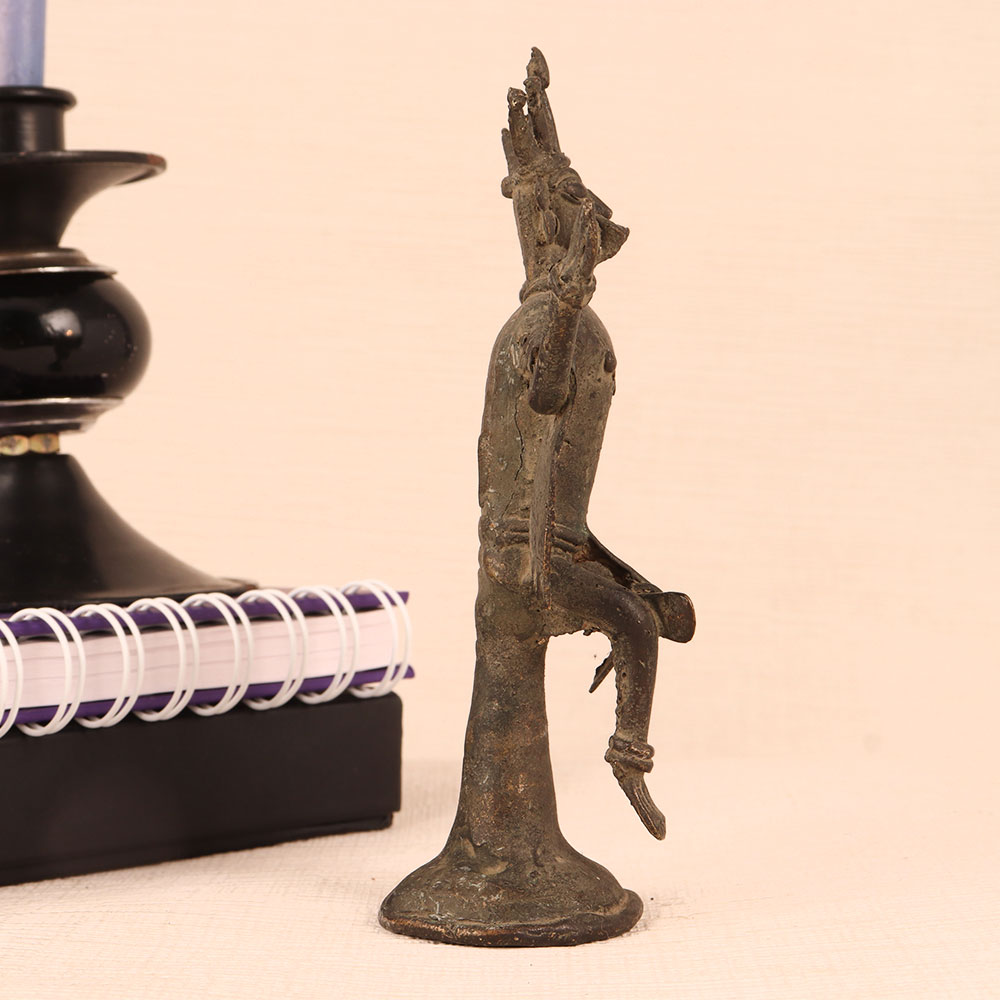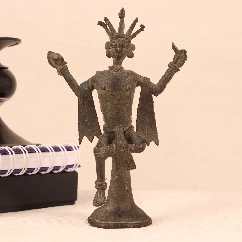 Enhance your home decor with the charm of our Folk Tribe Art Brass Statue of God. Crafted with meticulous precision by talented Indian artisans, this masterpiece showcases the rich heritage of Indian craftsmanship. Sitting regally on a vintage brown-finished platform, the deity is adorned with a magnificent crown, adding a touch of royal elegance to any setting. The statue cast from high-quality brass exudes a timeless appeal and a warm, vintage aura. This versatile piece can find a cherished place in your home, office, restaurant, hotel, cafe, or shop's prayer room. Its aura of divine serenity makes it ideal for personal devotion or as a stunning decorative item. Collectors of vintage treasures will find it a valuable addition to their ensemble. Whether it's a special occasion, a festive celebration, or an auspicious moment, this brass deity statue makes for a thoughtful and meaningful gift. Share the blessings and the beauty of Indian craftsmanship with your family, friends or relatives.