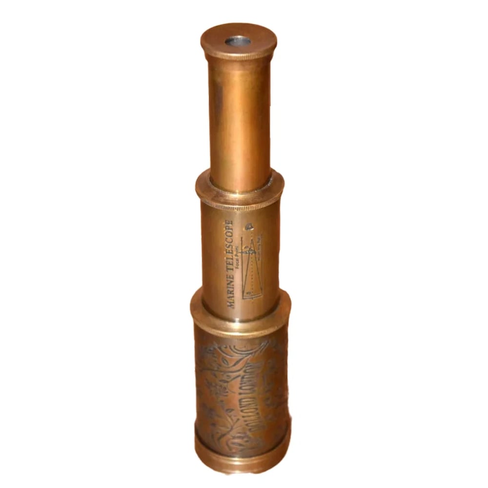This handcrafted brass telescope features a clean vintage design with subtle engraved detailing, inspired by classic maritime instruments. Its compact structure and antique finish make it a refined dcor piece, ideal for collectors and those who appreciate timeless craftsmanship. Classic Design and Appeal This brass telescope showcases a minimal yet vintage-inspired design, making it suitable for both decorative use and collectible display. Elegant brass telescope with antique finish Subtle engraved detailing for a vintage look Compact and lightweight design Inspired by traditional nautical instruments Material and Craftsmanship Material: Solid brass Finish: Antique polished brass Construction: Handcrafted with precision detailing Style: Nautical, vintage dcor Usage and Styling Ideas Perfect for desks, shelves, and study dcor Enhances vintage and nautical-themed interiors Ideal for collectors and dcor enthusiasts Can be used as a premium display or styling prop Care Instructions Wipe with a soft dry cloth. Avoid exposure to moisture to preserve the brass finish. Frequently Asked Questions Is this telescope functional? This item is primarily designed for decorative and collectible purposes, with basic viewing capability. Is this suitable for gifting? Yes, it makes a unique and thoughtful gift for collectors and vintage dcor lovers. What makes this product unique? Its handcrafted brass build and vintage design make it a timeless dcor piece with collectible value.