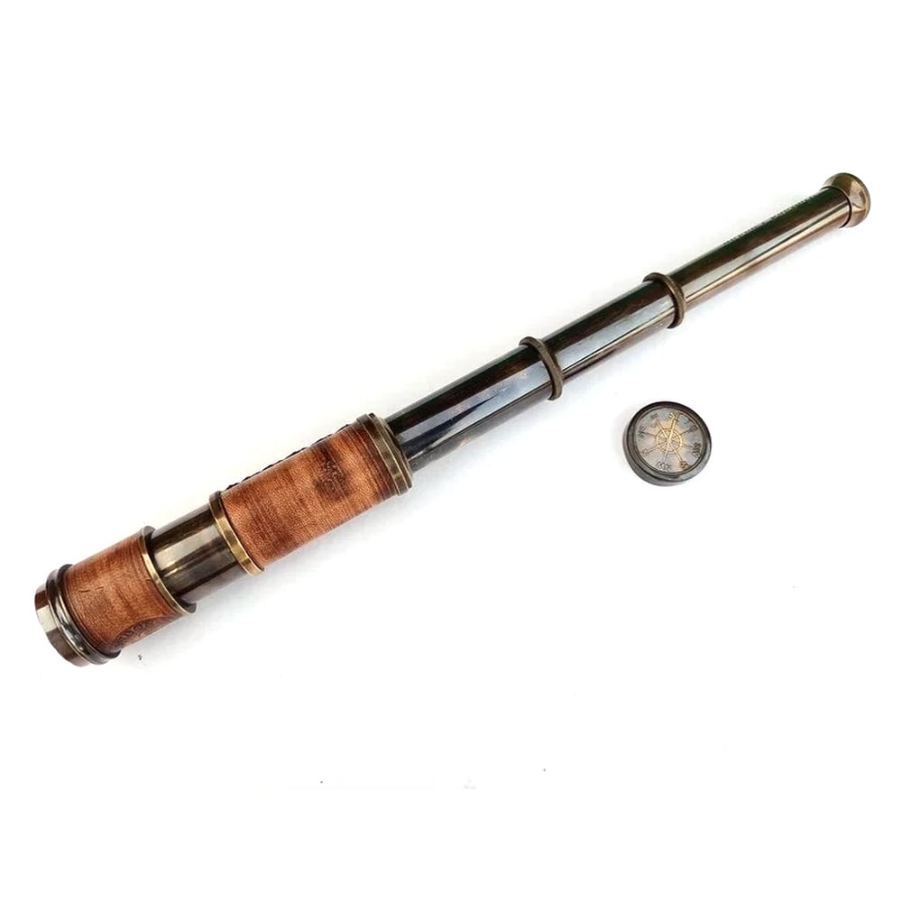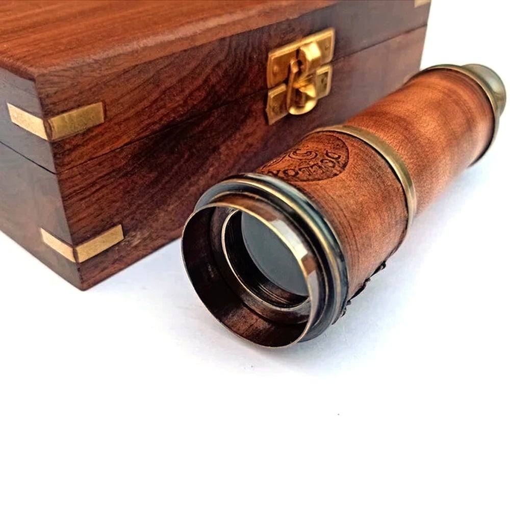 This handcrafted brass telescope with a textured leather grip is presented in a polished wooden storage box, combining functionality with premium vintage aesthetics. The detailed brass body and structured casing make it a refined collectible and an elegant dcor piece for classic interiors.