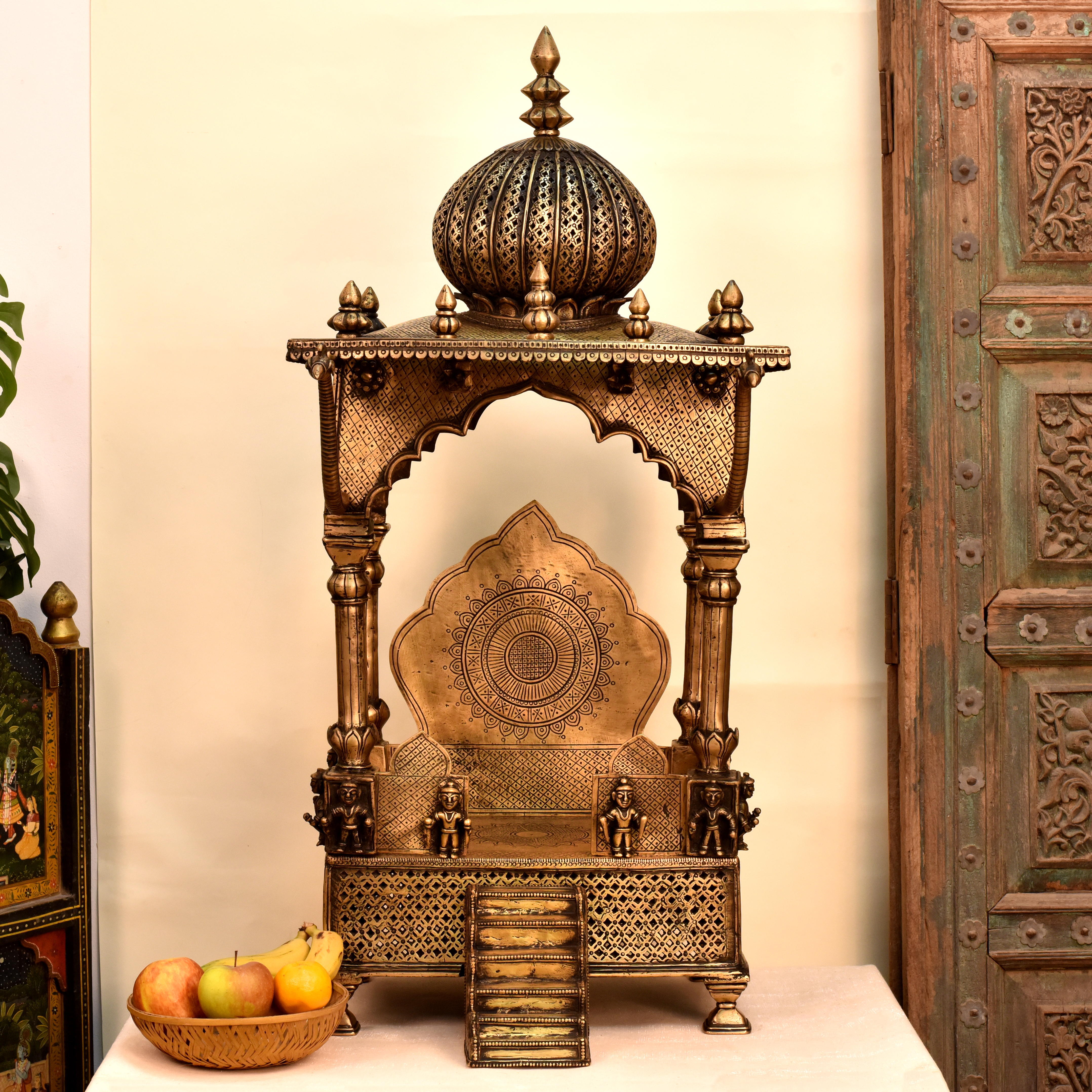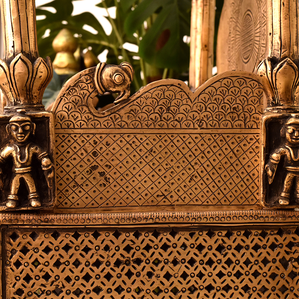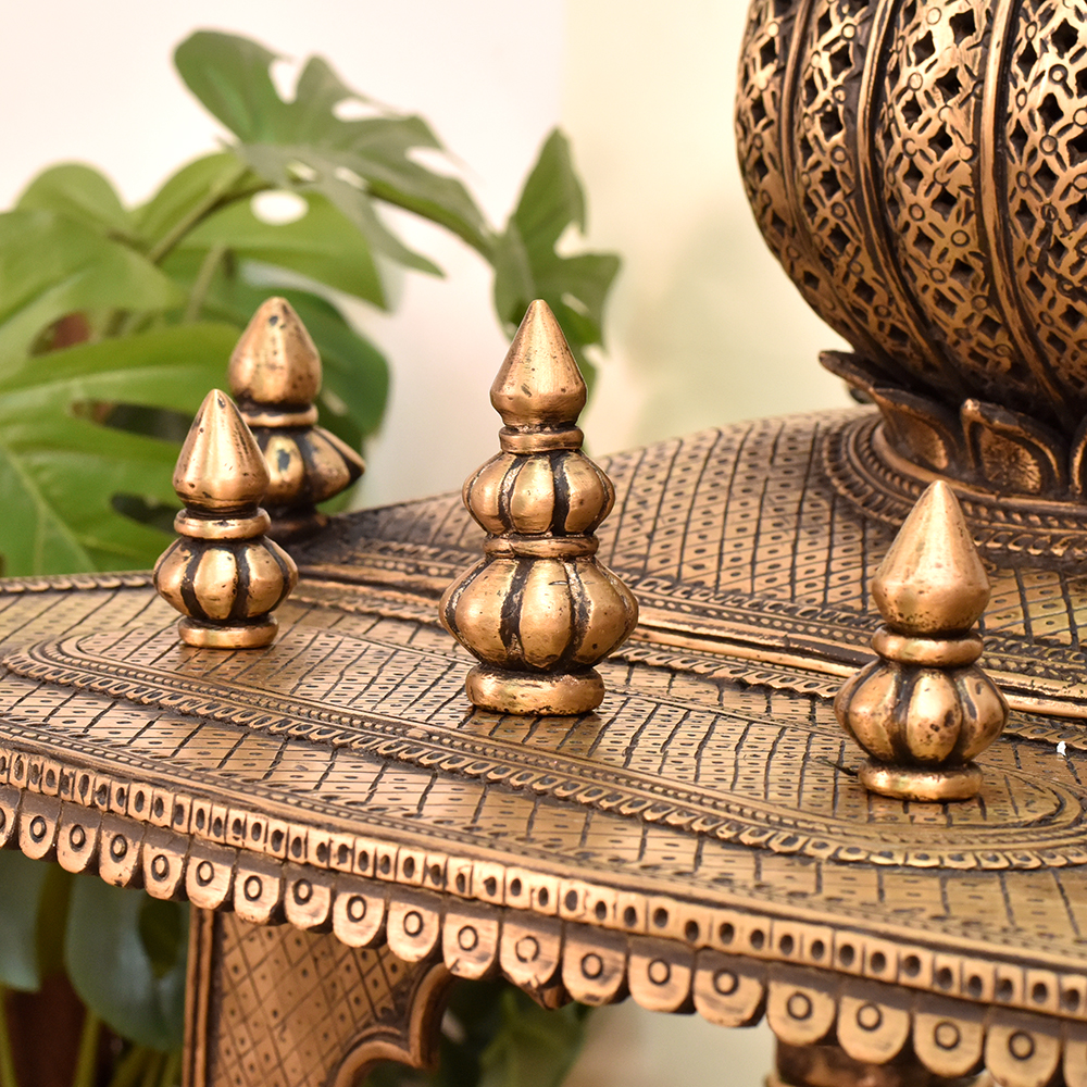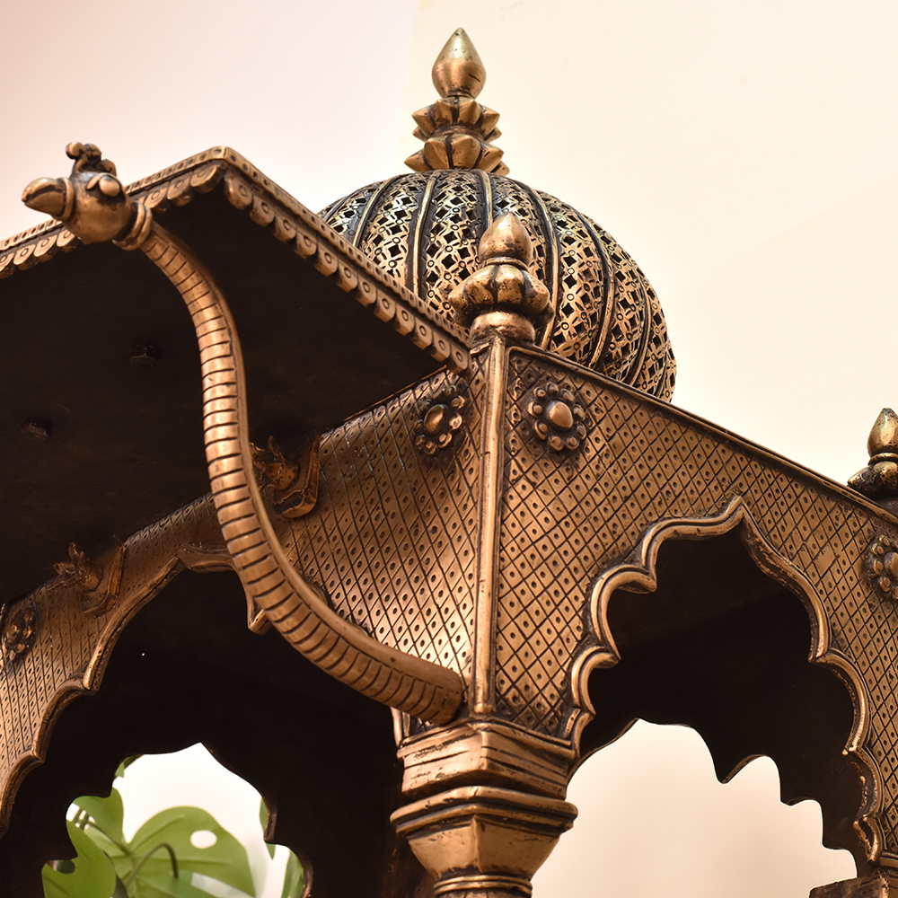 Immerse yourself in the rich cultural heritage of India with our exquisite brass temple, inspired by the iconic architecture of Rajasthan. Crafted using traditional techniques passed down through generations, this stunning piece is a work of art that will captivate all who behold it. This brass temple is more than just a decorative accent - it's a portal to another world, a window into the vibrant tapestry of Indian culture. The ornate carvings and iconic silhouette transport you to the bustling streets of Rajasthan, evoking a sense of wonder and timelessness. Whether you're drawn to its captivating beauty or seeking to incorporate meaningful cultural elements into your home, this temple is a truly special piece that will nourish your soul. Display this brass temple with pride in your living room, meditation space, or home office, and let its commanding presence elevate the entire room. Use it as a platform for your own spiritual practice, or simply enjoy its beauty as a breathtaking work of art that celebrates the rich heritage of India. Invite the splendor of Rajasthan into your life and let this magnificent temple inspire you every day.