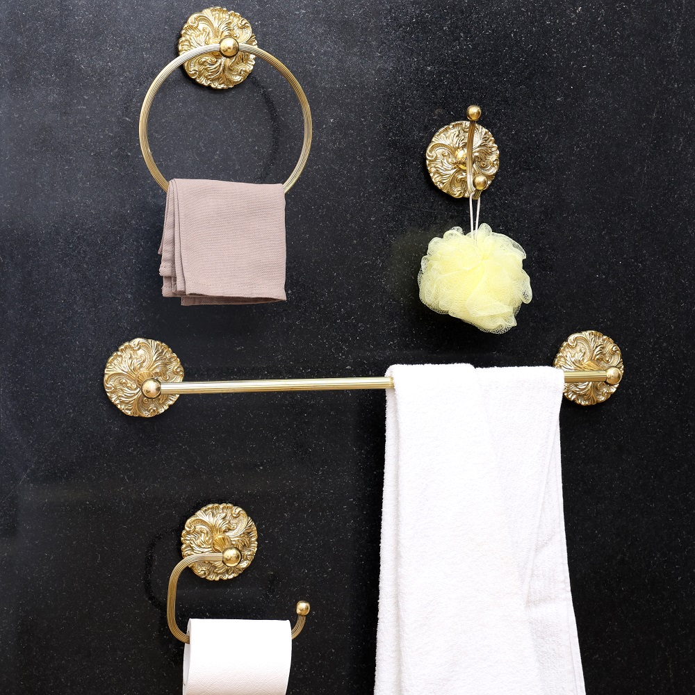 Give your bathroom a touch of elegance with the beautiful brass towel holder. This stunning accessory features a golden finish that adds a warm, luxurious feel to your space. The solid brass construction ensures durability and timeless style. With its classic lines and rich golden hue, this towel holder makes a sophisticated addition to your bathroom decor. The generous bar allows you to hang multiple towels or bathrobes with ease. Built to last from solid brass, it provides a convenient place to store essentials while complementing your home's style. Give your bathroom the elegant details it deserves and organize your space beautifully with this charming brass towel holder. If you appreciate timeless accessories that enhance your home's warmth and charm, this brass towel holder is for you. The golden finish infuses any bathroom with a touch of luxury. Let this functional decor become a beloved part of your daily routine.