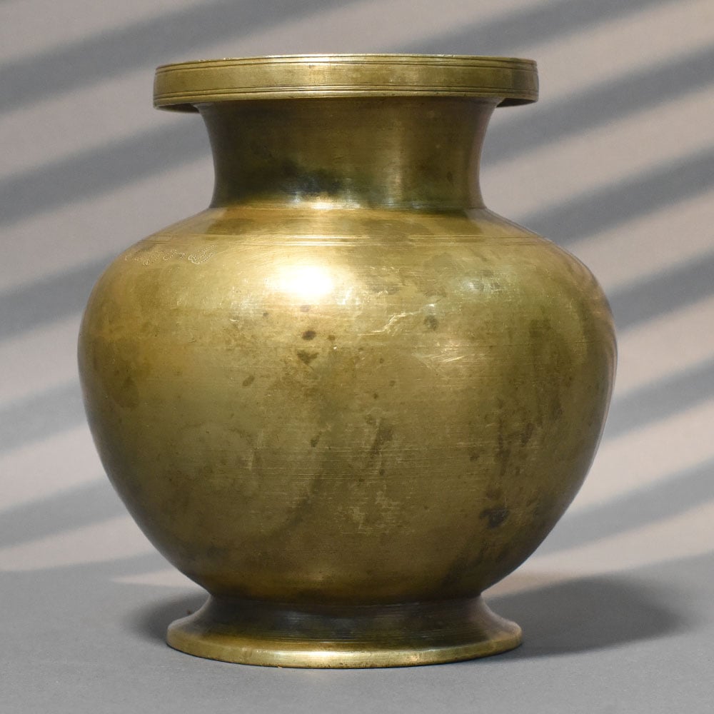 This handcrafted brass traditional kalash with wide rim design reflects timeless Indian craftsmanship with a strong, balanced silhouette. The rounded body, slightly tapered neck, and extended flat rim create a classic form that is both practical and visually grounded. Crafted from solid brass, the surface carries a natural aged finish with subtle marks and tonal variations, highlighting its handmade character. The wide rim not only enhances durability but also provides a firm grip, making it convenient for everyday ritual use. Traditionally used in pooja ceremonies, water storage, and sacred rituals, this kalash holds cultural and spiritual significance. Its broad body allows ample capacity, while the stable base ensures it remains secure during placement in temples or home altars. The minimal, undecorated surface emphasizes authenticity and makes it versatile for both traditional and contemporary settings. Whether used during festivals, daily rituals, or as a decorative accent, it brings a sense of heritage and simplicity into the space. This brass kalash is ideal for spiritual use, gifting, and collectors of traditional metalware, offering durability and timeless appeal.