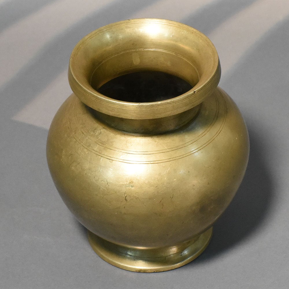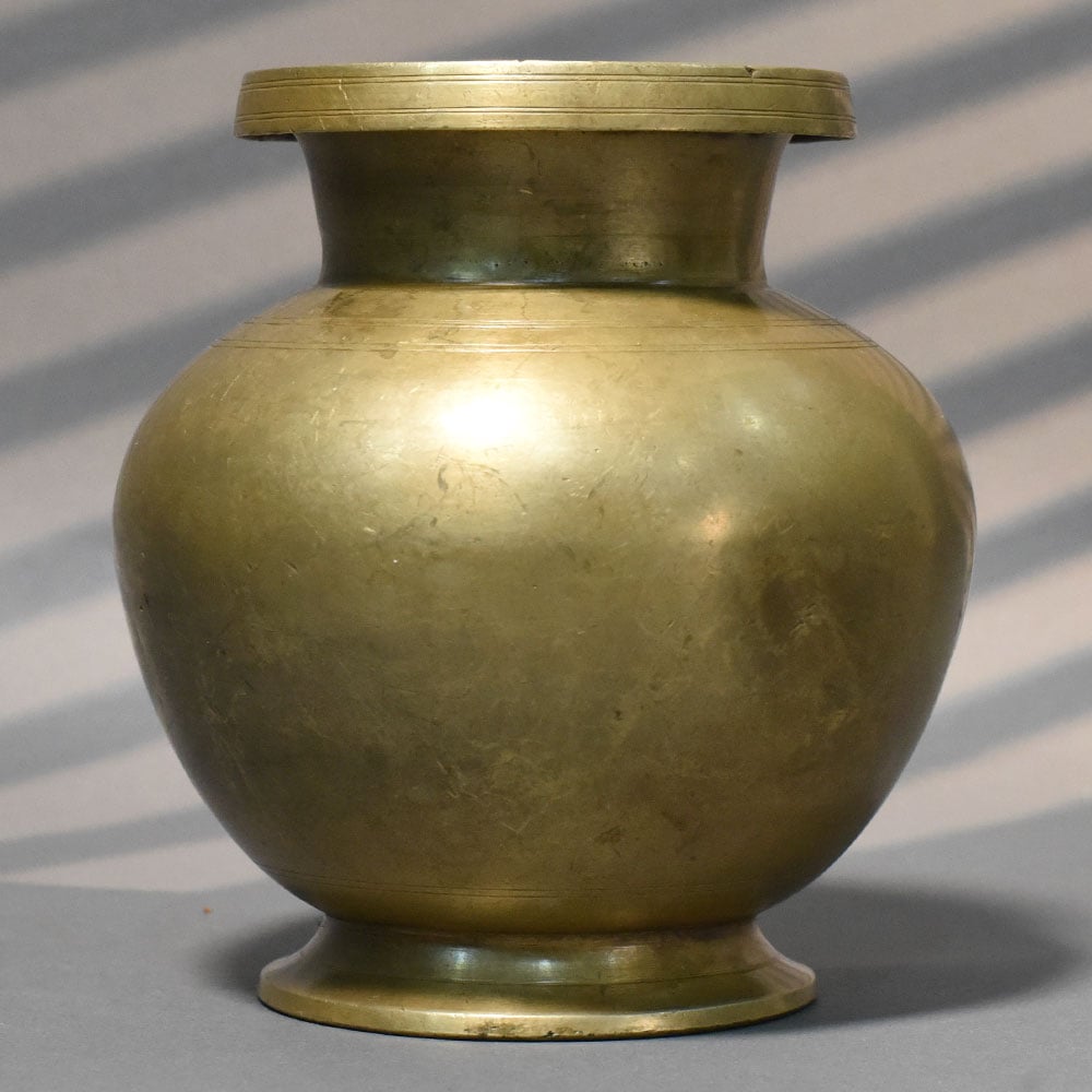 This handcrafted brass wide neck traditional pooja kalash is designed with a bold, structured form that reflects both functionality and heritage. The rounded body combined with a broad neck and extended rim creates a strong visual presence while ensuring ease of use in daily rituals. Made from solid brass, the surface features a natural matte sheen with subtle tonal variations that develop over time. The smooth finish highlights the authenticity of handcrafted metalwork, while the slightly aged patina enhances its traditional appeal. The wide opening allows convenient filling, cleaning, and handling during rituals. This kalash is commonly used for pooja ceremonies, water storage, and sacred offerings, making it an essential element in spiritual practices. Its stable base and balanced proportions ensure it remains steady during use, while the wide rim adds both grip and durability. Beyond ritual use, the kalash functions as a refined dcor object. Its minimal design and warm metallic tone allow it to integrate seamlessly into temple spaces, traditional interiors, or even contemporary settings where handcrafted accents are valued. Ideal for spiritual use, gifting, or collectors of traditional Indian metalware, this brass kalash represents durability, simplicity, and cultural significance.