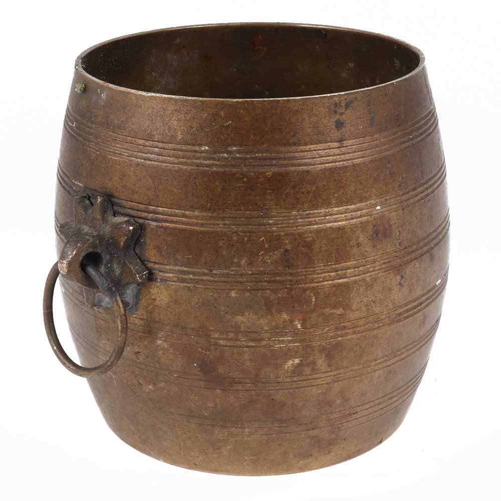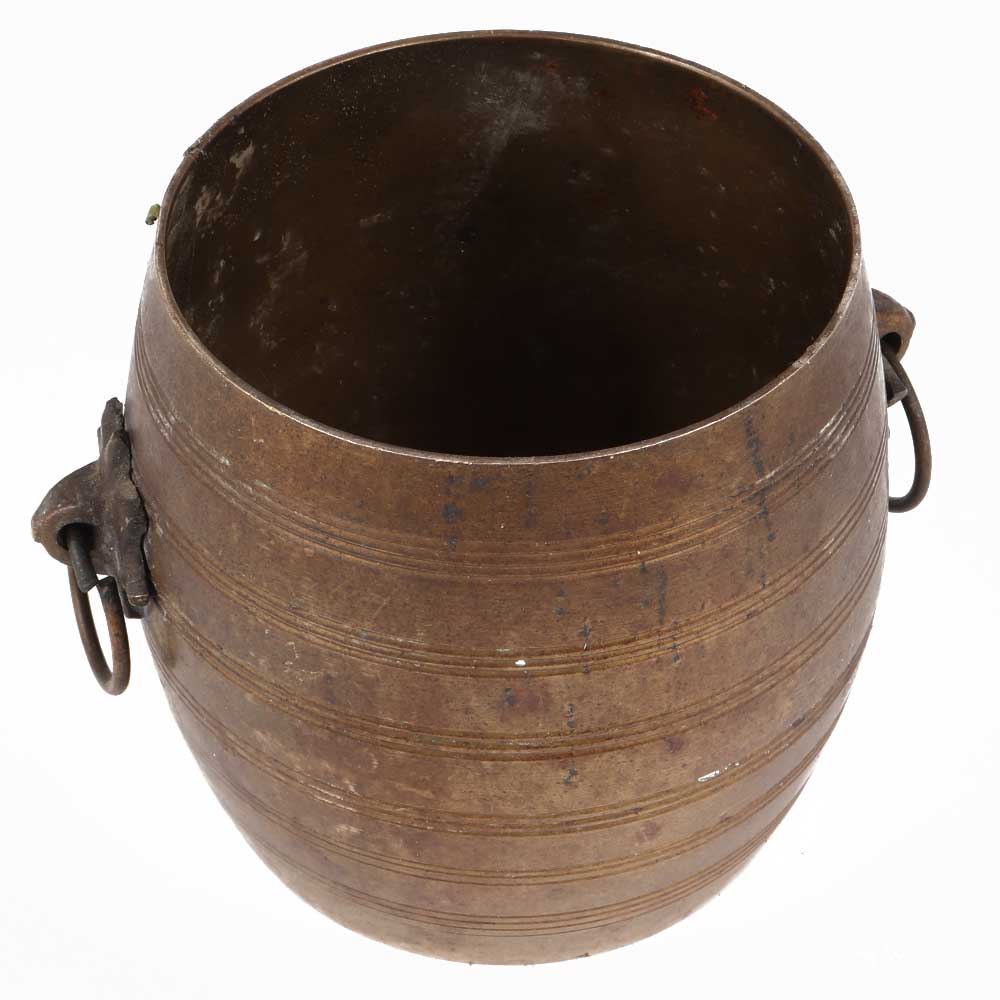 This handcrafted brass planter pot features two ring handles with an aged patina that give it a vintage character. It can be used as a planter, trash container or decorative item. Any decor will benefit from having this as an accent piece.