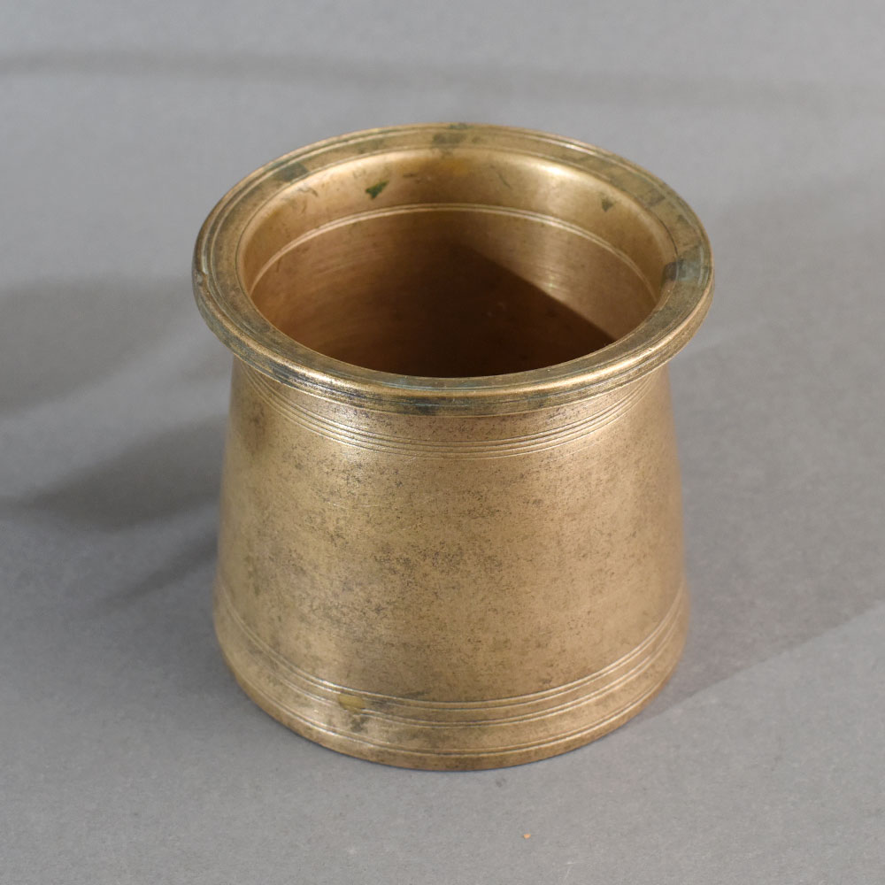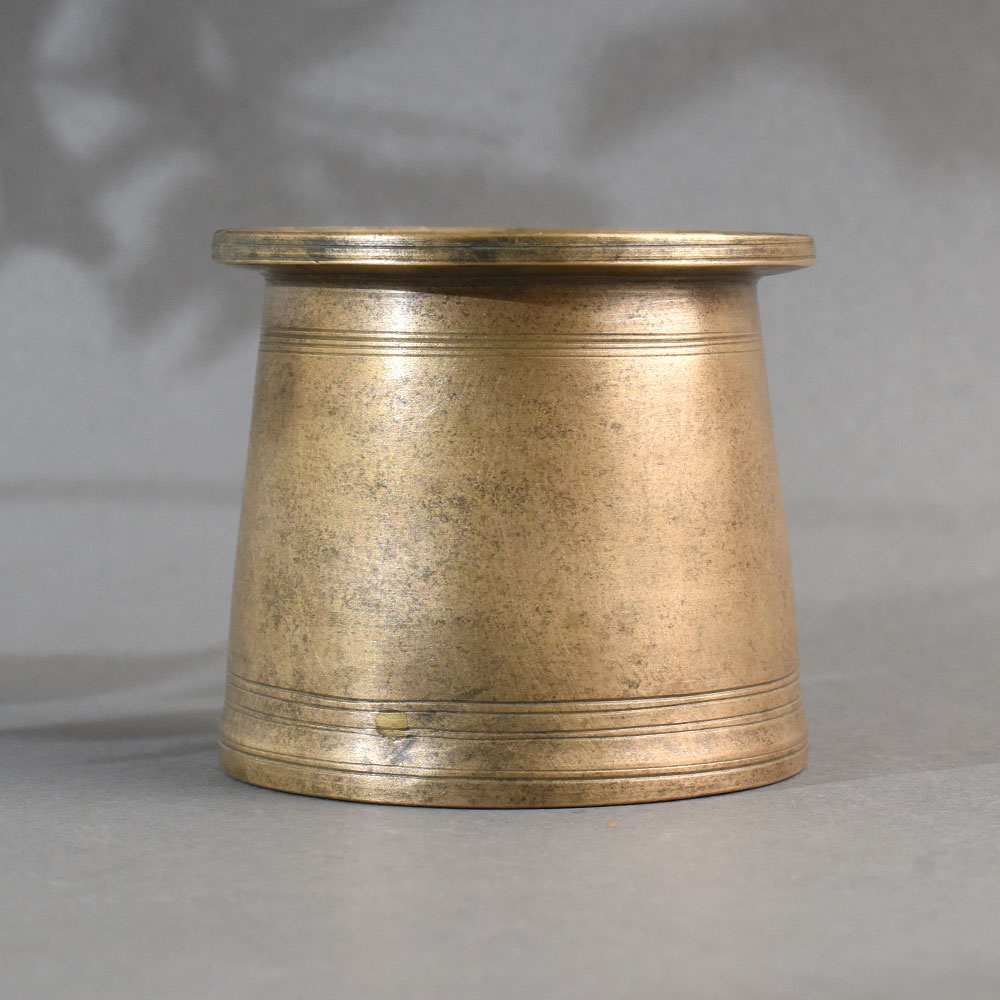 This traditional brass Panchpatra holy water pot is a timeless ritual vessel commonly used in Hindu religious ceremonies. Crafted from solid brass, it features a simple yet elegant tapered design with subtle linear engravings near the rim and base. The wide opening and stable base offer practical functionality, making it ideal for holding Gangajal or other sacred substances during daily puja and temple rituals. Known as “Panchpatra,” this vessel is traditionally paired with a spoon (uddharani) and used to purify idols, sanctify offerings, or perform ritual cleansing. The use of brass in spiritual practices is deeply rooted in Indian culture, believed to attract positive vibrations and enhance the sanctity of religious spaces.