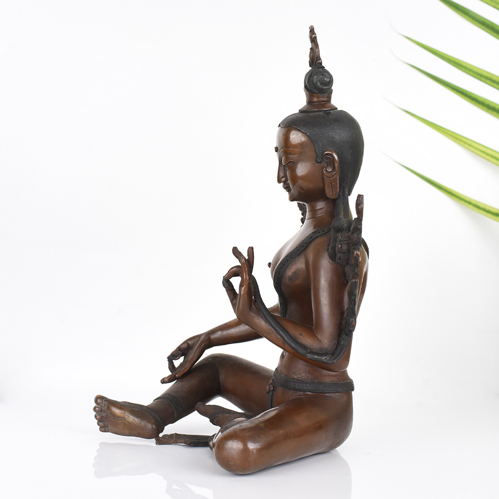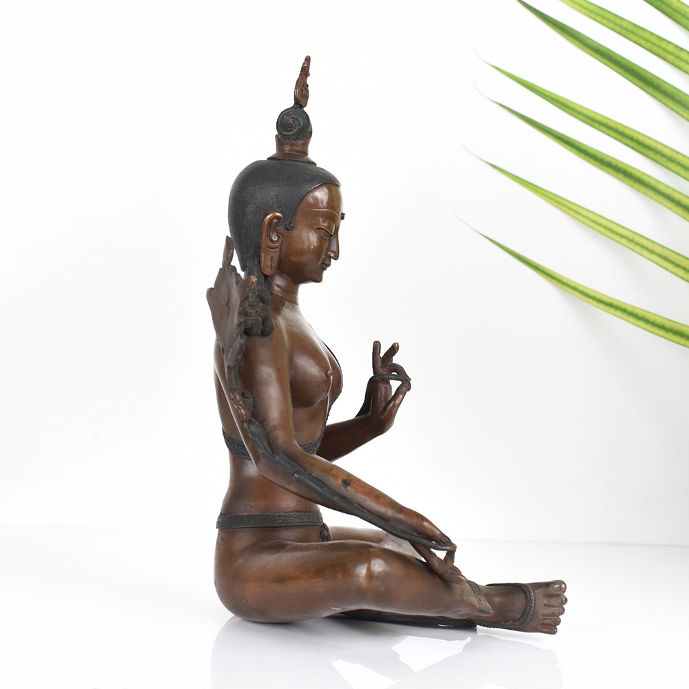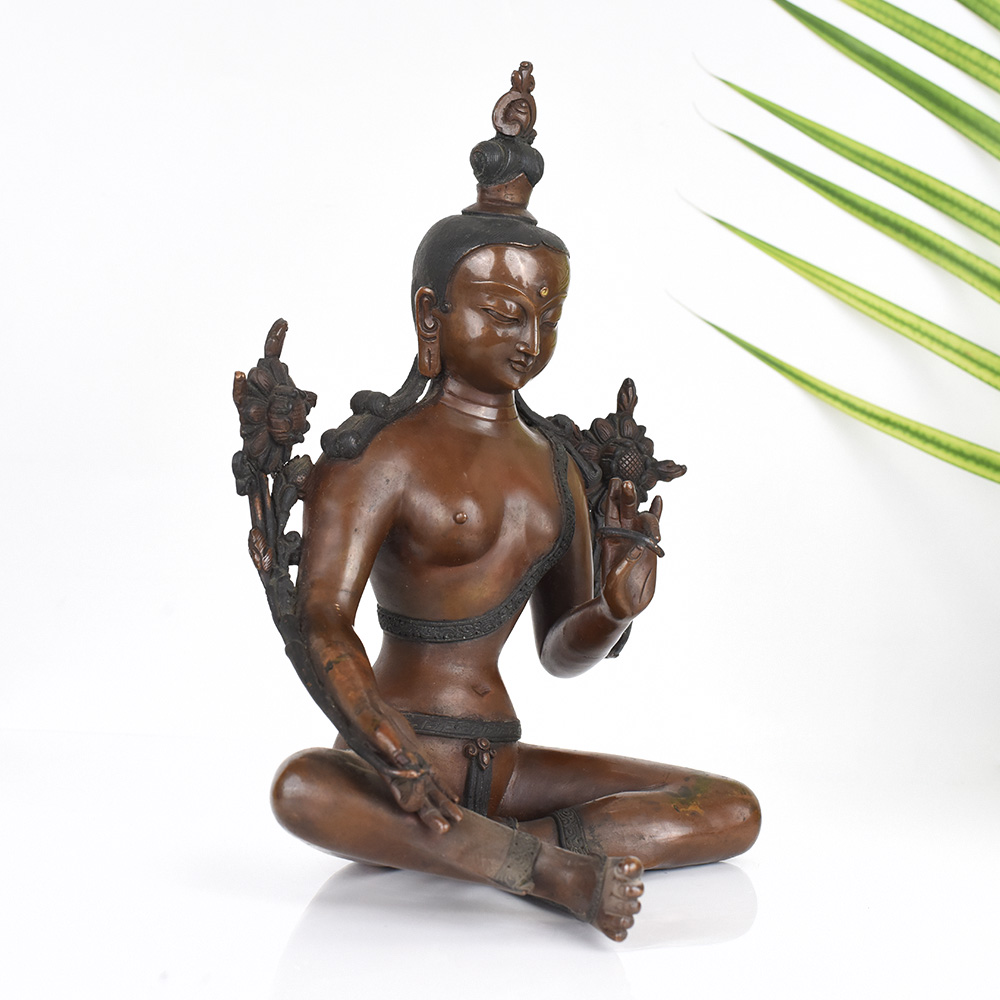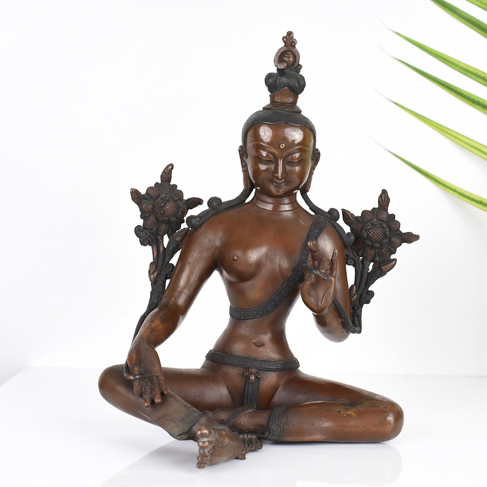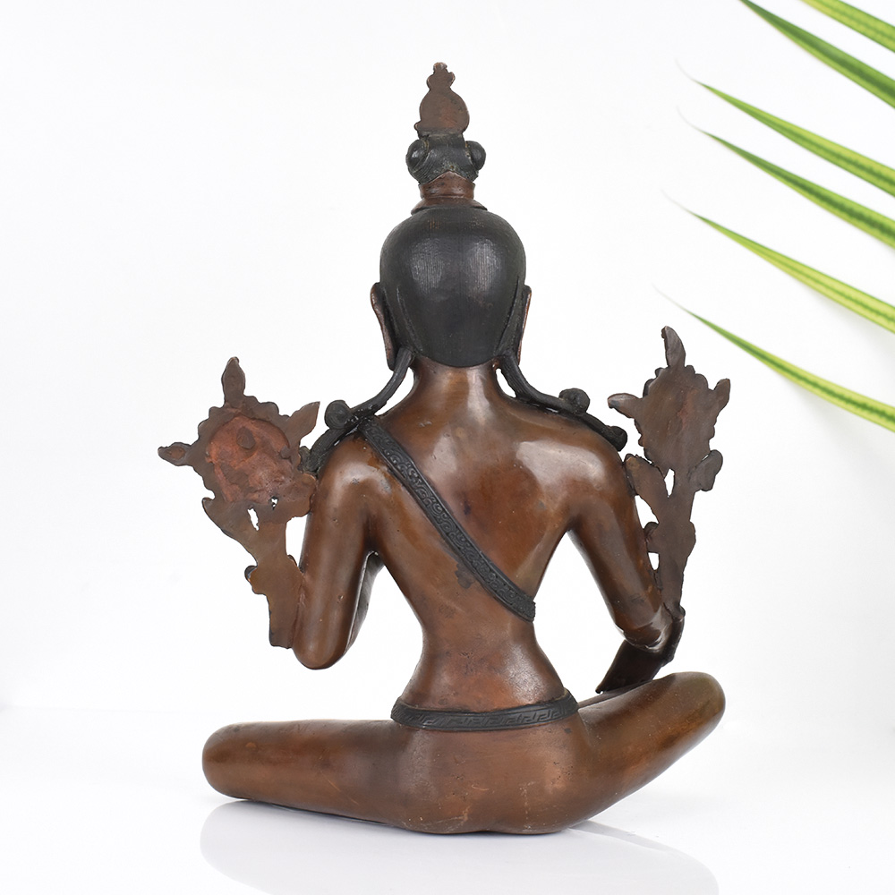 The Goddess Tara is revered throughout the Tibetan Buddhist world as the embodiment of compassion, wisdom, and enlightened activity. This stunning vintage statue captures her serene, benevolent presence, inviting you to cultivate these qualities within yourself. Crafted by Tibetan artisans using time-honored techniques, this statue is a work of profound spiritual significance. The intricate details and elegant pose radiate an aura of tranquility, making it a centerpiece for your personal meditation space or prayer room. Place this statue as a reminder to open your heart, quiet your mind, and connect with the boundless love that Tara represents. Whether you're a seasoned Buddhist practitioner or simply drawn to the beauty of Tibetan art, this Goddess Tara copper statue will infuse your space with a sense of sacred presence. Allow her compassionate gaze to inspire you on your own journey of self-discovery and spiritual growth. Invite the blessings of this revered Bodhisattva into your life and home.