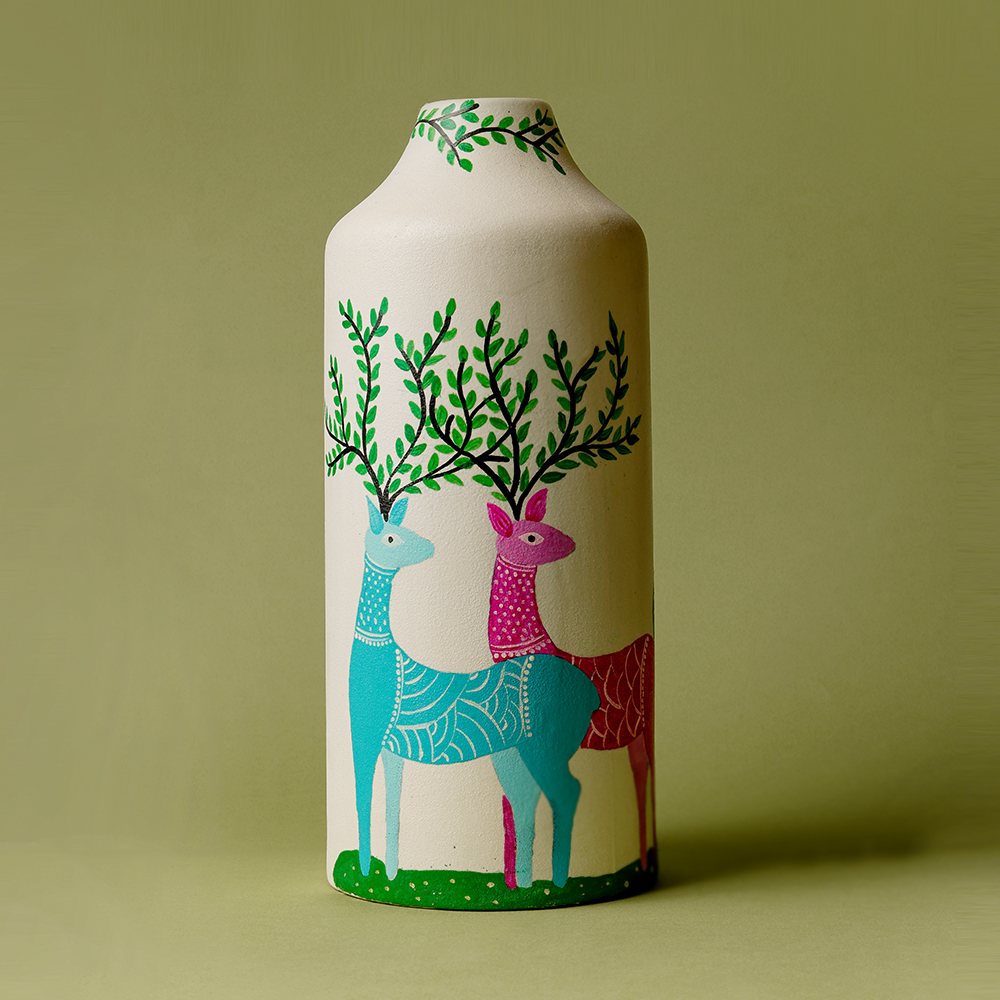 This decorative vase highlights the beauty of Gond art through a stylized depiction of two deer beneath branching tree forms. The expressive lines and vibrant colors reflect the traditional storytelling approach of tribal Indian art where animals and nature symbolize balance and coexistence.