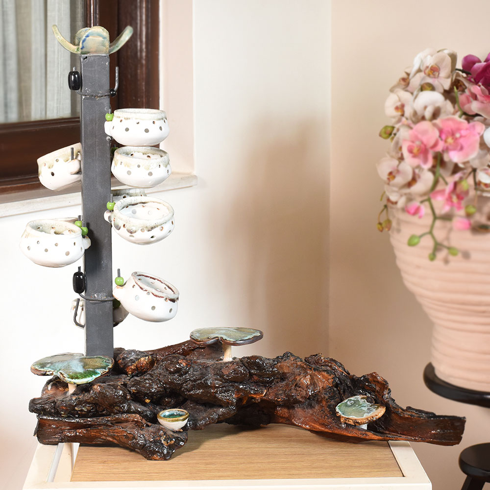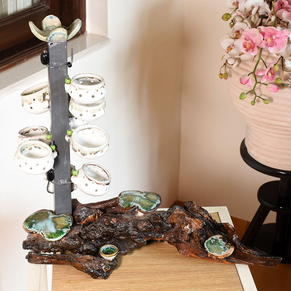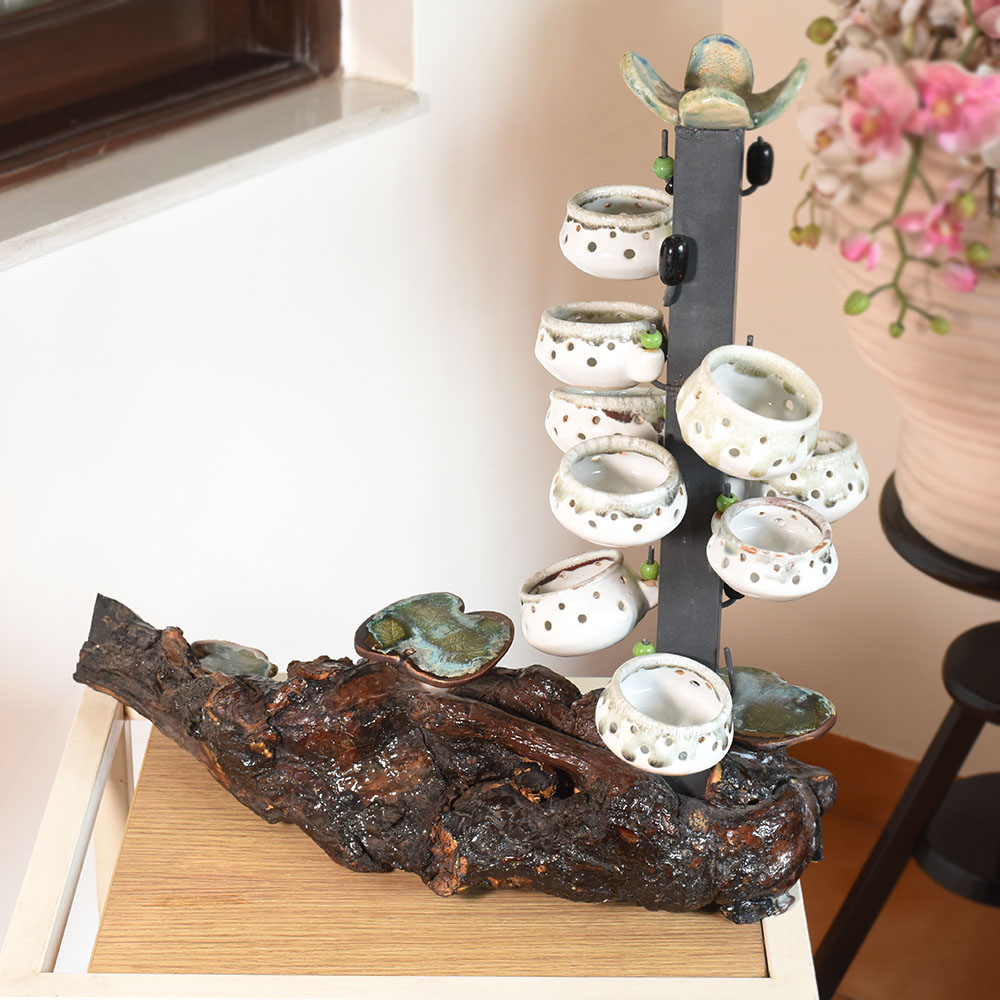 Ceramic Artist Meena Vohra brings her signature artistry to this arrangement of hanging pots. The composition features varied shapes and balanced suspension offering a playful accent for vertical gardens and artful interiors. Each piece is handmade packed and quality checked by Indianshelf. Playful Hanging Pots for Vertical Art These playful hanging pots add vertical interest to any setting. Their sculptural forms and inviting shapes create dynamic focal points perfect for bringing life to window gardens and artistic installations. Set of pots suspended gracefully with balanced forms Entirely hand formed by skilled craftspeople Solid craftsmanship offers reliable long term beauty Specifications and Traditions Origin: India. Safely packed and quality checked by Indianshelf Crafted without any mechanised assistance Enduring ceramic keeps shape and detail intact Use and Display Recommendations Display in kitchens bathrooms or balconies Memorable gesture for engagements or graduations Adds charm to hospitality reception areas Adds authenticity to traditional or heritage events Maintaining Your Hanging Pots Remove dust using a soft brush or cloth. Avoid excessive moisture and handle each pot gently when rearranging. Your Questions Addressed Are the hanging pots sold as a set Yes the sculpture includes multiple pots arranged together to create a cohesive look. Can plants be placed inside These pots are decorative and light plants or dried stems may be used carefully without adding water. How should I install them Secure the hanging structure to a sturdy support and handle gently when adjusting. Are the pots identical Each pot is hand shaped so slight variations in form and size add to their charm. Supporting Traditional Craft The design showcases cultural heritage and fine craftsmanship. Artisans manually create each piece giving it singular personality.