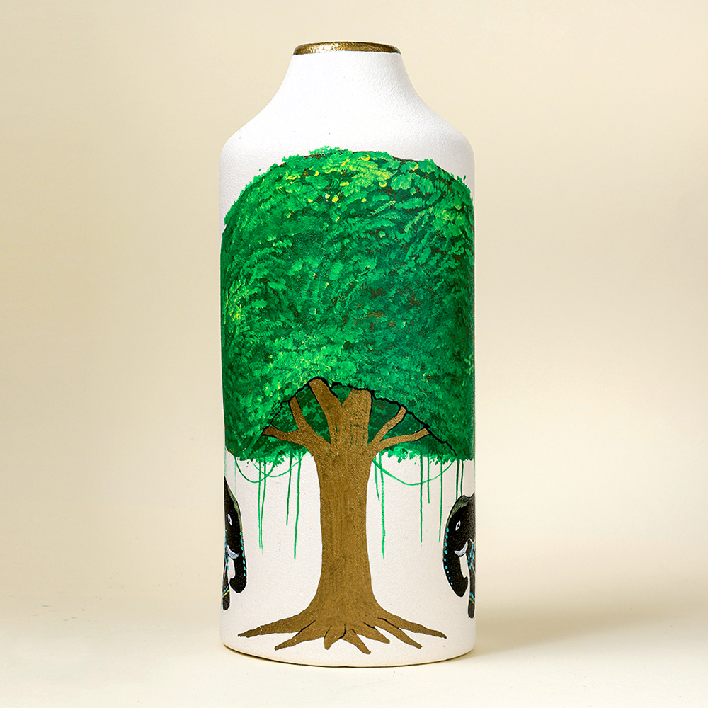 This decorative vase captures the storytelling spirit of Phad folk art through the depiction of a flourishing green tree accompanied by elephants. The composition reflects themes of nature harmony and traditional narrative painting found in Rajasthans heritage art.