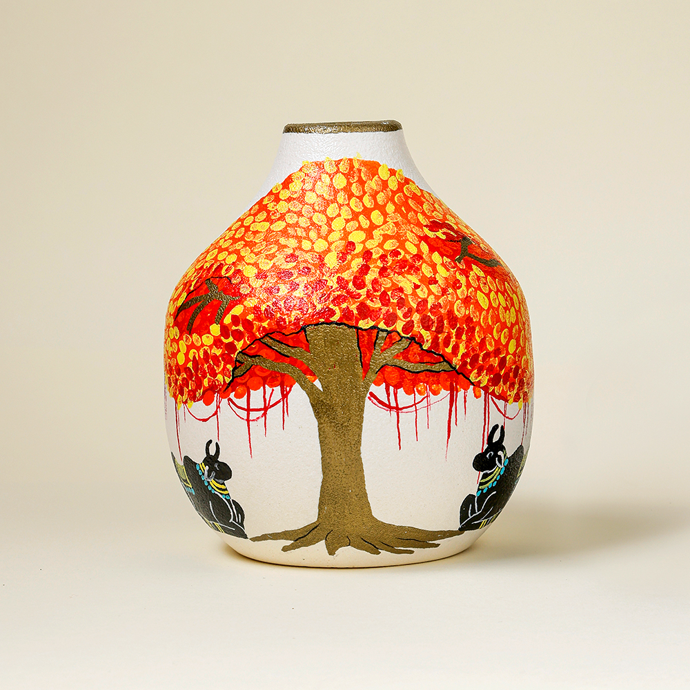 This decorative vase reflects the storytelling beauty of Phad folk painting through the depiction of a glowing orange tree accompanied by resting cows. The bold colors and expressive motifs highlight the narrative tradition of Rajasthans classical folk art.