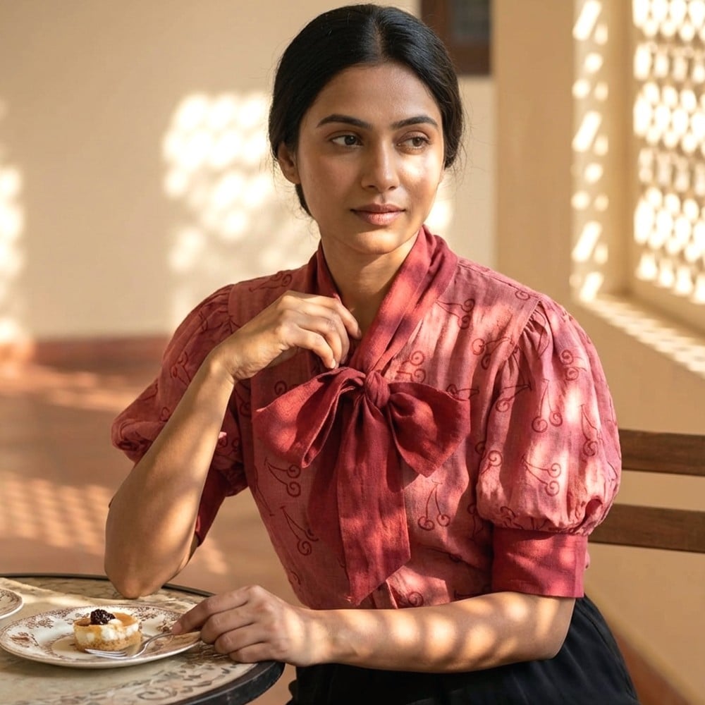 This handcrafted cherry knot top with puff sleeves is designed to bring a playful yet elegant charm to your everyday wardrobe. Featuring an all-over cherry print and a statement bow tie neckline, it creates a standout look that feels both chic and effortless.