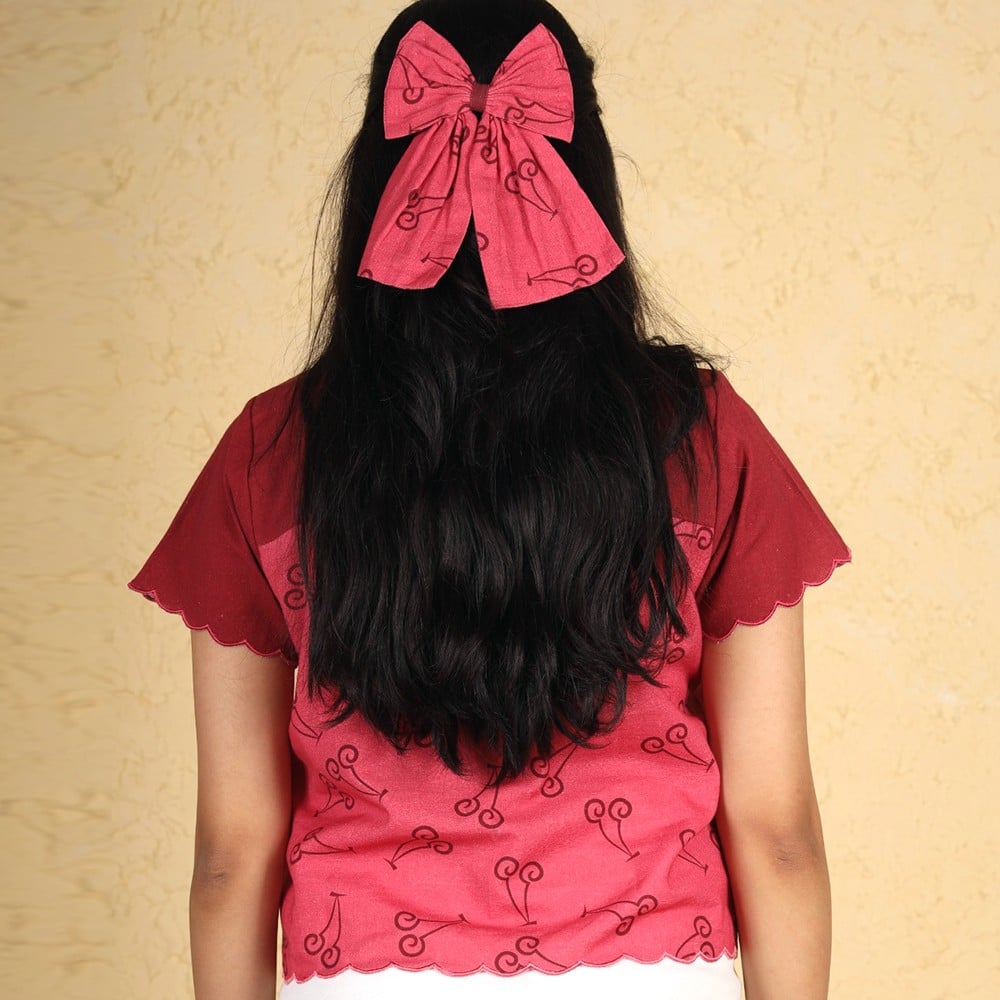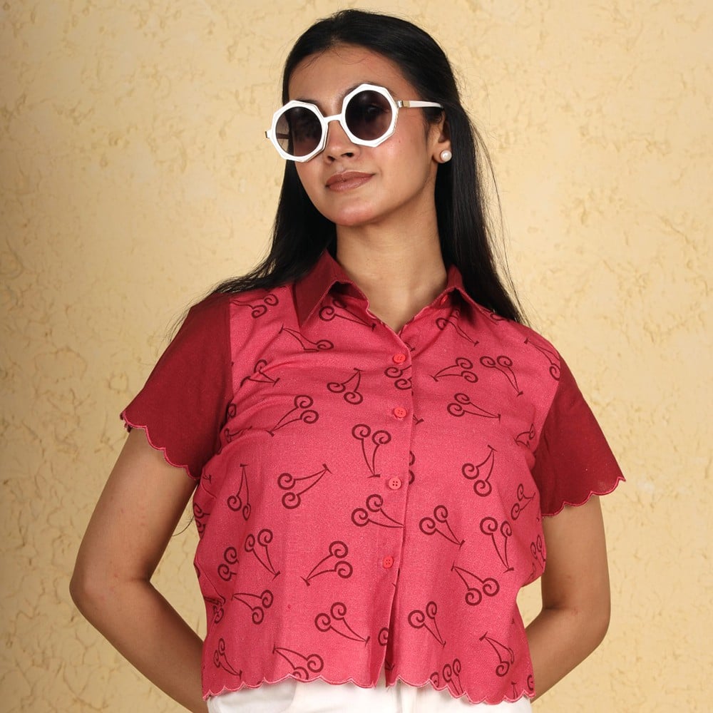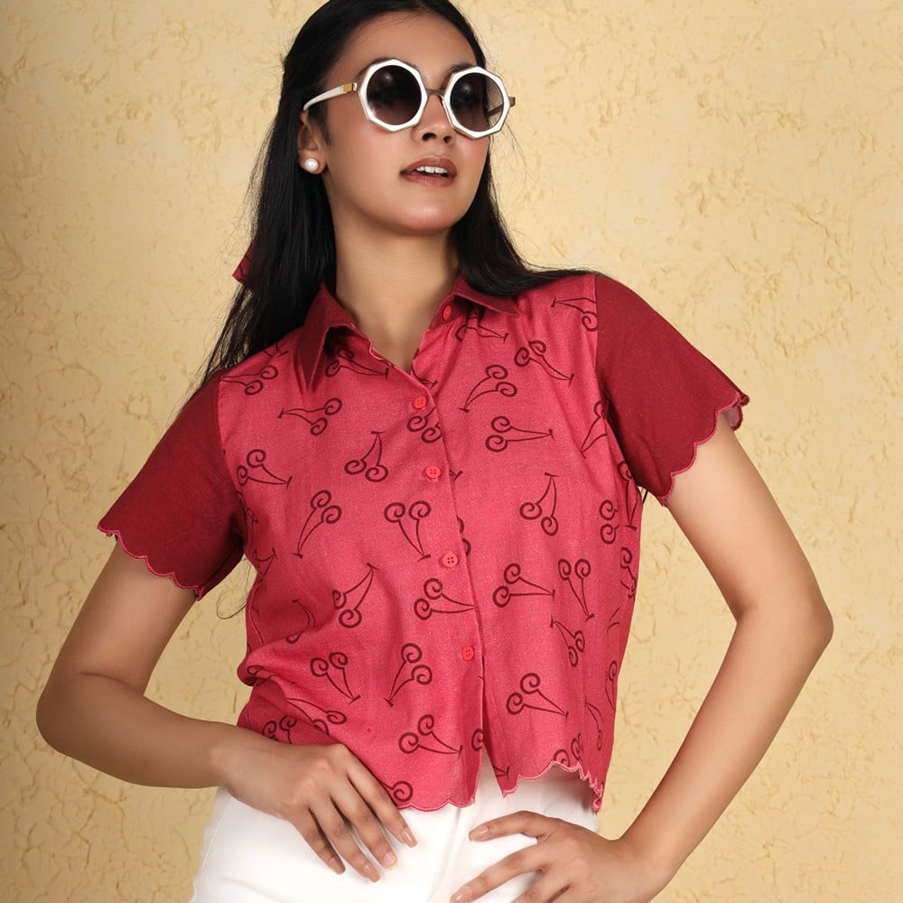 This handcrafted cherry top with scallop hems is designed to bring playful charm and effortless style to your wardrobe. Inspired by vibrant cherry motifs, it blends retro aesthetics with a modern cropped silhouette.