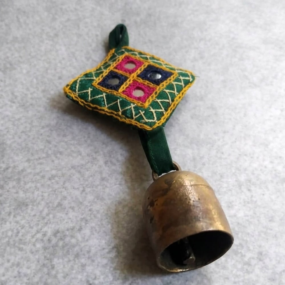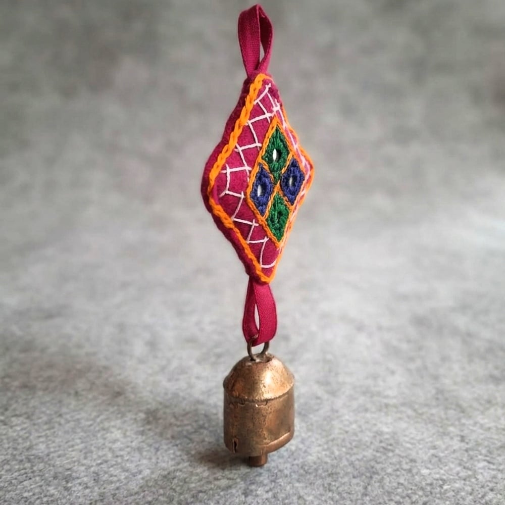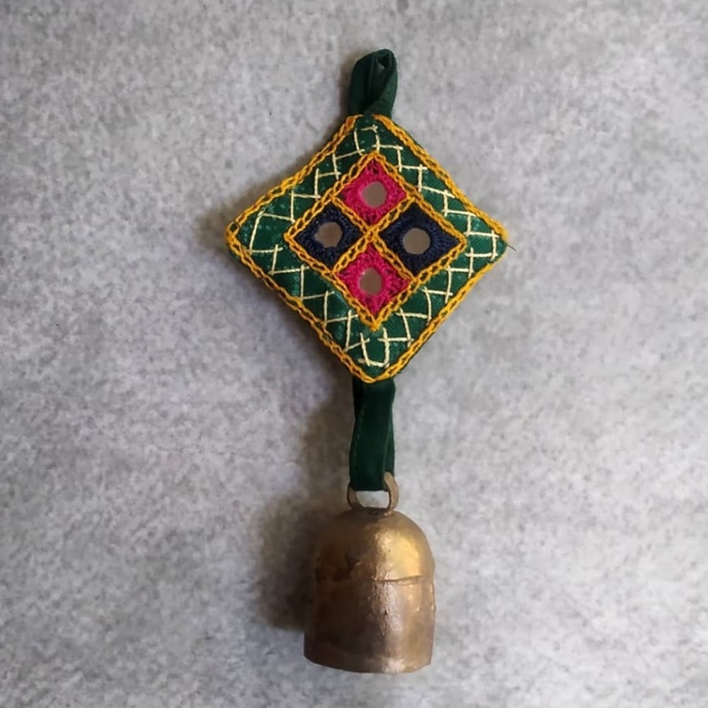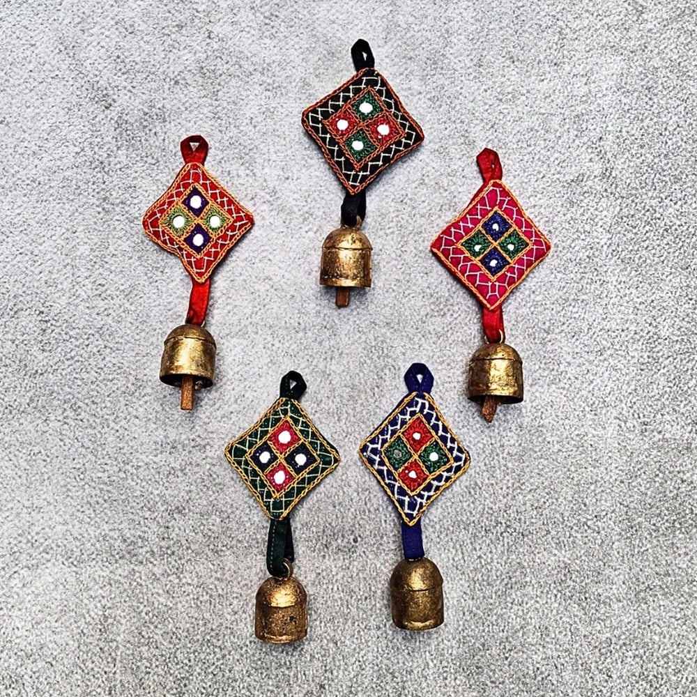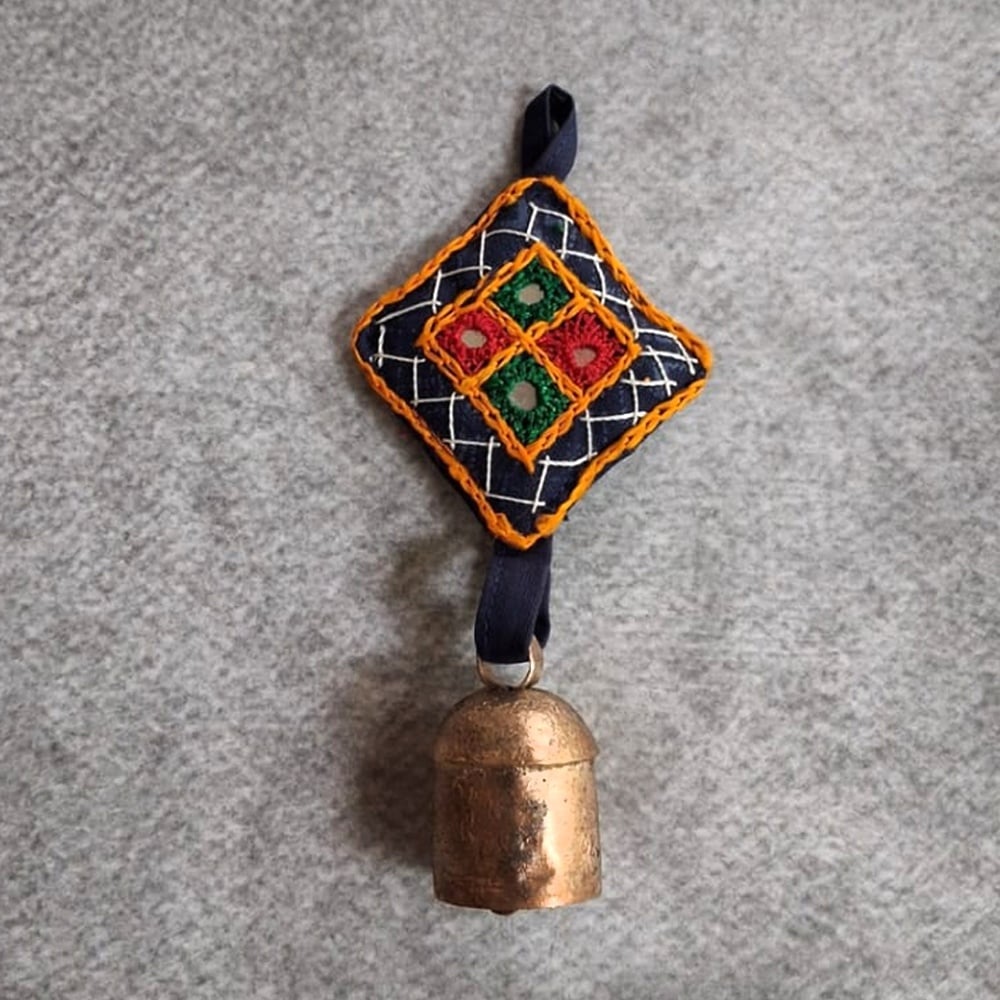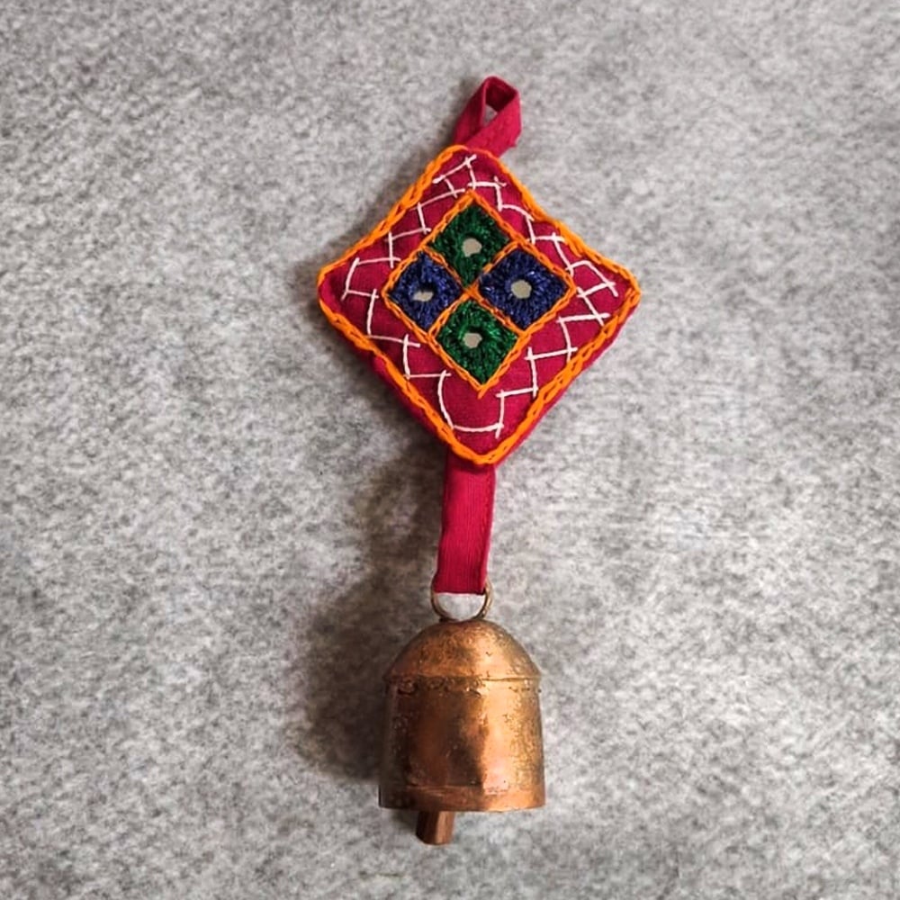 This handcrafted copper bell charms set features vibrant embroidered fabric motifs paired with rustic metal bells, creating a beautiful fusion of color and sound. Designed to enhance festive and everyday dcor, these hanging charms bring a traditional Indian aesthetic with a lively and artistic touch.