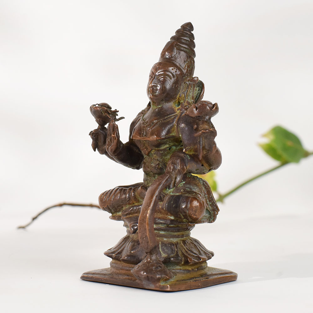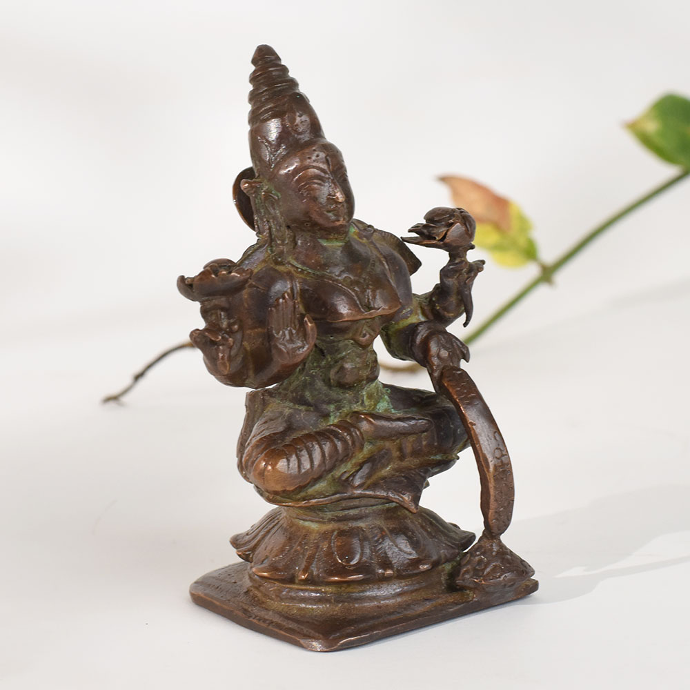 Bring timeless divinity into your home with this handcrafted vintage copper goddess Rajarajeshvaristatue, beautifully detailed and rich with old-world charm. Made using traditional metal-craft techniques, the sculpture reflects the serene grace and spiritual symbolism associated with feminine divine energy. Its aged copper patina, subtle texture variations, and artisanal imperfections make it a meaningful decor piece for those who appreciate heritage art, sacred collectibles, and Indian spiritual decor. Perfect for meditation spaces, home altars, study tables, spiritual corners, and gifting, this statue carries an authentic vintage appeal that enhances any environment with a sense of peace and cultural depth. Whether youre a collector of antique-style idols or someone seeking a soulful decor element, this handcrafted copper figure brings warmth, reverence, and artistic value to your space.