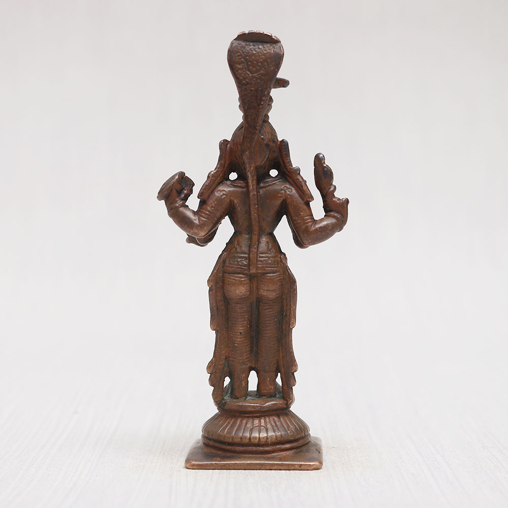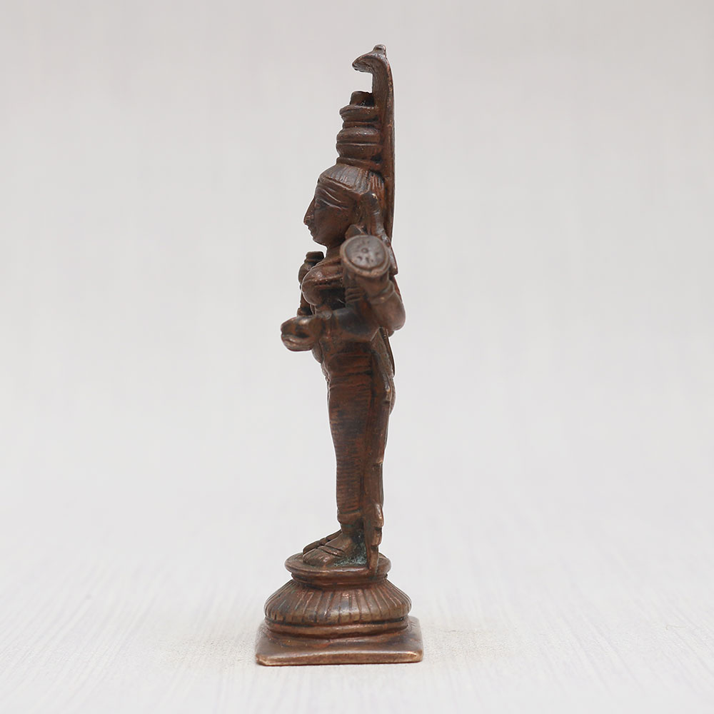 Embrace the divine presence with the exquisite Hindu Goddess Maa Mariamman Copper Statue, a masterpiece crafted by highly talented Indian artisans. Standing gracefully on a platform, this statue radiates spiritual energy, meticulously handmade from high-quality copper with a vintage-style finish. Perfect for your prayer room at home, office, restaurant, cafe, or shop, its eye-catching detailing adds a touch of elegance and charm to any space. This captivating copper statue serves as an ideal showpiece for exhibitions, decorations, and collections, showcasing the finest artistry. Celebrate special occasions by gifting this divine creation to your loved ones, making it an auspicious and unforgettable present. Step into the realm of divine beauty and culture as you explore the finest Hindu god statues to buy on our website.