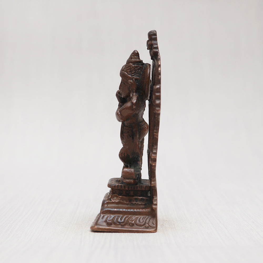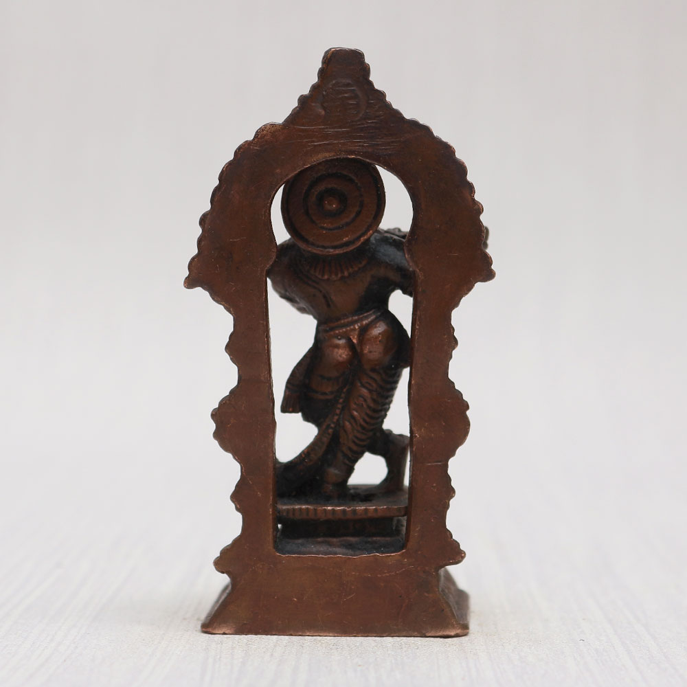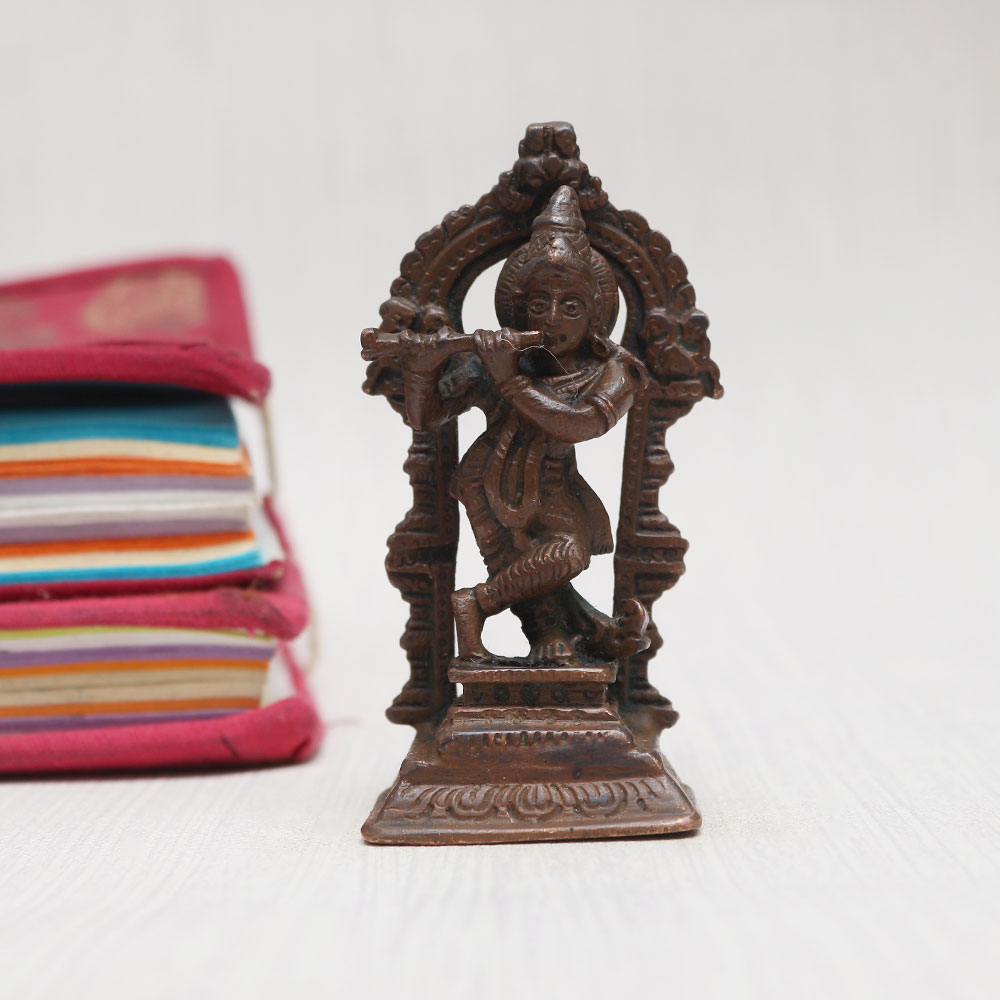 The Copper Krishna Statue is a magnificent portrayal of Lord Krishna standing gracefully on a platform, enchanting all with his divine music as he plays the flute with his legs crossed. Handcrafted by highly skilled Indian artisans using high-quality copper, this masterpiece captures the essence of Lord Krishna's enchanting persona. With a vintage-style finish, this Copper Krishna Statue exudes timeless charm and is the ideal addition to your prayer room at home, office, restaurant, cafe, or shop. The remarkable craftsmanship and eye-catching detailing make it a perfect item for exhibition, decoration, and collection, inviting admiration from all who lay eyes on it. This beautiful deity is not only a work of art but also a symbol of devotion, making it suitable for worship in temples or personal altars. Its versatility knows no bounds, as it makes for a thoughtful gift to your loved ones on special, festive, or auspicious occasions, conveying blessings and good wishes.