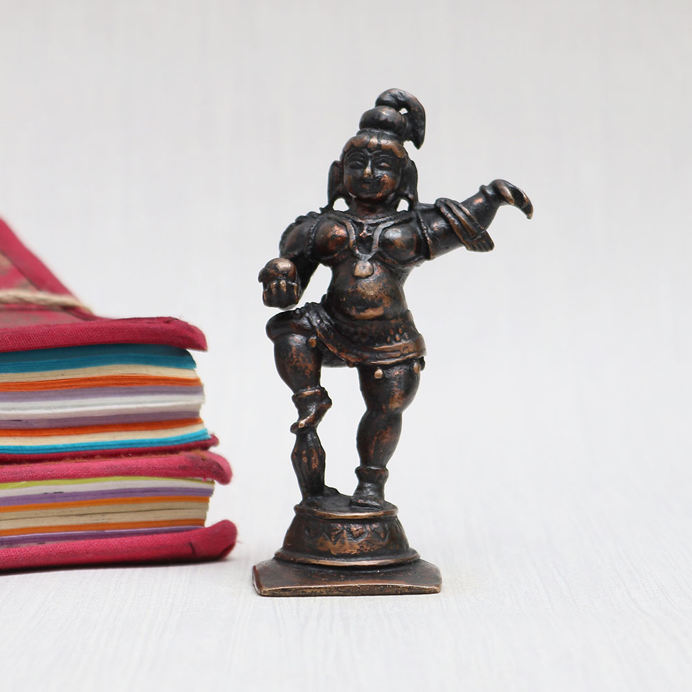 Experience the divine presence of Lord Krishna with this Copper Krishna Statue, crafted by highly skilled and experienced Indian artisans. Made from high-quality copper, this standing statue showcases intricate detailing and boasts a vintage-style finish, adding a touch of elegance to any space. Whether it's your prayer room at home, office, restaurant, cafe, or shop, this statue serves as an ideal centerpiece, attracting attention with its eye-catching design. It's not only perfect for exhibitions and decorations but also a collector's delight. This statue holds a sacred significance and can be reverently placed in a temple for worship. Moreover, it makes a thoughtful gift for your family, friends or relatives on special, festive, or auspicious occasions, symbolizing your blessings and love.