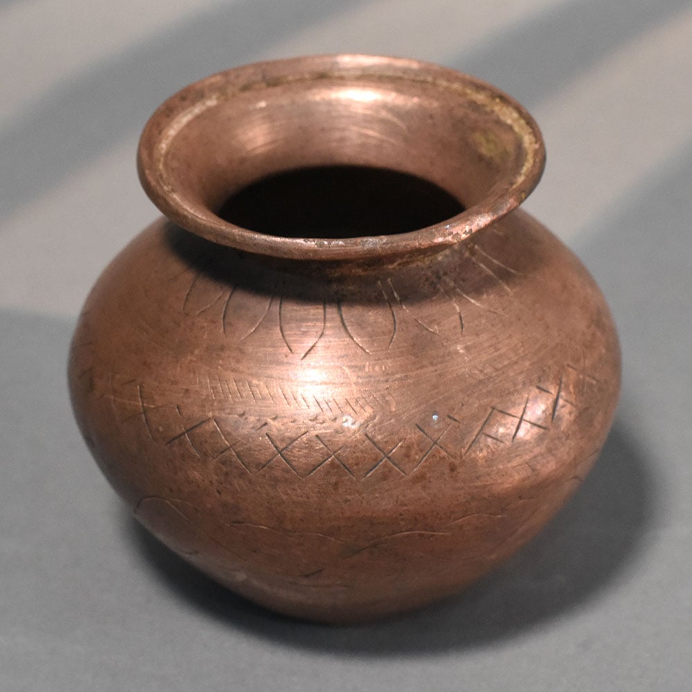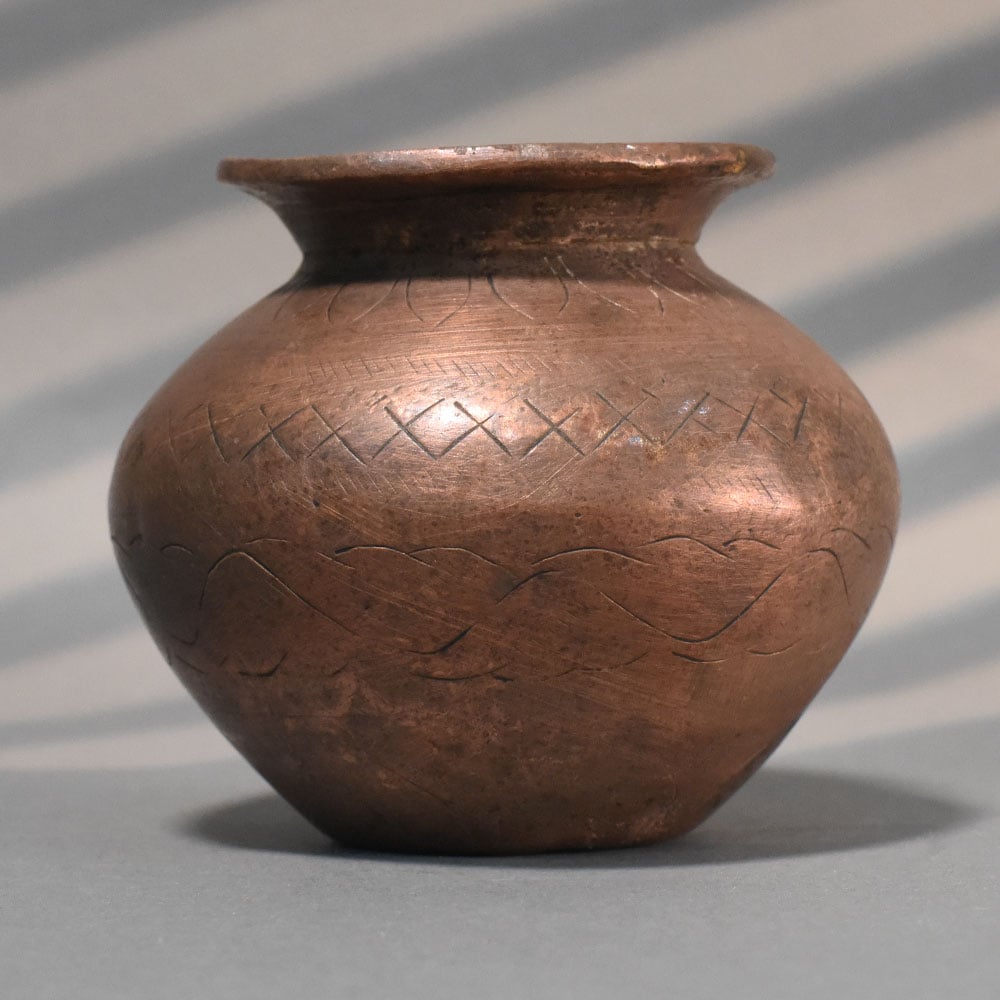 This handcrafted copper vintage finish traditional pooja kalash reflects the essence of timeless Indian ritualware, shaped with a rounded body and a gently flared neck for practical and ceremonial use. Its compact form and balanced proportions make it an essential piece for spiritual setups and traditional decor. Crafted from pure copper, the surface displays a warm, earthy tone with a naturally aged finish. The subtle hand-etched patterns and light textural marks add depth and authenticity, showcasing the manual craftsmanship behind the piece. Each curve and engraving carries slight variations, ensuring no two pieces are identical. Copper has long been valued in Indian culture for its purifying and health-related properties, especially in ritual use. This kalash is ideal for holding water, flowers, or sacred offerings during pooja, havan, and festive ceremonies. Its wide mouth allows easy access, while the sturdy base ensures stability during use. Beyond rituals, this copper vessel doubles as a decor element, bringing a rustic, heritage-inspired charm to interiors. Whether placed in a temple corner, on a console, or used as a decorative accent, it enhances the space with its traditional character and warm metallic glow. Perfect for daily spiritual practices, gifting, or collectors of authentic handcrafted objects, this kalash combines function, symbolism, and enduring craftsmanship.