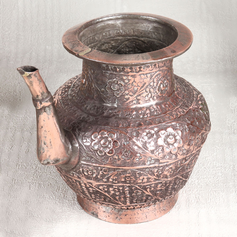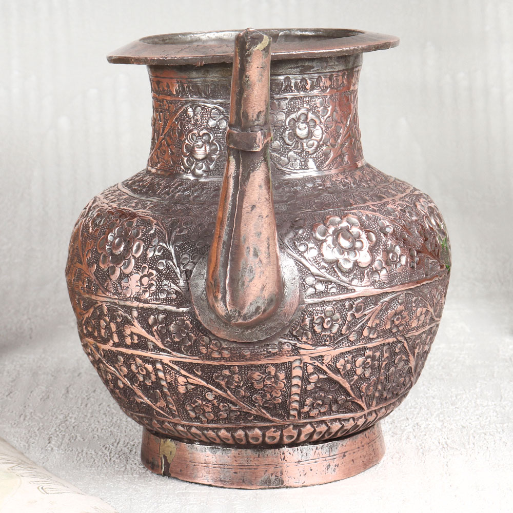 This Vintage Copper Water Pot with Spout is a true masterpiece of craftsmanship and artistry. This stunning piece boasts an antique brown finish that exudes timeless elegance, making it a captivating addition to any space. Its surface is adorned with intricate engraved designs, each a testament to the skill and dedication of Indian craftsmen from Hyderabad, renowned for their mastery of Islamic Art. Handcrafted with meticulous attention to detail, this water pot is a symbol of tradition and heritage. Made from high-quality copper, it not only serves as a striking decorative piece but also holds great significance in religious and spiritual contexts. Whether placed in a home, office, restaurant, hotel, or cafe's prayer room, it emanates an aura of reverence and aesthetic charm. For those seeking vintage collectibles or planning to exhibit their treasures, this copper water pot is a must-have. Its uniqueness and historical allure will undoubtedly captivate the hearts of enthusiasts and collectors alike. Furthermore, it makes for a thoughtful and meaningful gift for your family, friends or relatives on special, festive, or auspicious occasions.