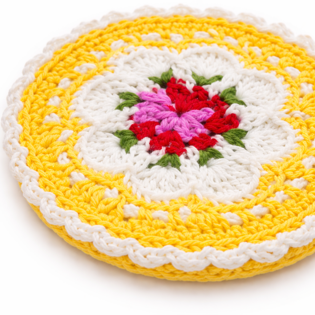 This handcrafted crochet doily coaster is made using soft cotton yarn and features a vibrant yellow outer crochet pattern with a decorative floral center design. The colorful flower motif combined with delicate crochet detailing creates a charming handmade table accessory. Both decorative and practical, this cotton yarn doily coaster protects table surfaces from heat, stains, and moisture while enhancing everyday table settings. Product Features Handcrafted crochet doily made from cotton yarn Decorative floral center crochet design Bright yellow outer crochet pattern with white border Helps protect tables from heat, stains, and cup marks Lightweight handmade table dcor accessory Material and Craft Material: Cotton yarn Technique: Hand crocheted Shape: Round Design: Floral crochet doily pattern Finish: Soft handcrafted cotton weave Ideal Uses Coffee mug and tea cup coaster Decorative doily for trays and table centerpieces Accent mat for dining tables and coffee tables Handmade dcor accessory for kitchen or living spaces Care Instructions Hand wash gently with mild detergent and allow it to air dry flat to maintain the crochet pattern and cotton yarn quality. Frequently Asked Questions What material is used in this crochet doily coaster? This coaster is handcrafted using high quality cotton yarn. Can it be used as a coaster for hot drinks? Yes, it works well as a coaster for tea cups, coffee mugs, and glasses. Are handmade crochet pieces identical? No. Since every piece is handmade, slight variations may occur, making each item unique.