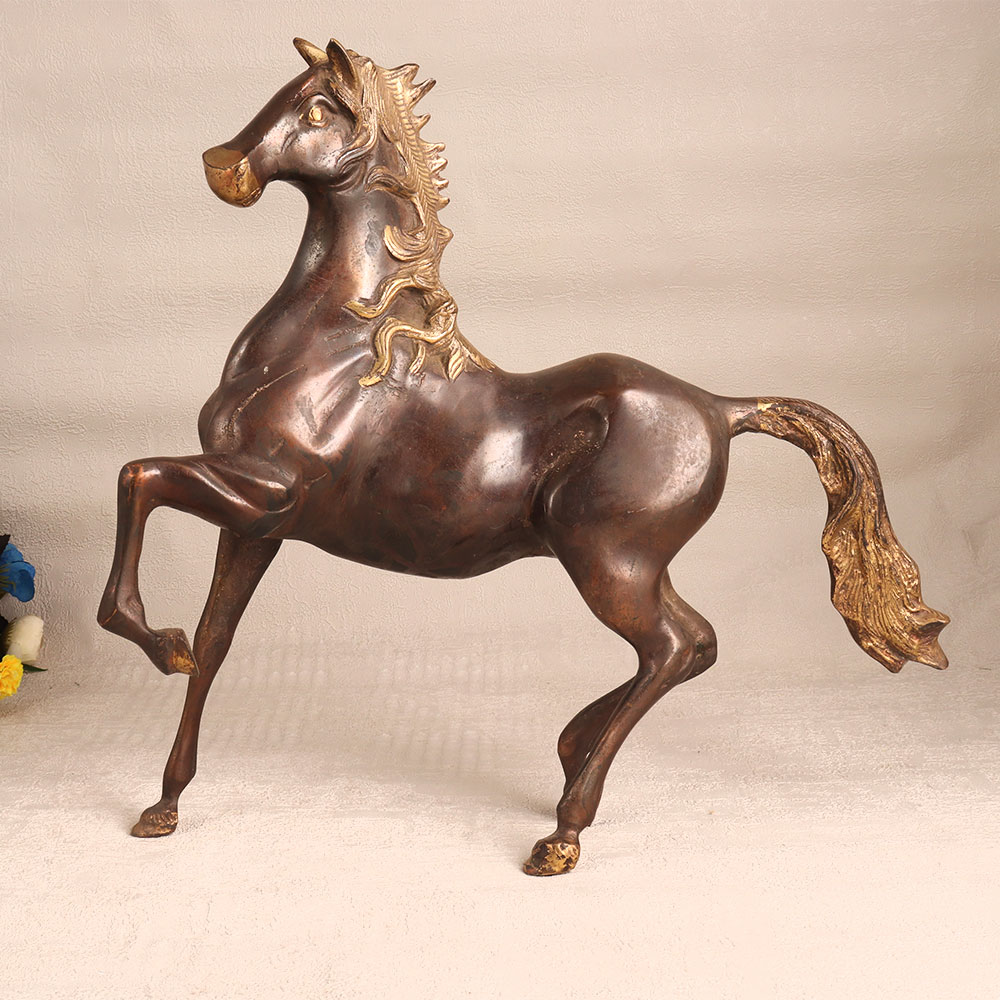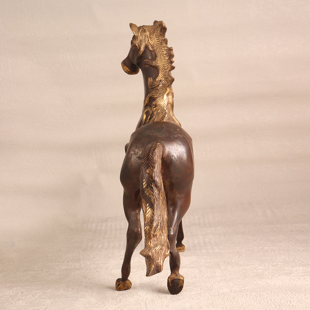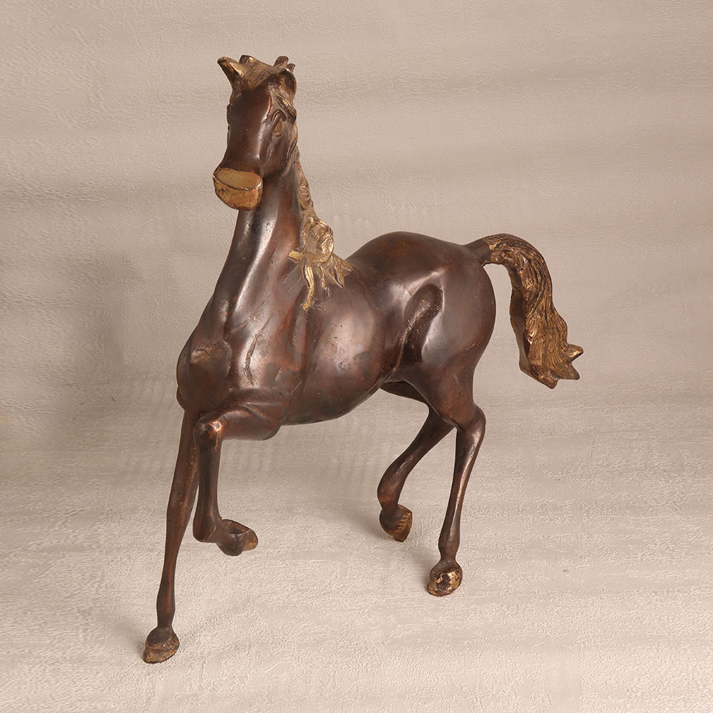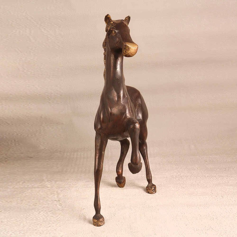 A brass statue of a regal horse that is crafted by skilled artisans in the European Art tradition. This piece boasts a lustrous antique brown finish that exudes a timeless charm, making it a stunning addition to any setting. Standing proudly on its pedestal, this handcrafted masterpiece showcases the unparalleled craftsmanship of its creators. The use of high-quality brass not only ensures its enduring beauty but also captures the fine details of the horse's form, from its majestic mane to the delicate curves of its muscles. Versatile and alluring, this brass horse statue can grace your home, office, hotel, cafe, shop, or restaurant, enhancing the ambiance with its classic allure. Whether you're a connoisseur of vintage collections or an aspiring curator, this masterpiece can be a focal point of your exhibition. Furthermore, it makes for an exceptional gift, perfect for expressing love and best wishes on special, festive, or auspicious occasions.