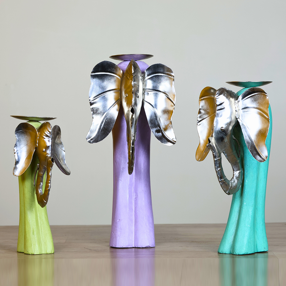 This set contains three candle holders in complementary pastel colours, each with a metal elephant face.