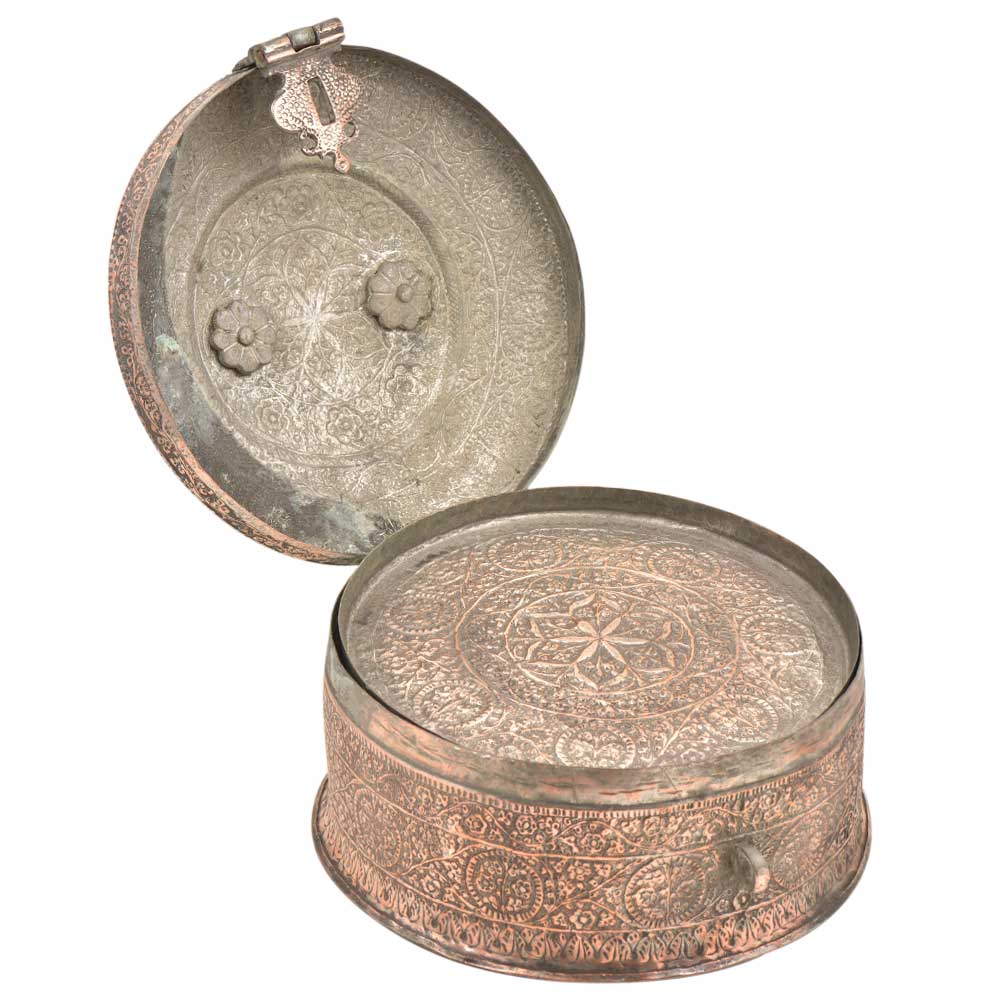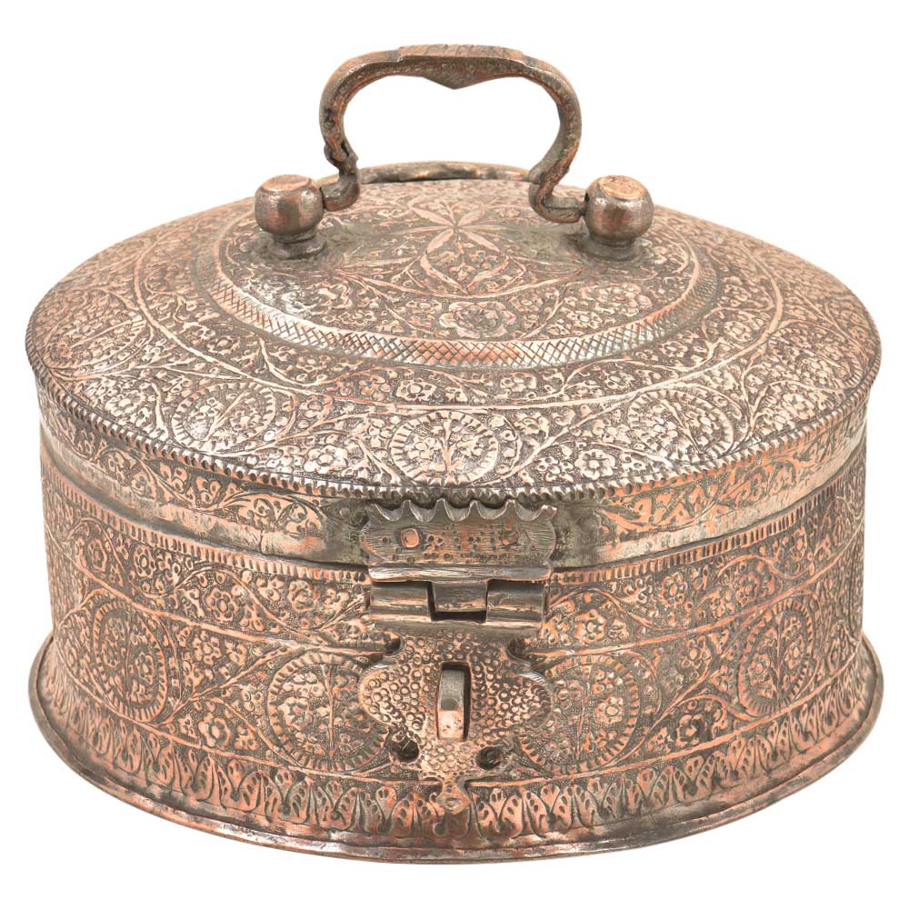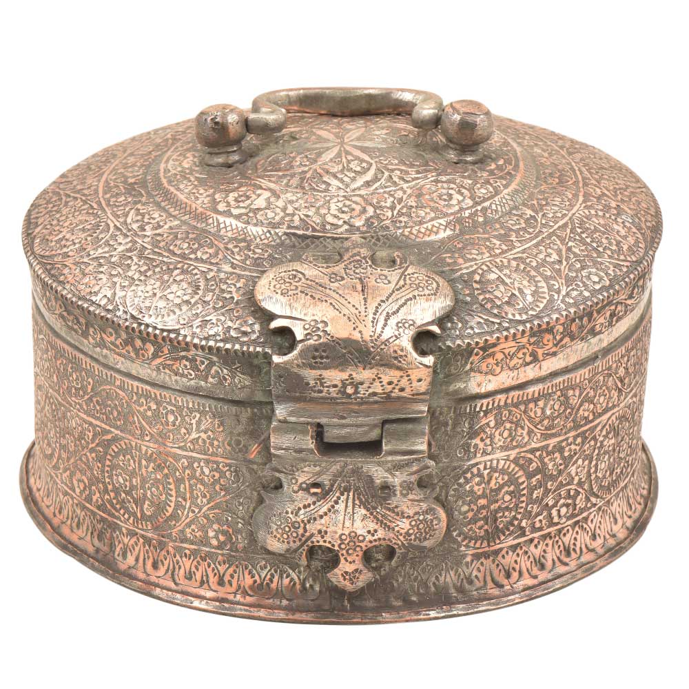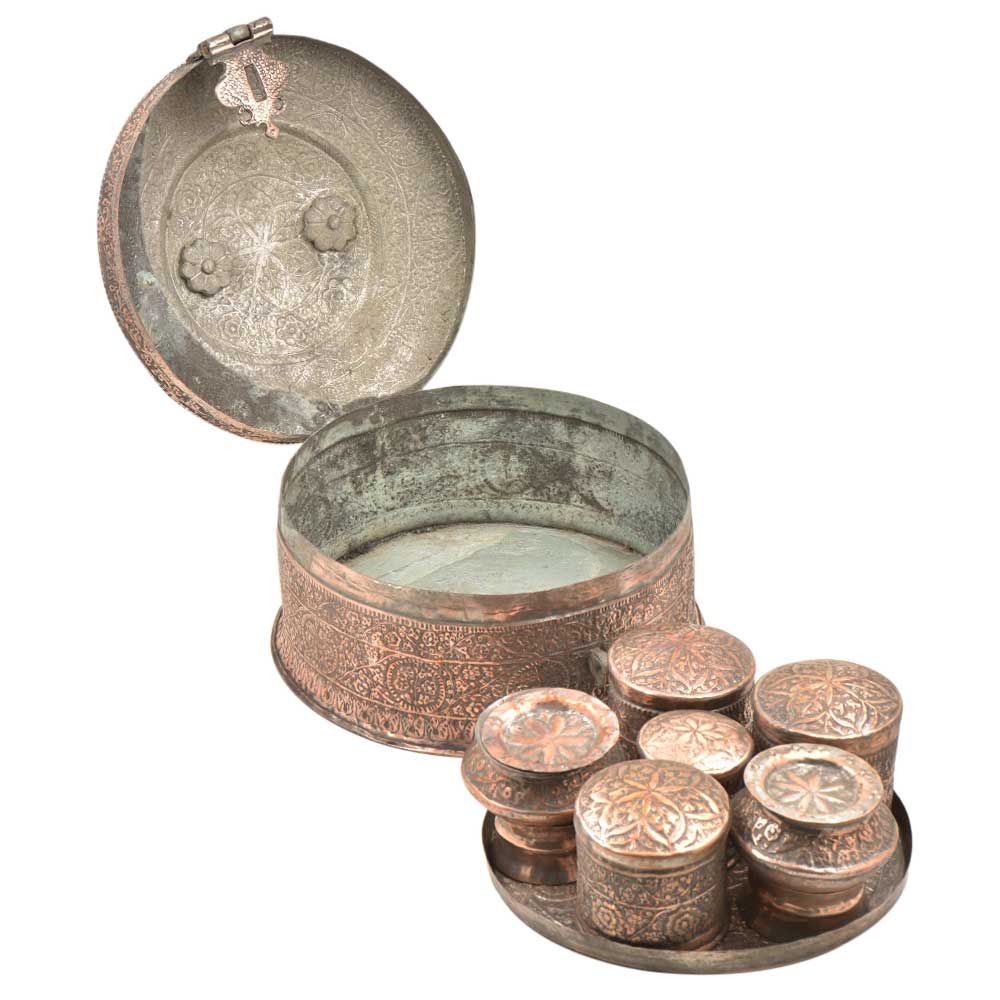 Hand Embossed Copper Betel Nut Pandan Box – with hand hammered floral and incised decoration used to store betel leaf, lime, tobacco and the nut from the areca palm. The practice of chewing betel nut was popular all over Asia and is still a common practice in Myanmar and India. This Pandan betel nut box contains six small pots, each incised on the tops and sides with the same design and metal.