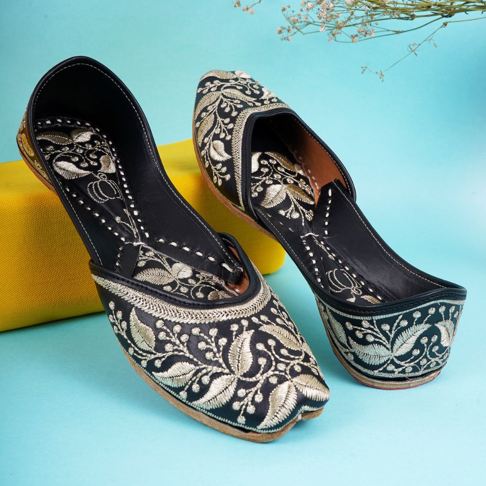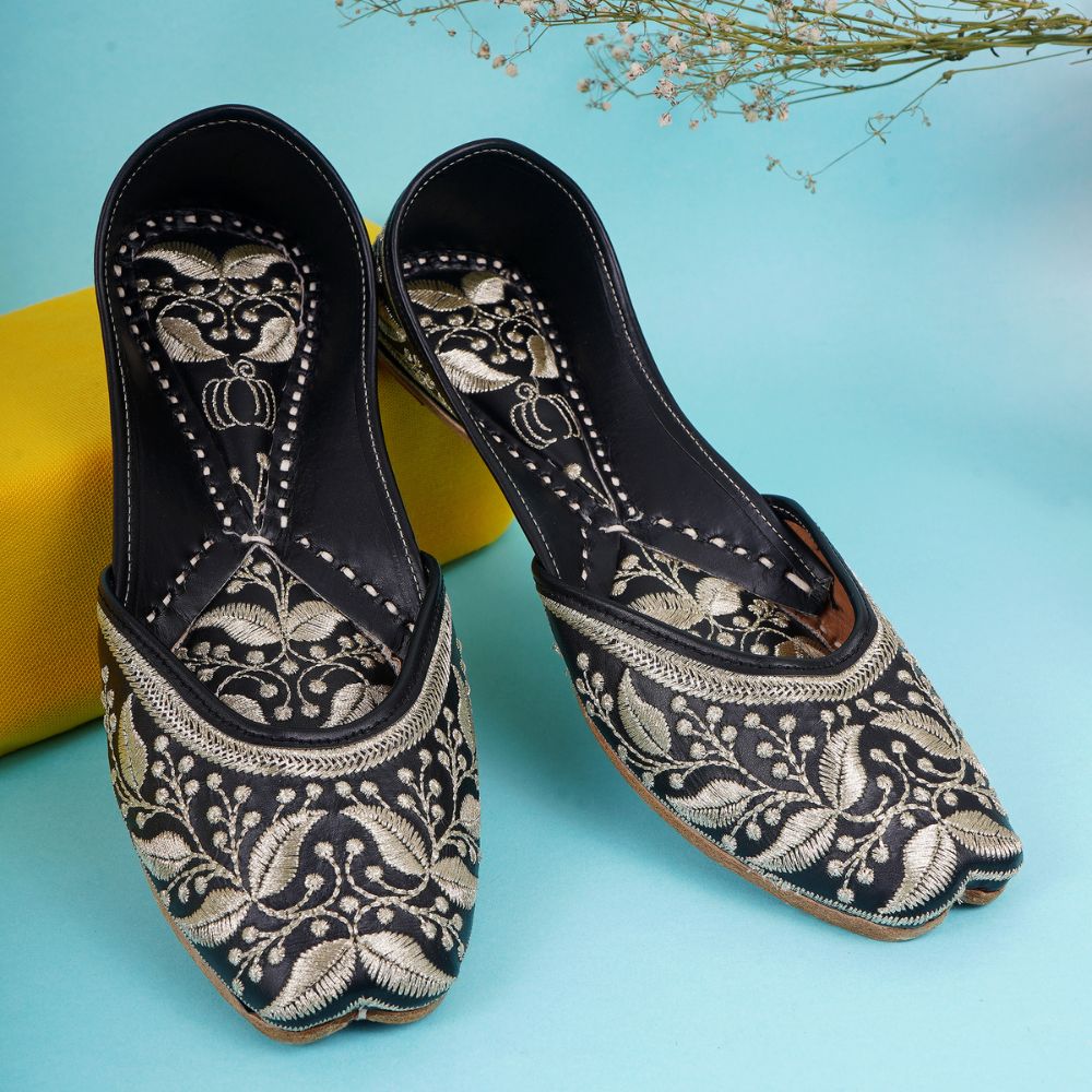 This jutti unites embroidered design with golden, embroidered, rexin, leather craftsmanship in a black, beige palette. Created for gifters, it enhances personal style or makes a memorable gift. Packed and quality checked by Indianshelf. Each piece is uniquely crafted by skilled artisans.