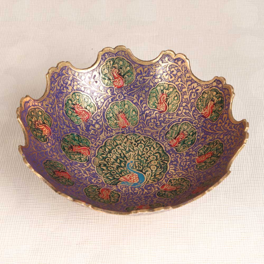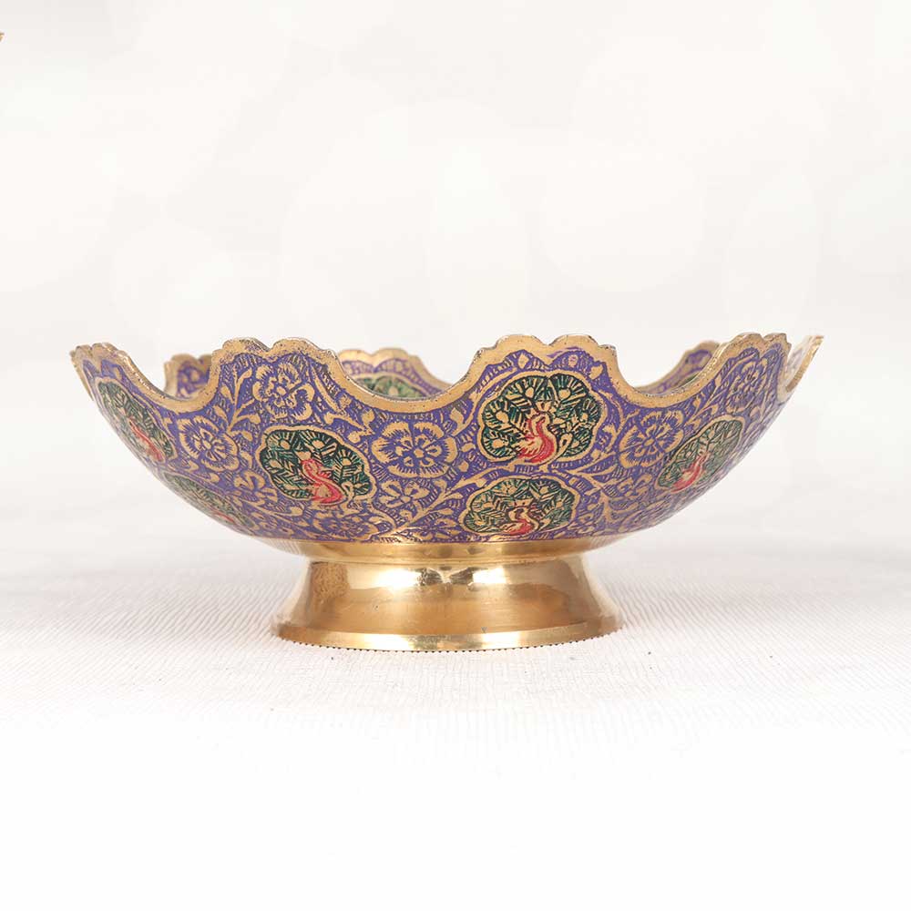 Make a statement with the exotic Jaipur Brass Peacock Fruit Bowl. This handcrafted brass bowl features a regal peacock design with pops of colorful enamel. This bowl becomes the centerpiece of any table. The enamel detailing pops against the brass base like a peacock showing its plumes. Display fruits, decor items or leave empty to showcase the intricate carvings. This bowl is sure to mesmerize your guests. Those wanting to add an exotic flair to their home decor will love this piece. Jaipur artisans specially designed it to showcase their traditional techniques like enameling and brass carving. Let this bowl infuse your home with the essence of India. Guests will be eager to know the story behind this exotic piece and its expert craftsmanship.